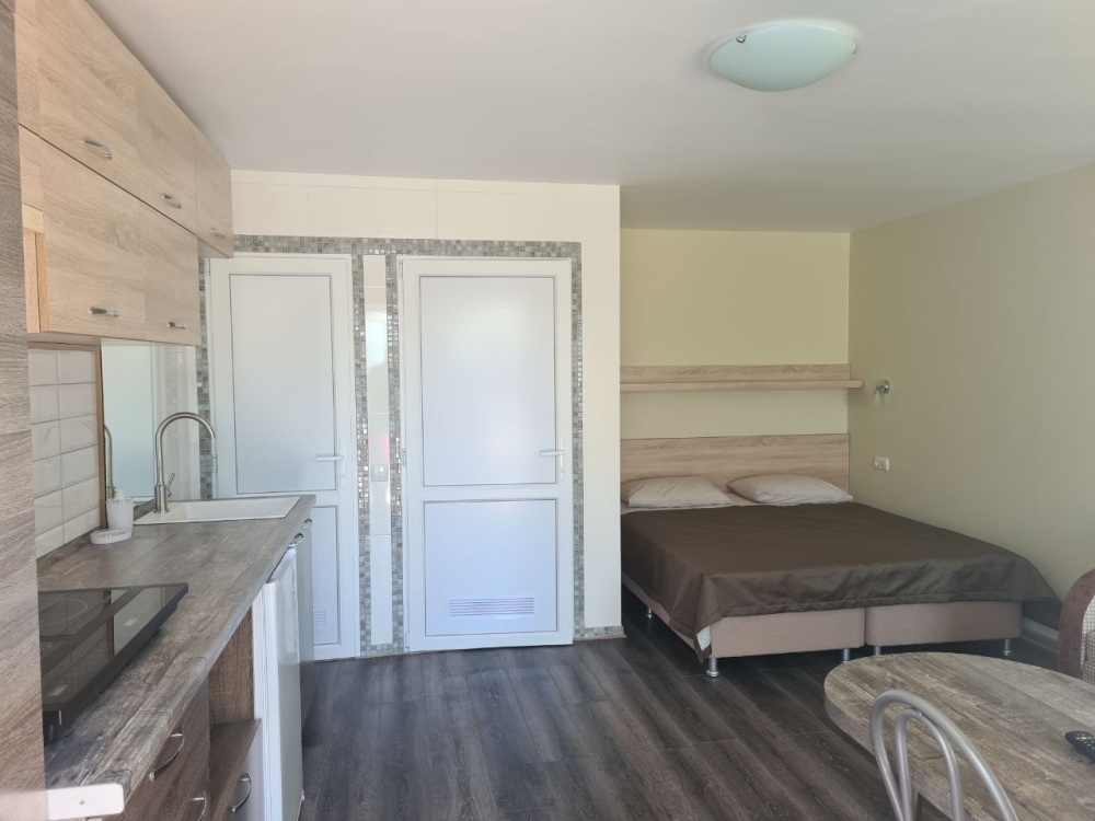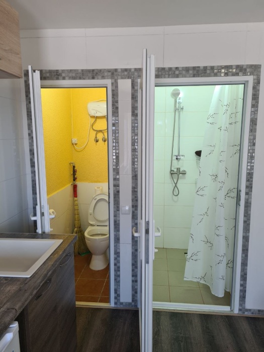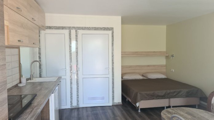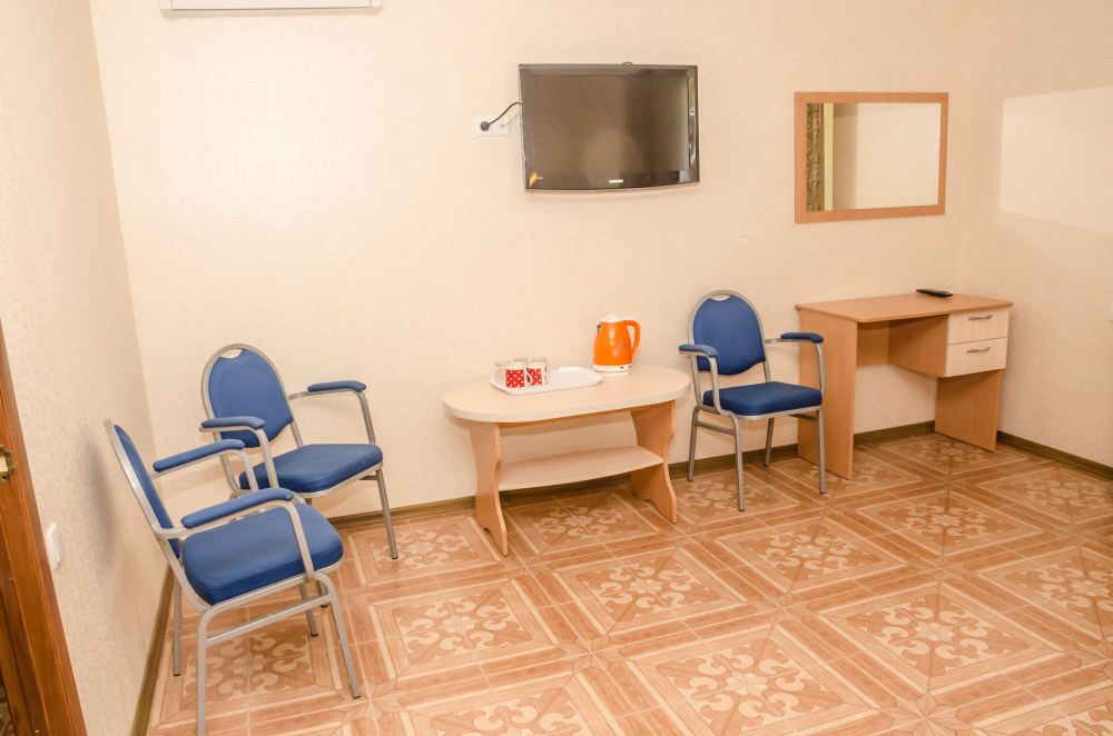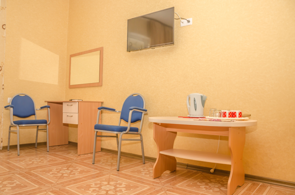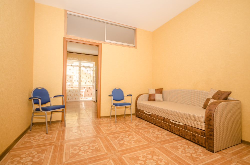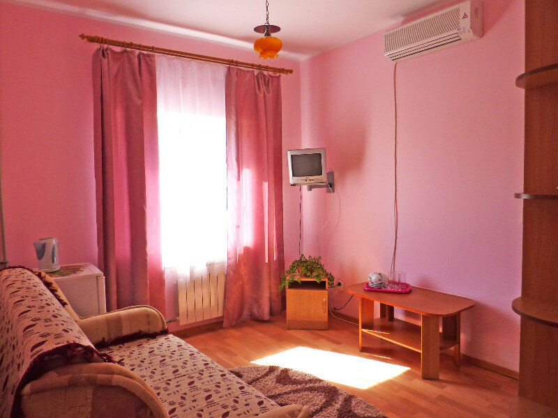 Двухкомнатный номер площадью 26 кв м , раздельными гостиной и спальней. В номере сунузел с душем. Телевизор, кондиционер, холодильник, шкаф , журнальный столик , 2х спальная кровать. В гостиной раскладной диван на 2 чел.
