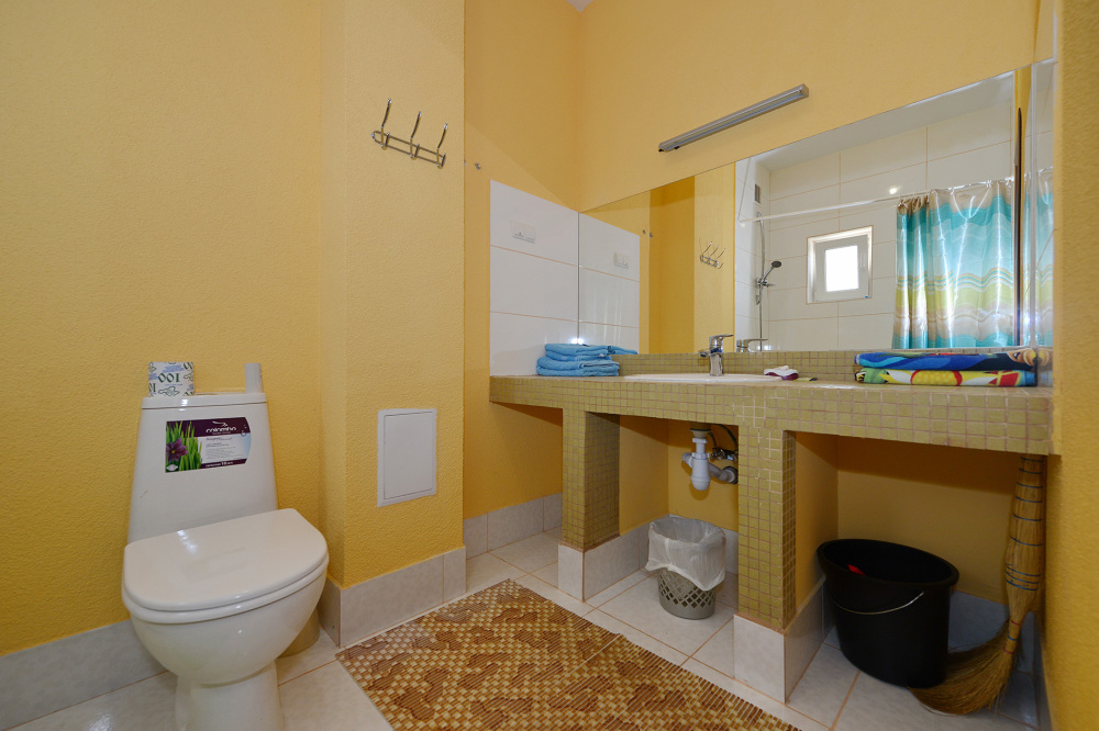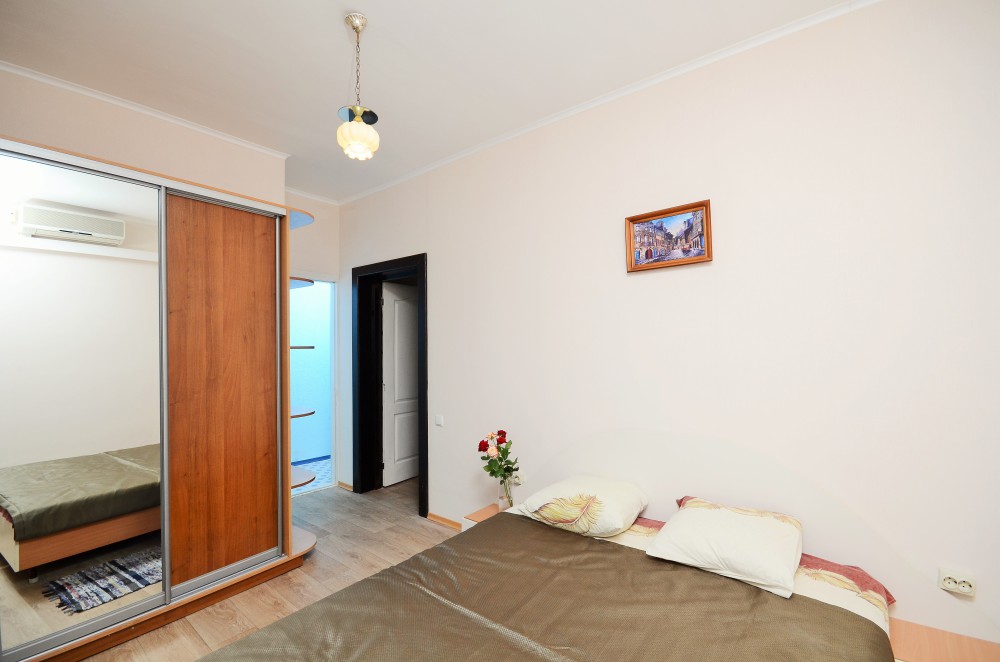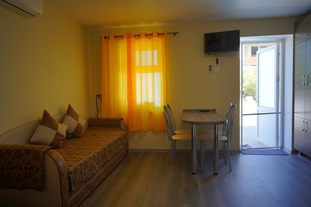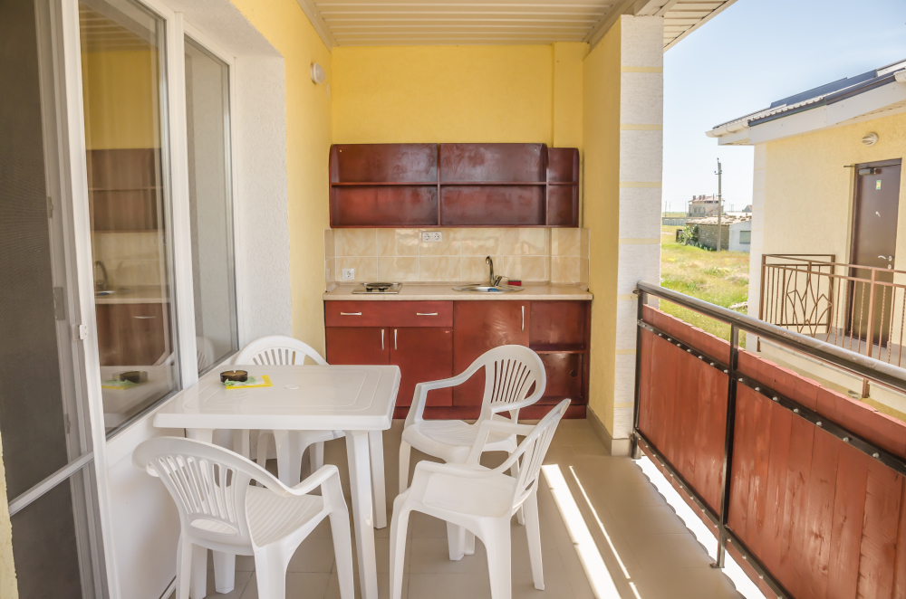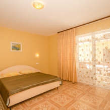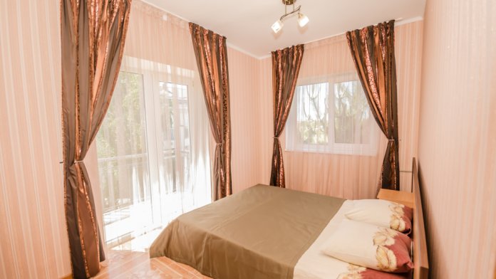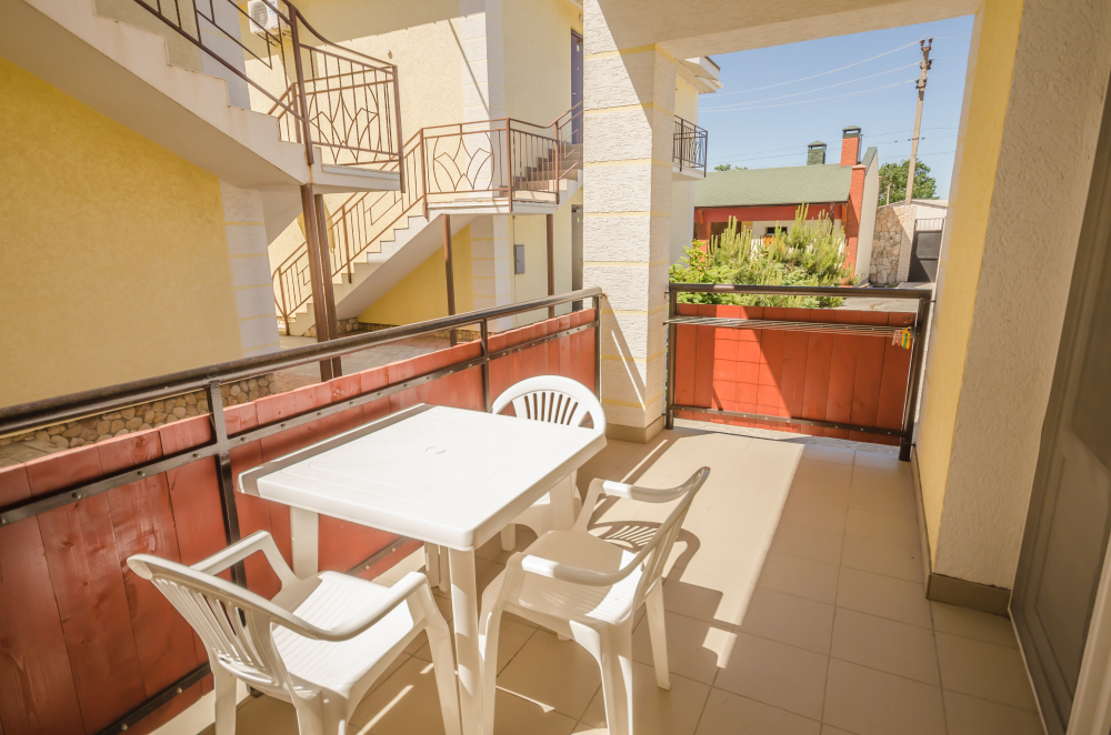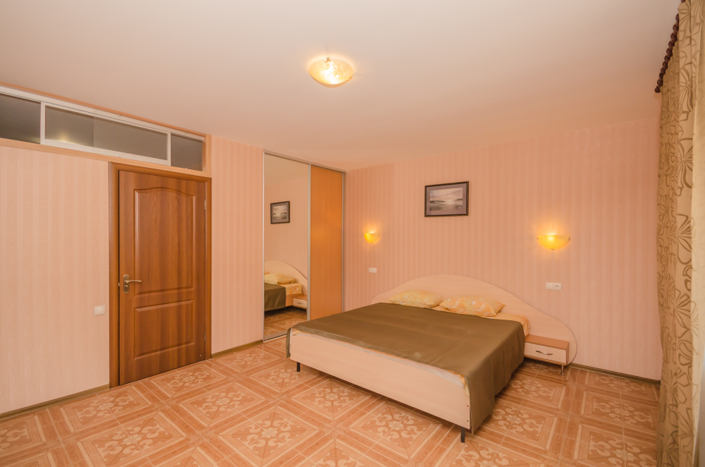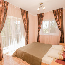 Номер с отдельным входом на 1 и 2 этаже. Первая комната проходная. Номер оборудован современной мебелью (кровать кинг-сайз, раскладной диван, шкаф-купе, туалетный стол с зеркалом, журнальный столик, стулья). В каждом номере собственная мини-кухня на балконе с набором посуды. Санузел с ванной. В номере размещаются от 2 до 5 человек (доп. место - еврораскладушка). Бесплатно размещаются дети до 3 лет, без питания и без отдельного места.