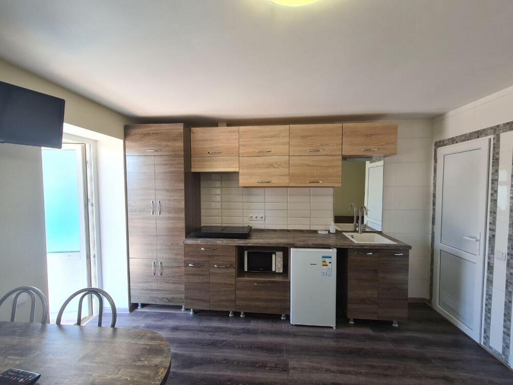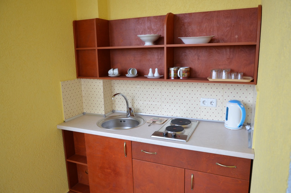 Кухонный уголок (раковина, плита, микроволновка, индукционная плита, посуда, электрочайник),
