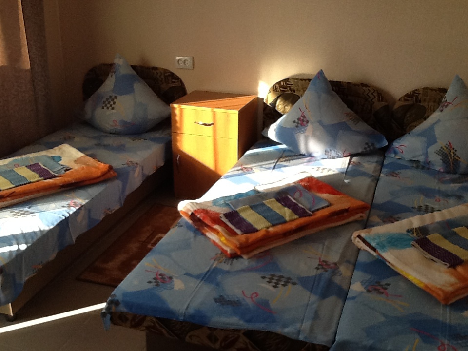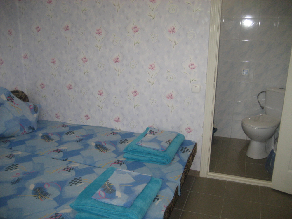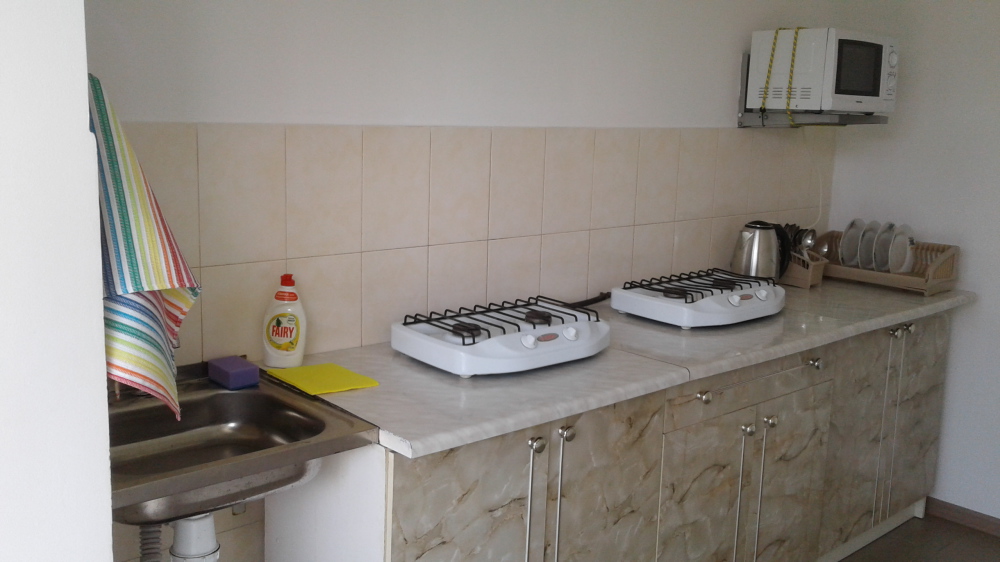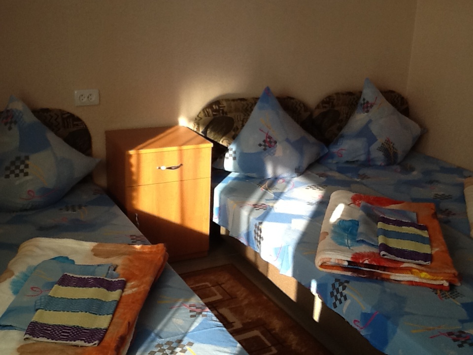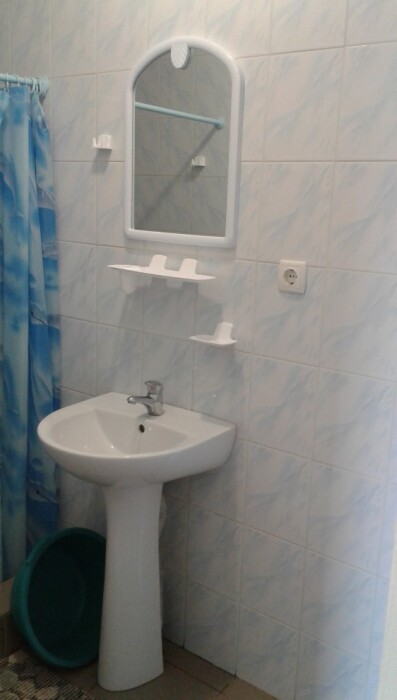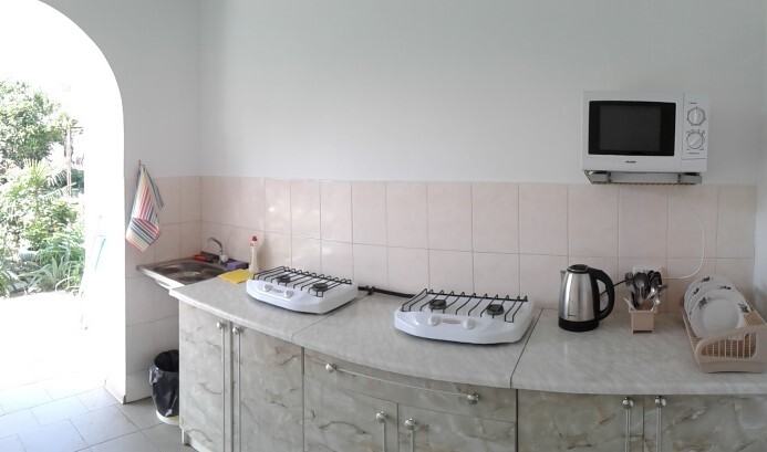 Уютный прохладный номер. На первом этаже находится три трехместных номера (возможно размещение по 2 человека) и общая кухня со всем необходимым для приготовления пищи, микроволновка.