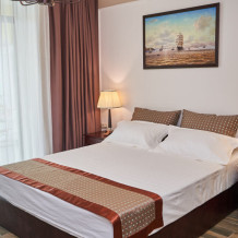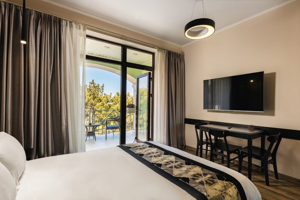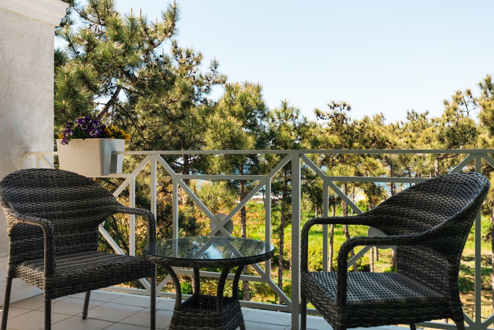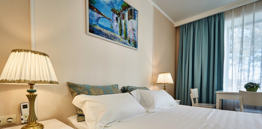 Просторная двухместная студия c классическим дизайном интерьера, укомплектована всем необходимым для комфортного проживания. Ортопедическая односпальная кровать, кресло, рабочая зона и плазменный телевизор. Просторный санузел. Панорамная терраса на входе на 2 номера, открывающая прекрасный вид на территорию комплекса, оборудована комплектом ротанговой мебели.