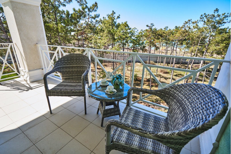 Просторная двухместная студия в светлых тонах, укомплектована всем необходимым для комфортного проживания. Ортопедическая односпальная кровать, кресло, рабочая зона и плазменный телевизор. Просторный санузел. Панорамная терраса на входе на 2 номера, открывающая прекрасный вид на территорию виллы, оборудована комплектом ротанговой мебели.