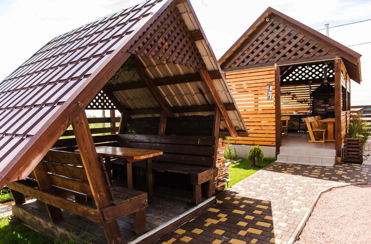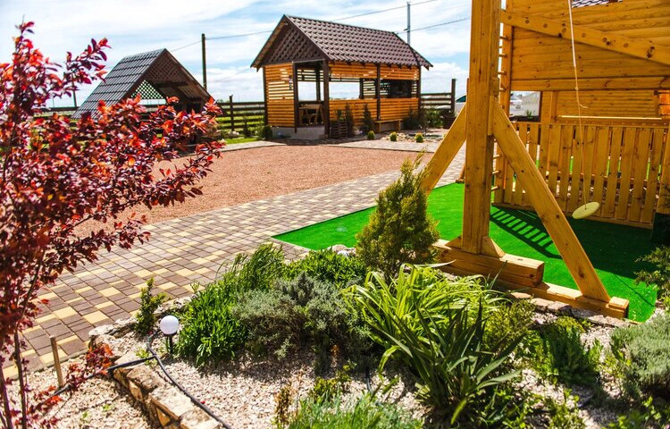 Территория гостевого комплекса 5.5 сот, на которой удобно и компактно размещен гостевой дом на 8 номеров. 2 этажа, на каждом по 4 номера. На территории посажено более 60 хвойных деревьев-можжевельники различных сортов,туи,кипарисы,сосны.