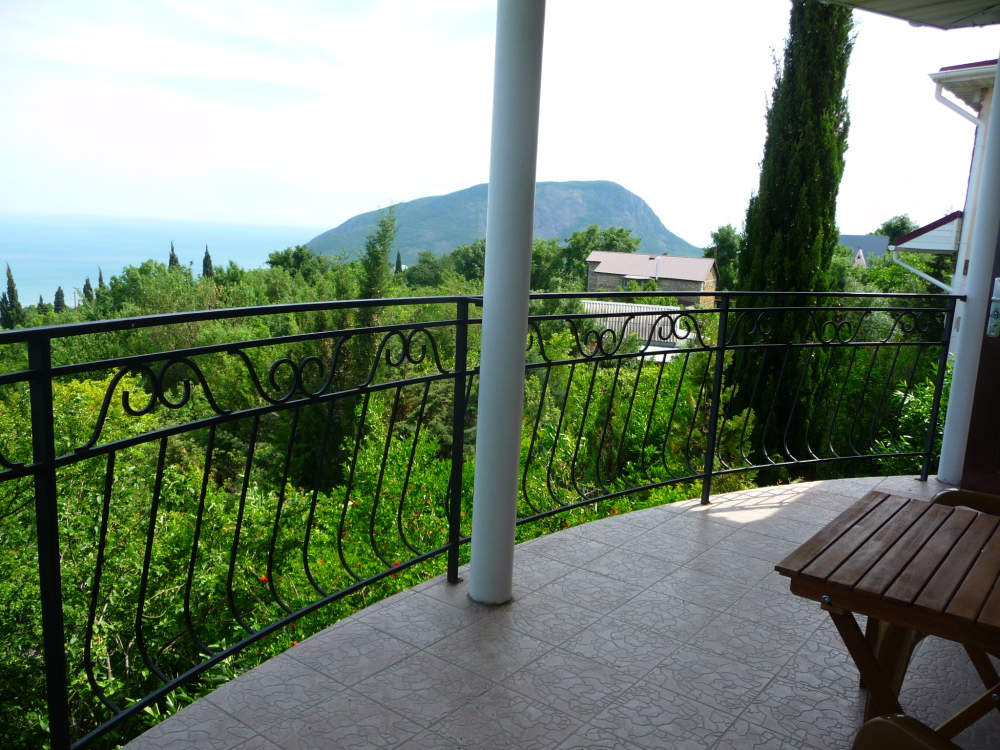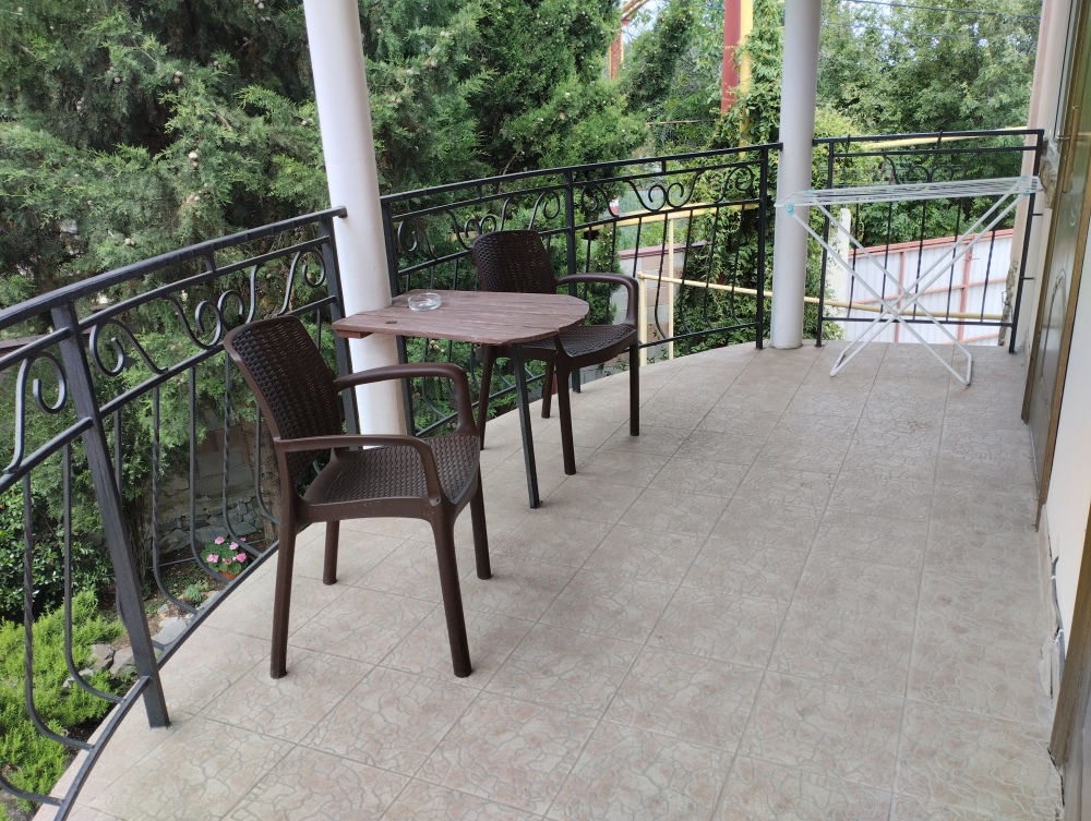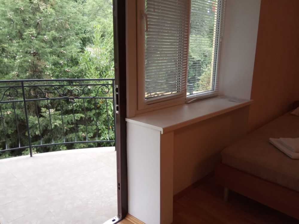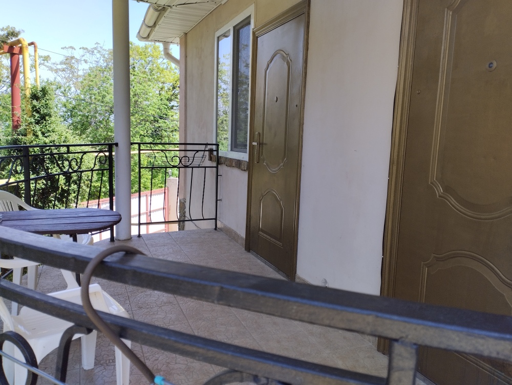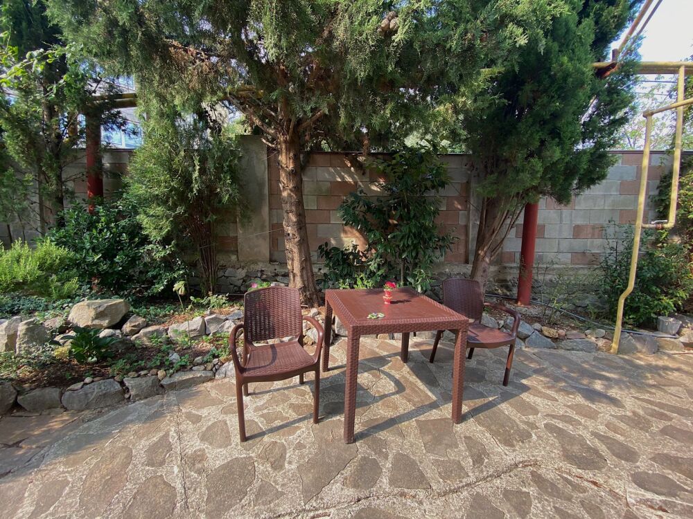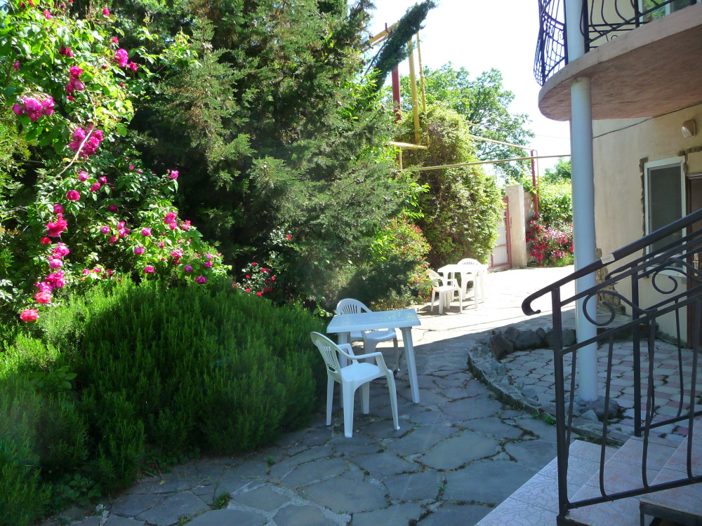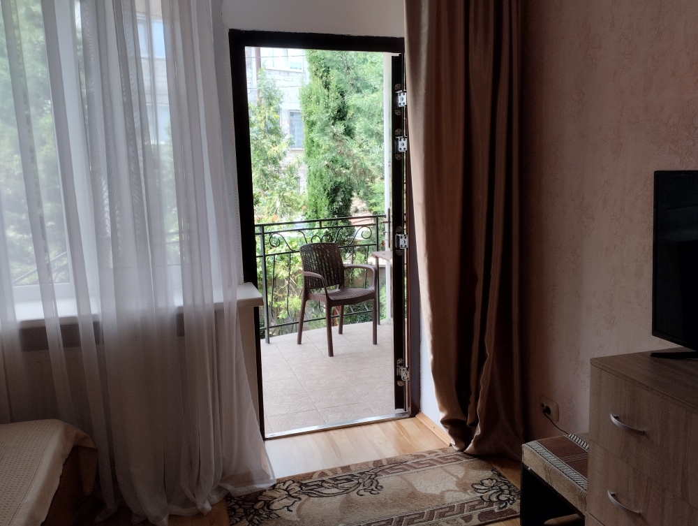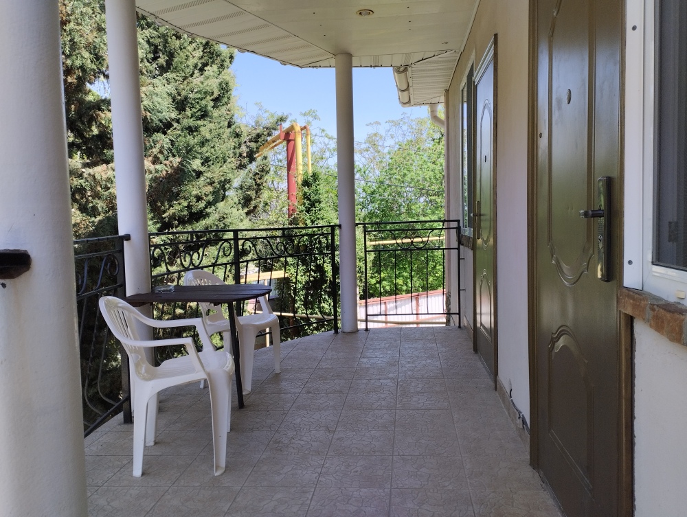 Просторный трехместный номер расположен на втором этаже. В номере свой санузел с душевой кабиной, удобная двуспальная кровать, шкаф, туалетный столик с зеркалом, комод. В номере есть также полуторная кровать. Большой красивый балкон выходит во внутренний дворик, весь в зелени. Кипарисы, сосны, кедр, розы, розмарин насыщают воздух непередаваемым ароматом. С балкона также есть боковой вид на море!