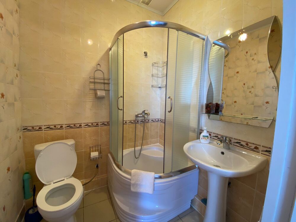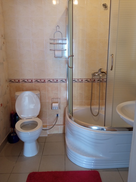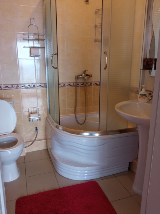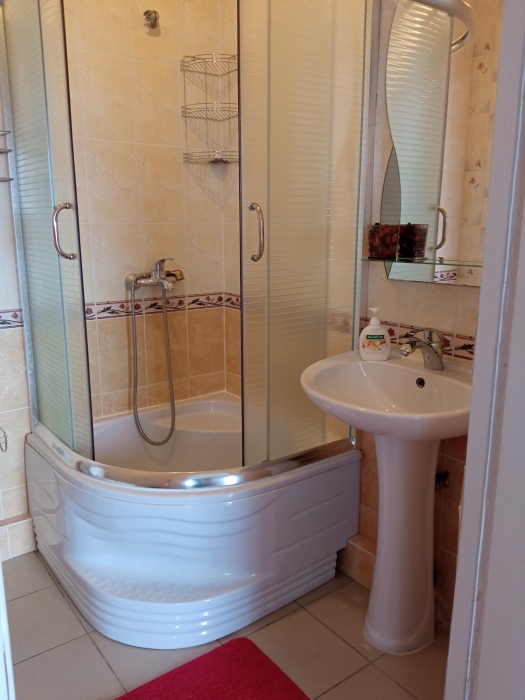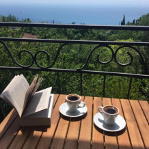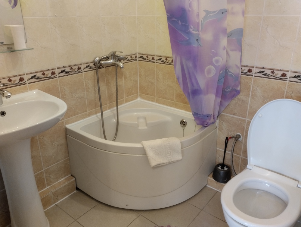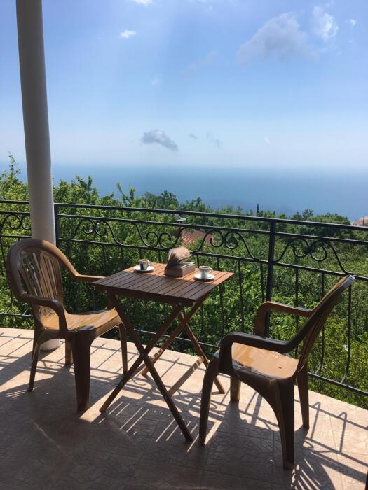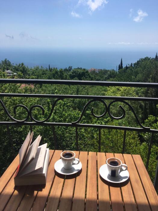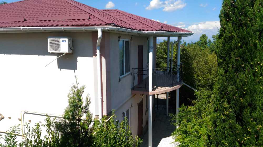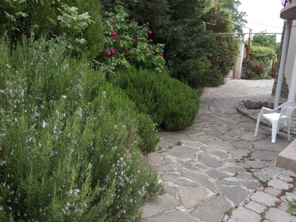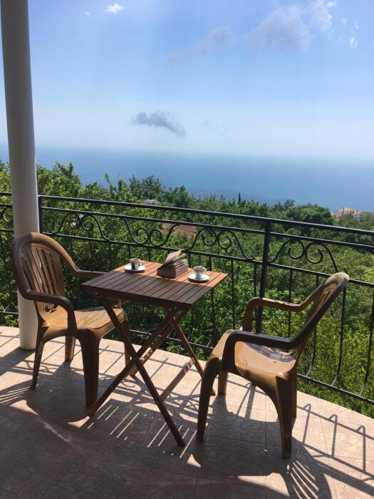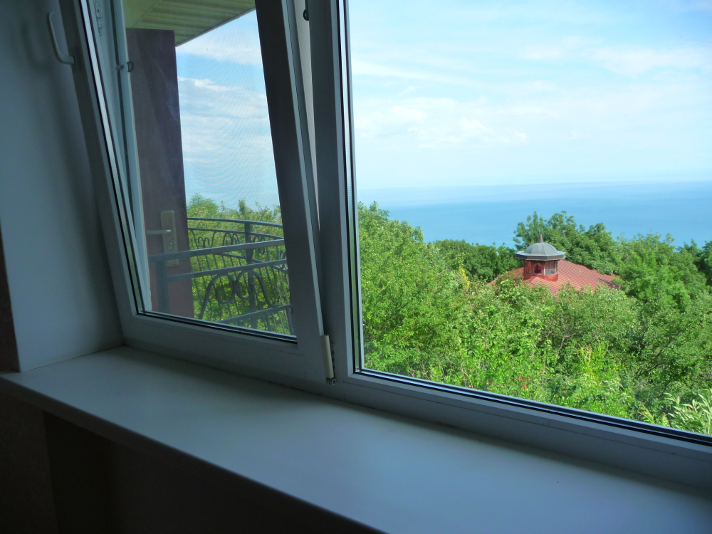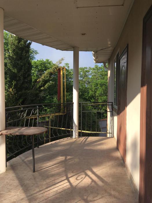Просторный трехместный номер расположен на втором этаже. В номере свой санузел с душевой кабиной, удобная двуспальная кровать, шкаф, туалетный столик с зеркалом, комод. В номере есть также полуторная кровать. Большой красивый балкон выходит во внутренний дворик, весь в зелени. Кипарисы, сосны, кедр, розы, розмарин насыщают воздух непередаваемым ароматом. С балкона также есть боковой вид на море!