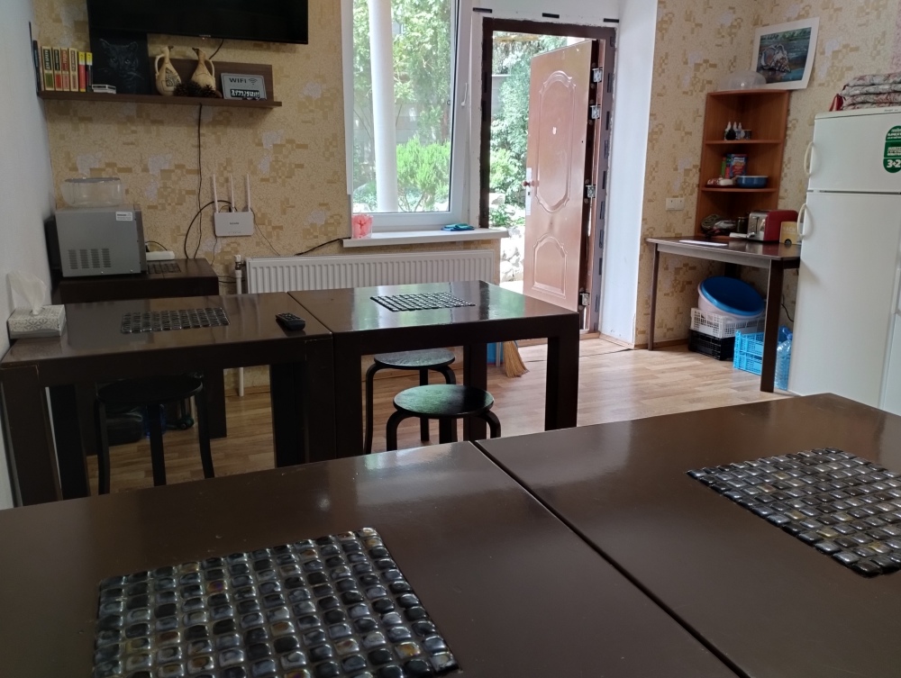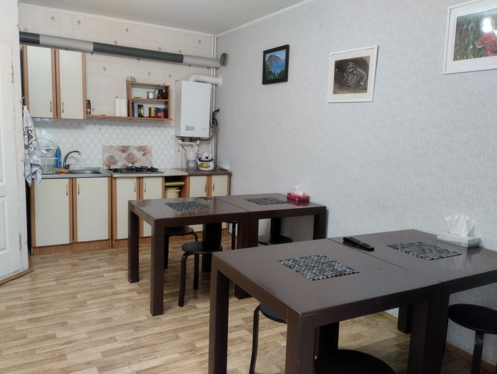 Оборудована общая кухня для приготовления еды: набор посуды, чайник, холодильник, микроволновка. Горячая и холодная вода круглосуточно.