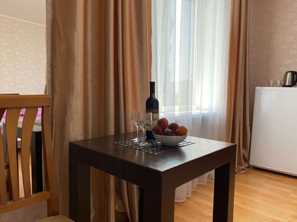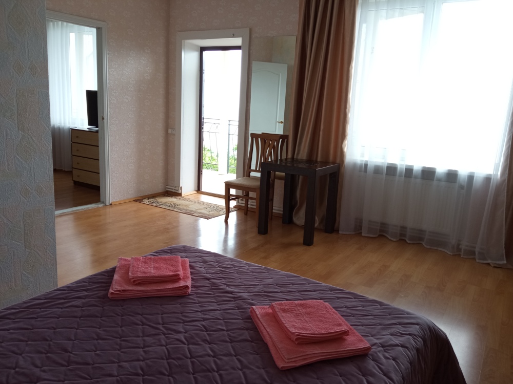 Просторный двухкомнатный номер расположен на втором этаже, имеет большой балкон с великолепным видом на море и гору Аю-Даг. В номере площадью 40 кв.м две спальни и санузел, две полуторные кровати, мебельная стенка. Во второй спальне двуспальная кровать, две прикроватные тумбочки, комод и ЖК-телевизор, кондиционер и холодильник, электрический чайник. На просторном балконе предусмотрены столик и кресла, чтобы наслаждаться нереально красивым видом моря, гор и зеленых парков, вдыхая свежий, пьянящий воздух, пахнущий морем, соснами, можжевельником и цветами.