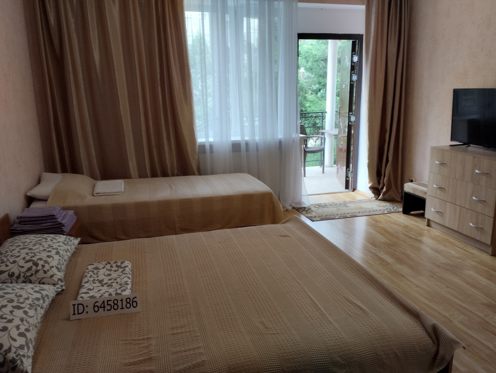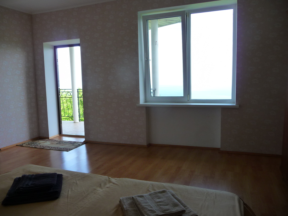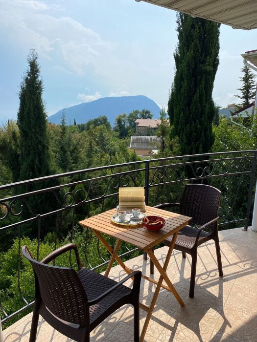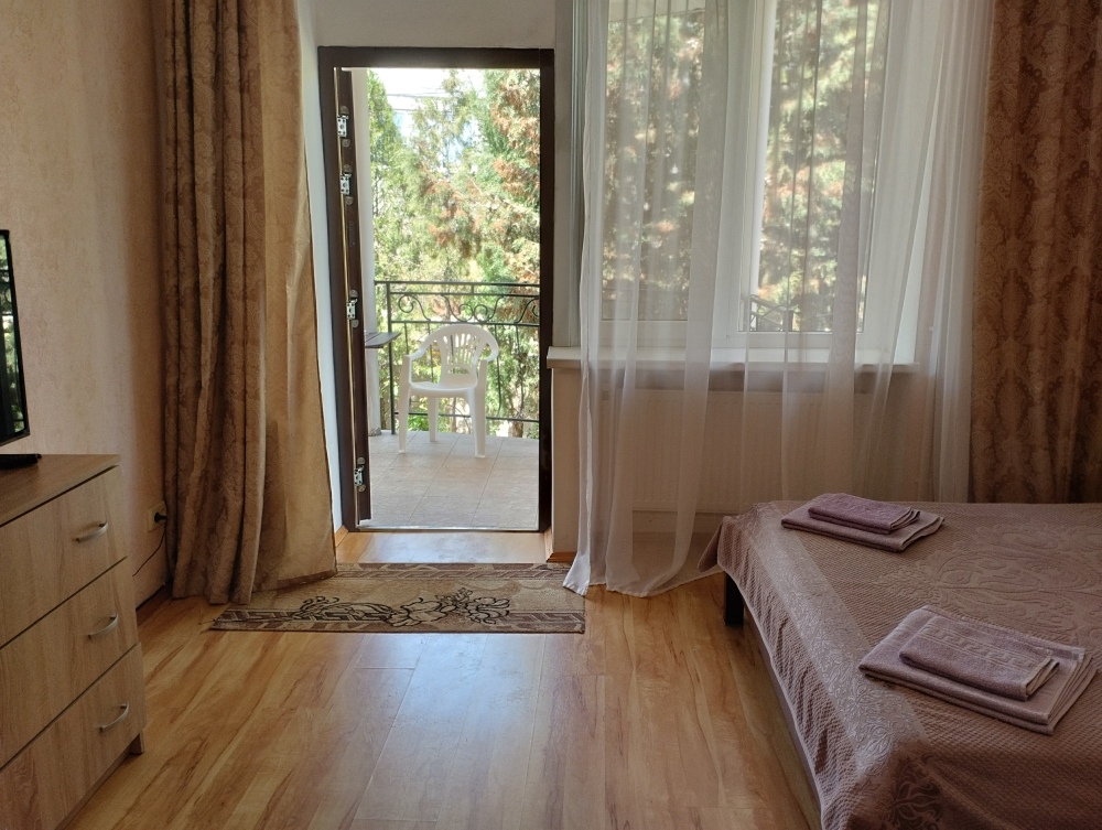 Просторный четырехместный номер расположен на втором этаже. В номере свой санузел с душевой кабиной, удобная двуспальная кровать, шкаф, туалетный столик с зеркалом, комод. В номере есть также полуторная кровать. при необходимости предоставляется дополнительное спальное место. Большой красивый балкон выходит во внутренний дворик, весь в зелени. Кипарисы, сосны, кедр, розы, розмарин насыщают воздух непередаваемым ароматом. С балкона также есть боковой вид на море!
