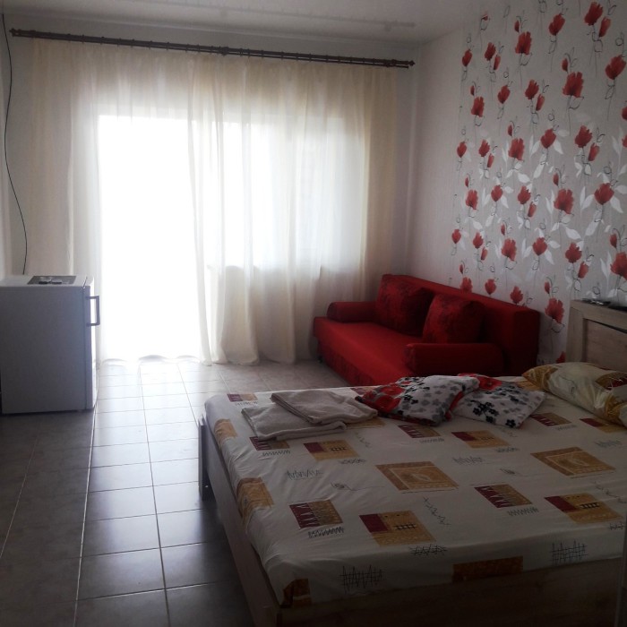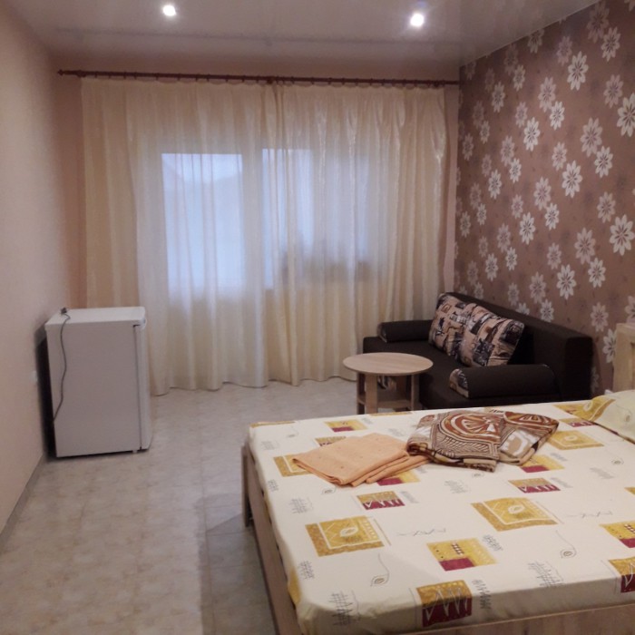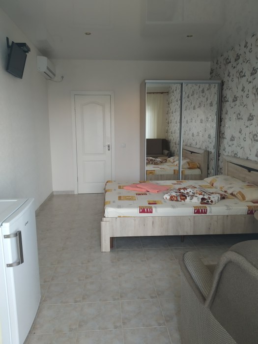 Перед номером столик со стульями, где можно отдохнуть в тени и покушать. В номере новая современная комфортная кровать с ортопедическим матрасом и односпальная тахта, что позволит хорошо выспаться. Есть красивое постельное белье, мягкие пледы, полотенца.