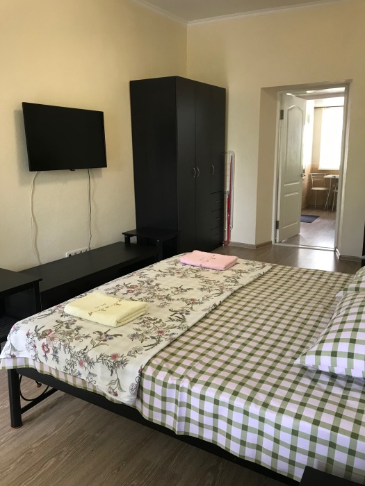В первой спальне- 2х спальная кровать, тумбочки 2, телевизор плазма, столик, кондиционер, шкаф, утюг и гладильная доска. Во второй спальне так же 2х-спальный диван-кровать, стол, полки.