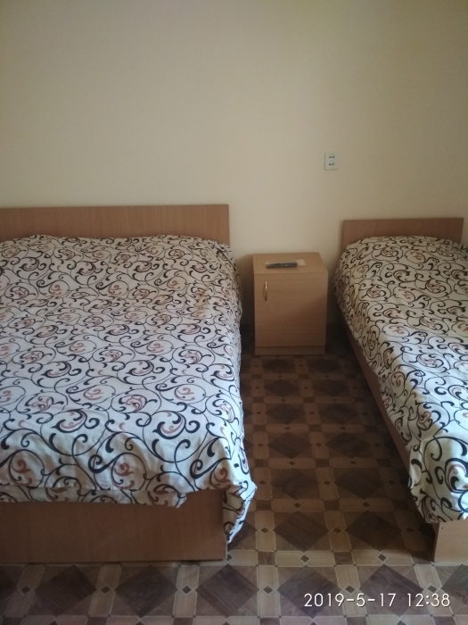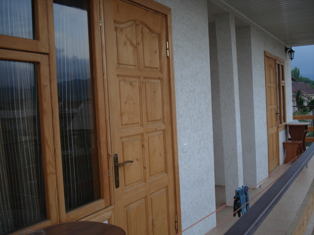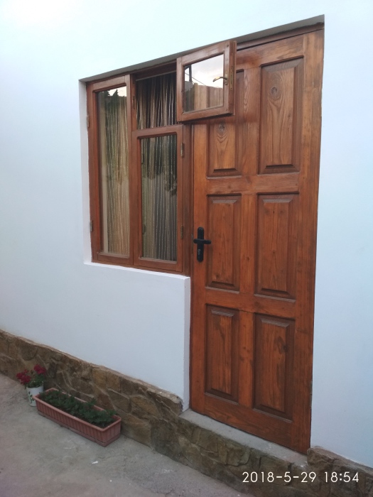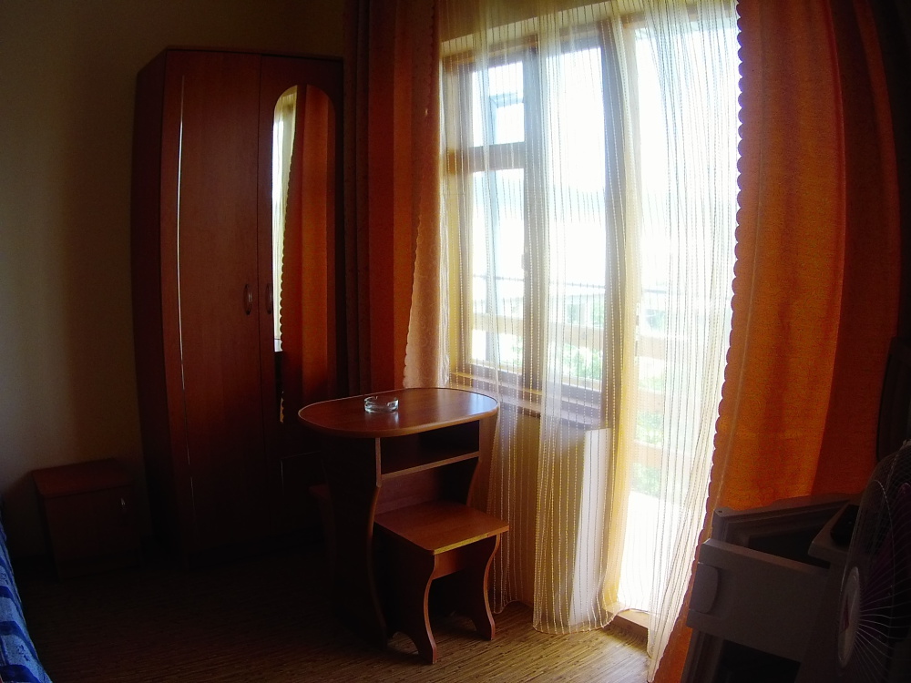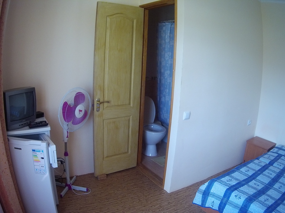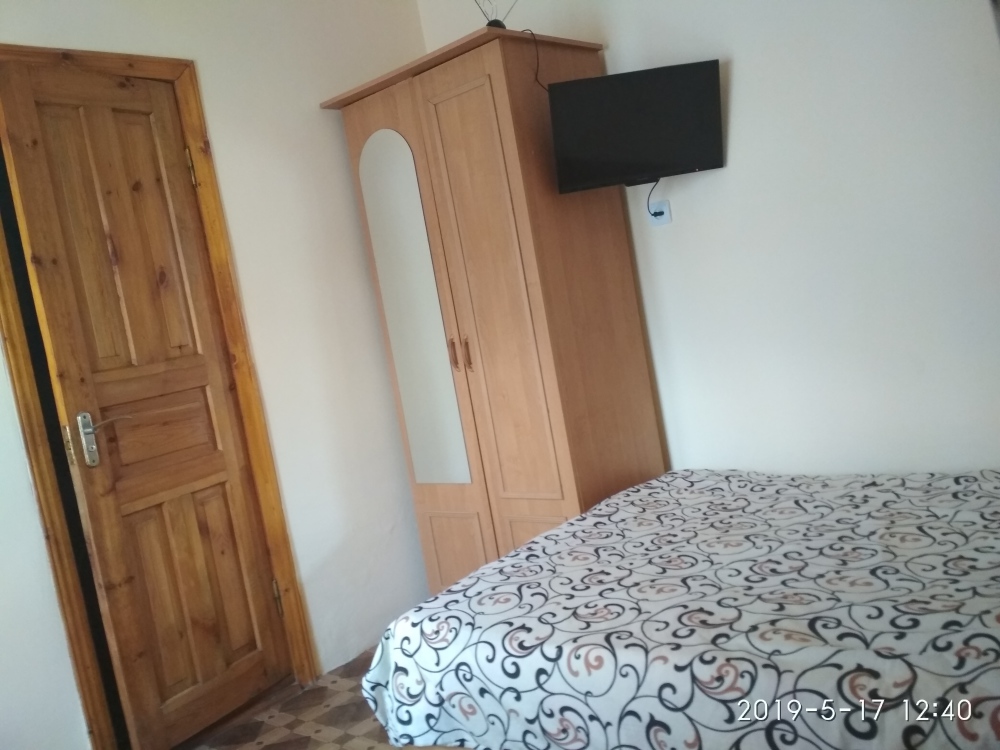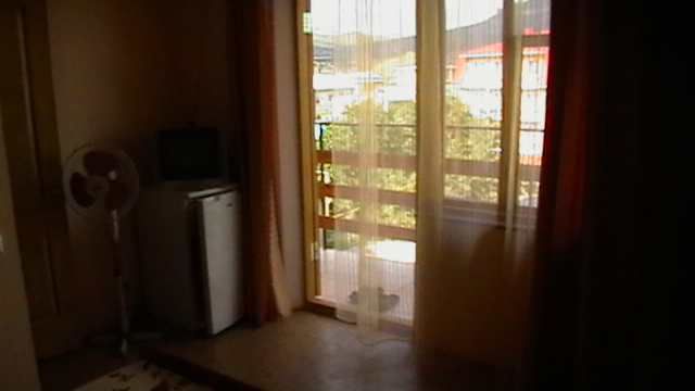 Двухместная комната на третьем этаже. Внутри душ,туалет,телевизор,холодильник,кондиционер. Балкон со столиком ,Хороший вод на горы. Не большая кухя на этаже на две комнаты.