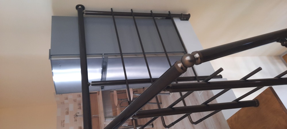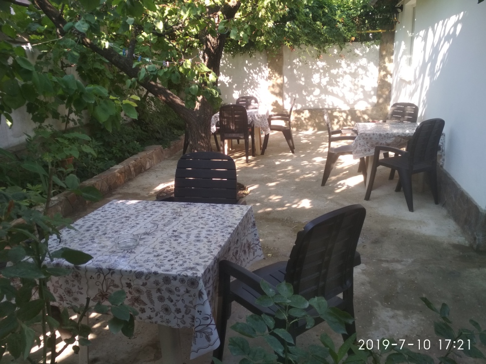 Кухня общая. Есть все необходимое посуда, микроволновка, стиральная машина, утюг. Зелёный дворик со столиками.