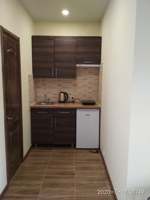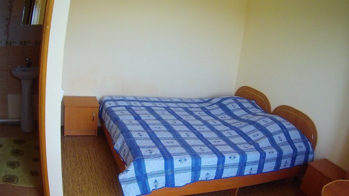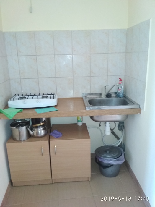 Не большая двухместная комната на первом этаже. Внутри душ туалет,телевизор,холодильник,кондиционер. Кухня общая.