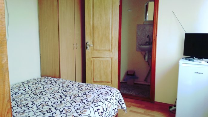 Трехместная комната эконом. Внутри душ туалет,телевизор,вентилятор. Холодильник на кухне.