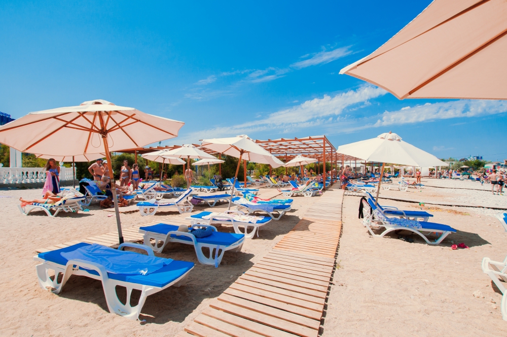 Здесь организовано все для комфортного отдыха гостей - шезлонги, зонтики, навесы, душевые, кабинки для переодевания, бар на пляже, ночной клуб АкваДенс.
