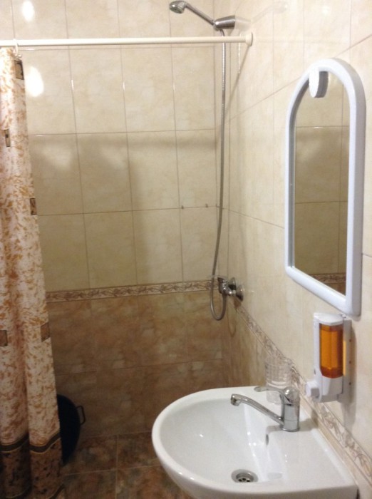 Номер находится в отдельном домике. С площадки возле номера открывается вид на море и горы. В номере три односпальные кровати шириной 80 см. Две из них совмещены, получается двухспальная кровать без промежутка. Пред номером установлен столик для отдыха. В номере кондиционер, телевизор, холодильник, тумбочки, шкаф, посуда, туалет и душ.