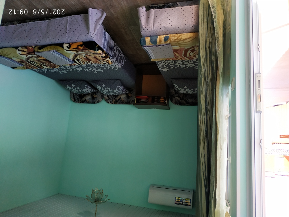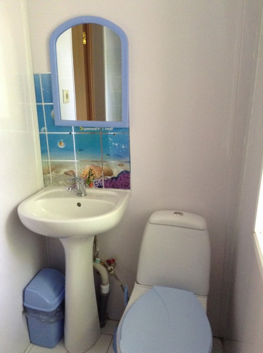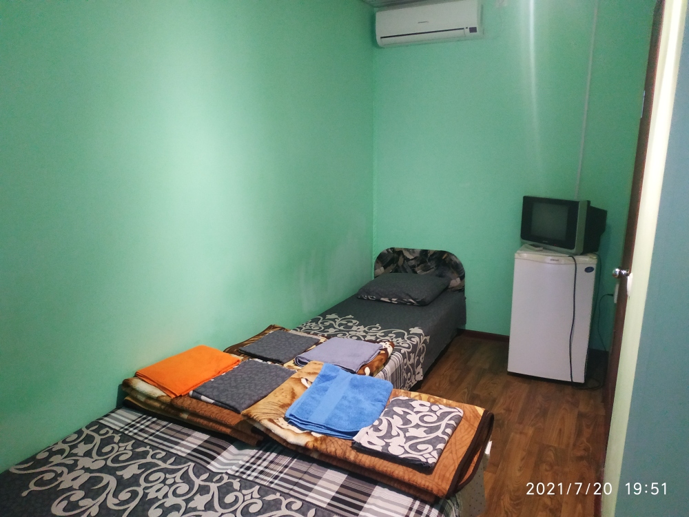 Двухместный номер расположен на втором этаже двухэтажного домика. Два номера соединены балконом, на котором расположены столики. В номере две кровати, которые можно сдвигать, получается двухспальная кровать без промежутка. Также есть кондиционер, шкаф, телевизор и холодильник. Туалет и душевая кабина в номере.