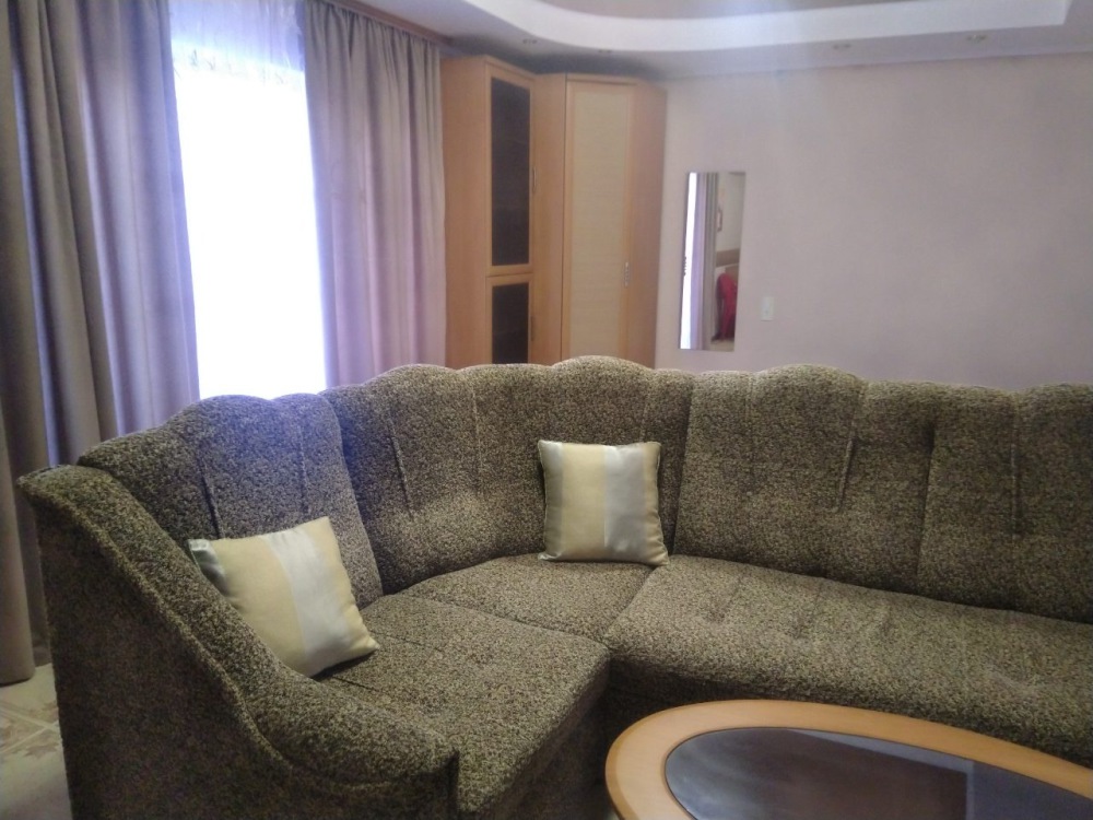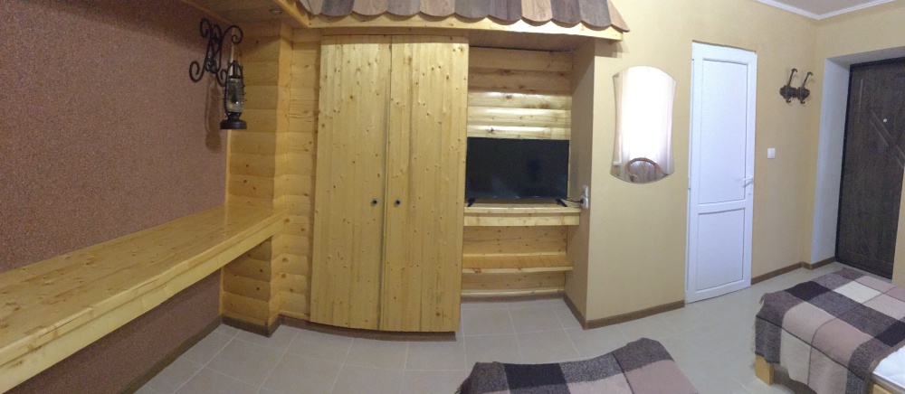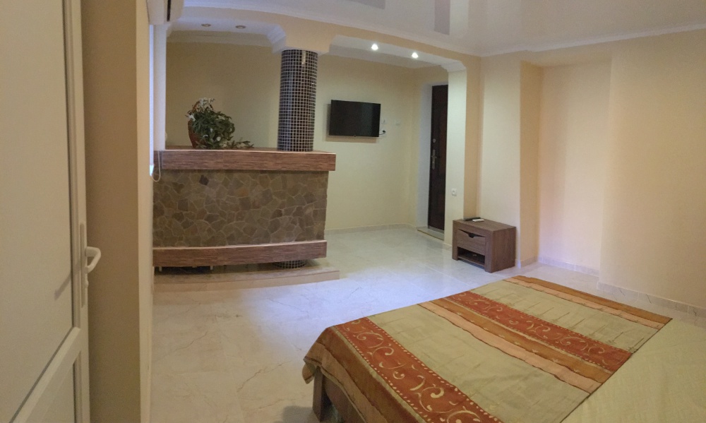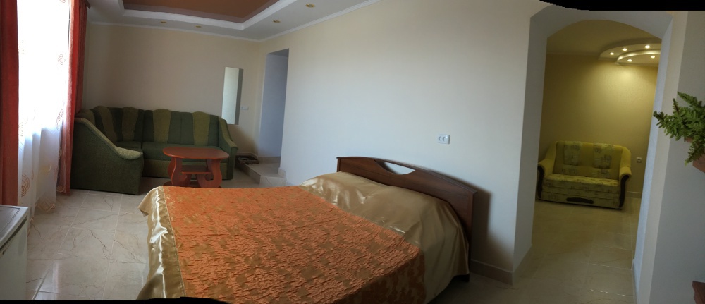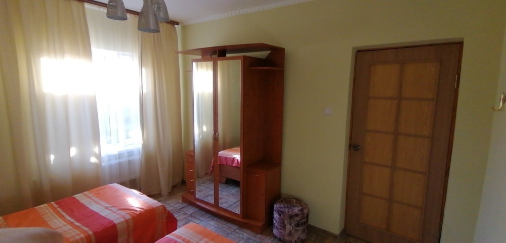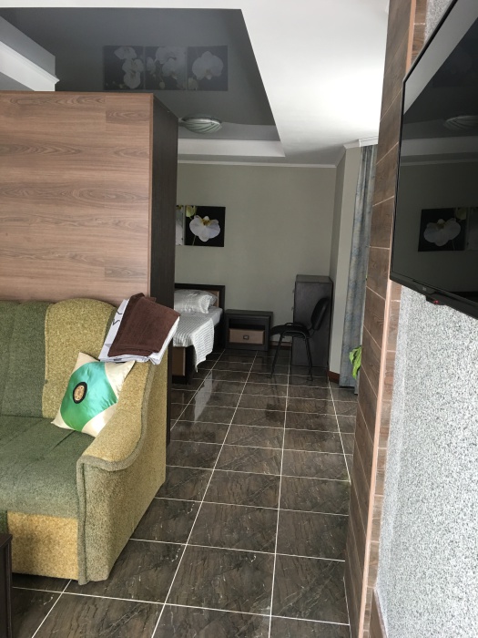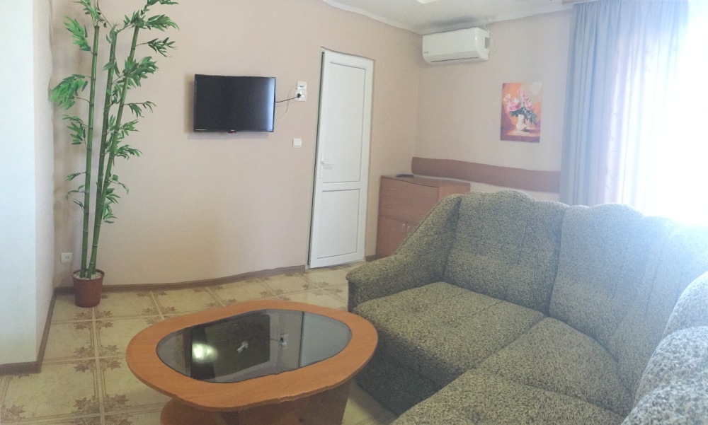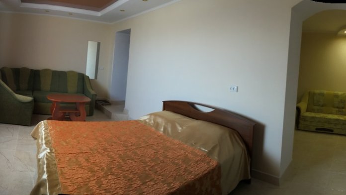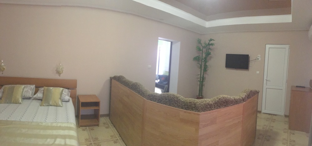 Номер расположен на первом этаже и состоит из двух смежных комнат. В первой - двуспальная кровать и диван-кровать, а во втором раскладной диван. Номер удобен для семьи с маленькими детьми. В номере комфортно и есть все необходимое для кратковременного проживания.