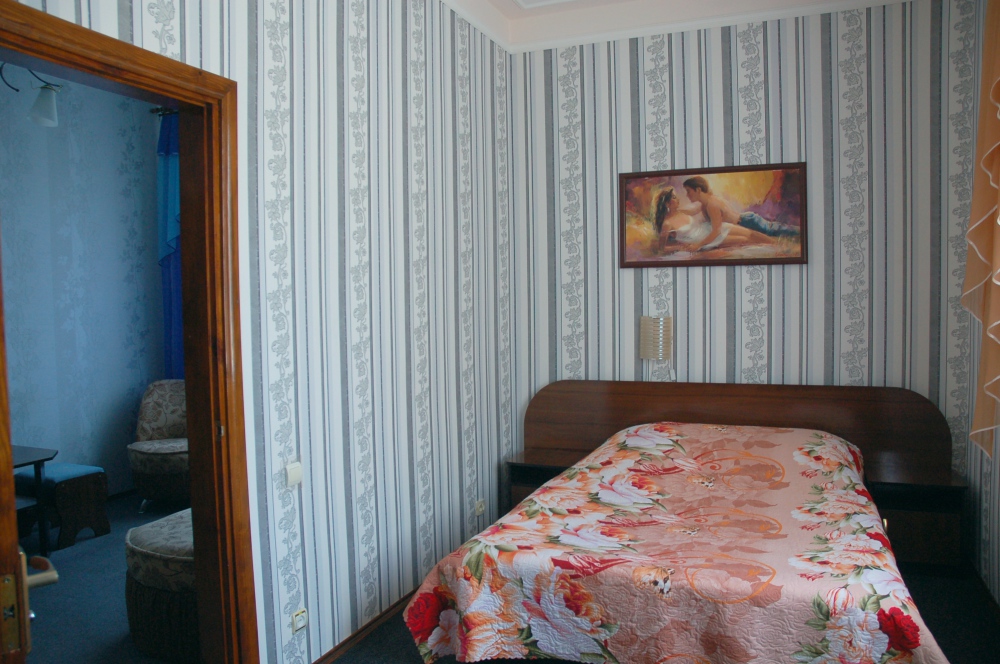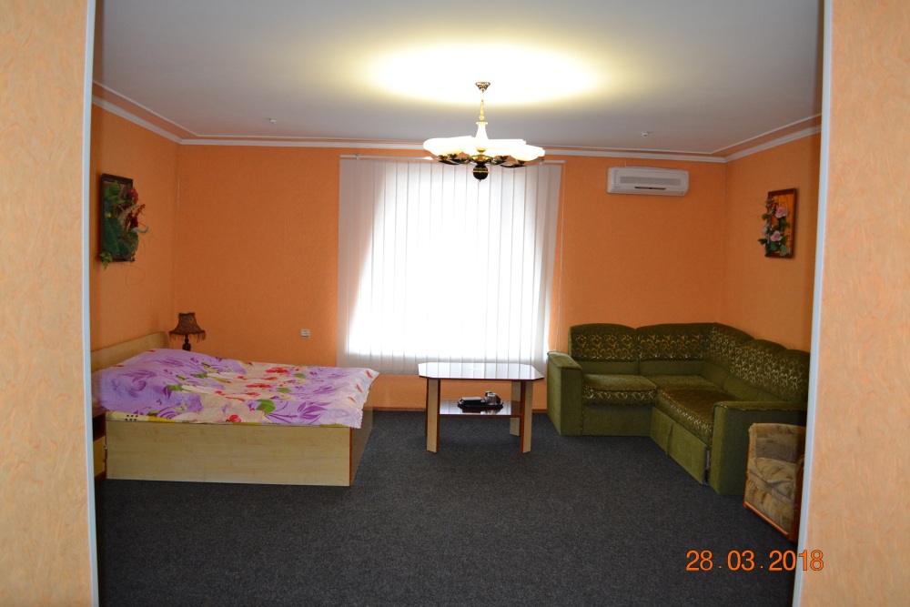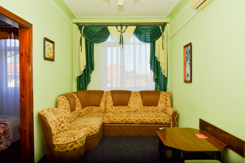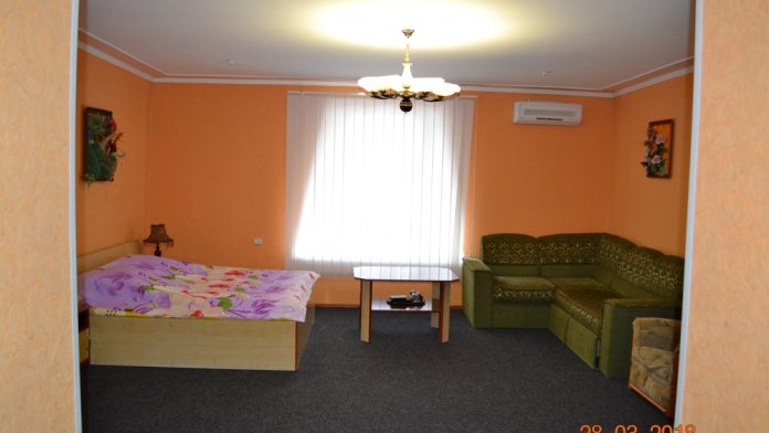 В номере мебель: Двуспальная кровать, односпальный диван, шкаф, кресло, стол, стулья.