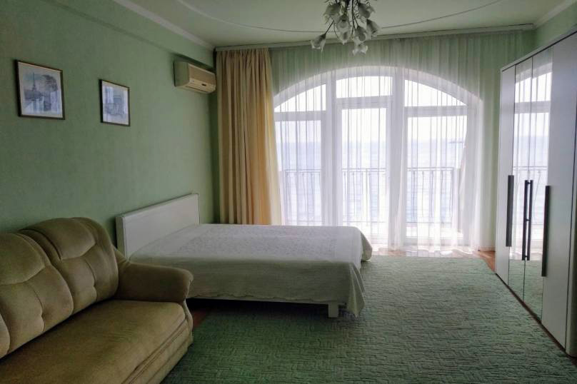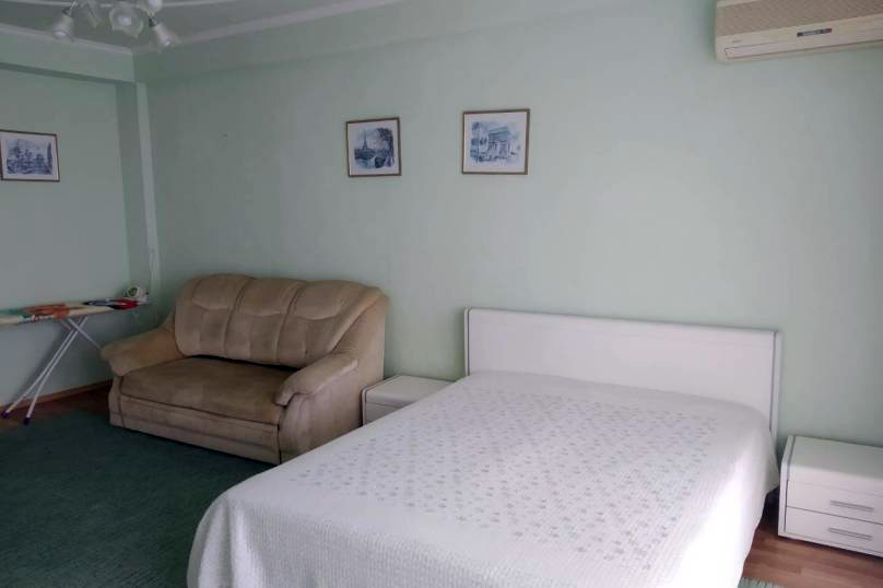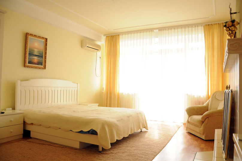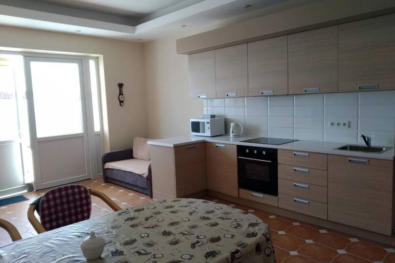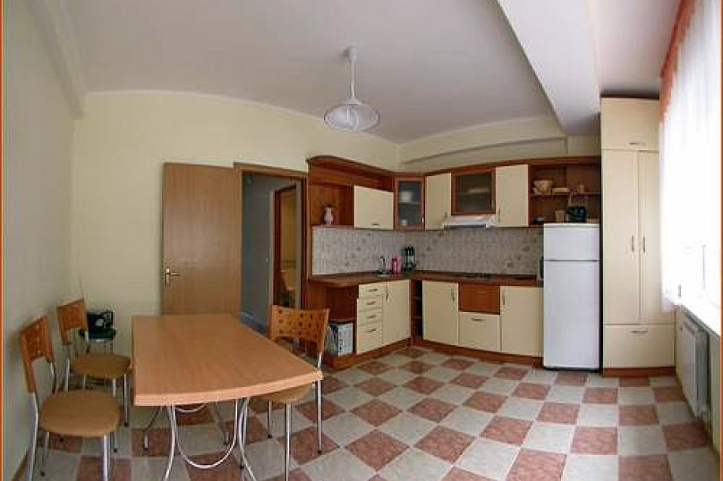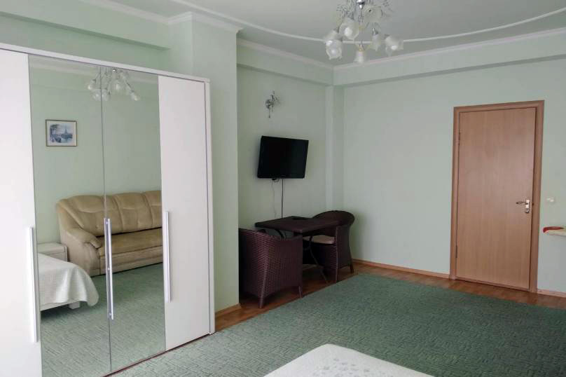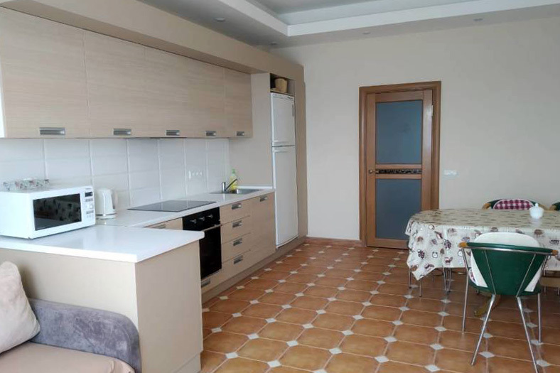 Номера имеют полностью оборудованную кухню (16 кв.м.), где есть все необходимое для готовки, две спальни (18 кв.м. и 6 кв.м.), две двухспальные кровати, диван, детская кровать, раскладушка, балкон с видом на море, TV, wi-fi, кондиционер, 2 санузла, со стороны гор оборудованная площадка для отдыха.