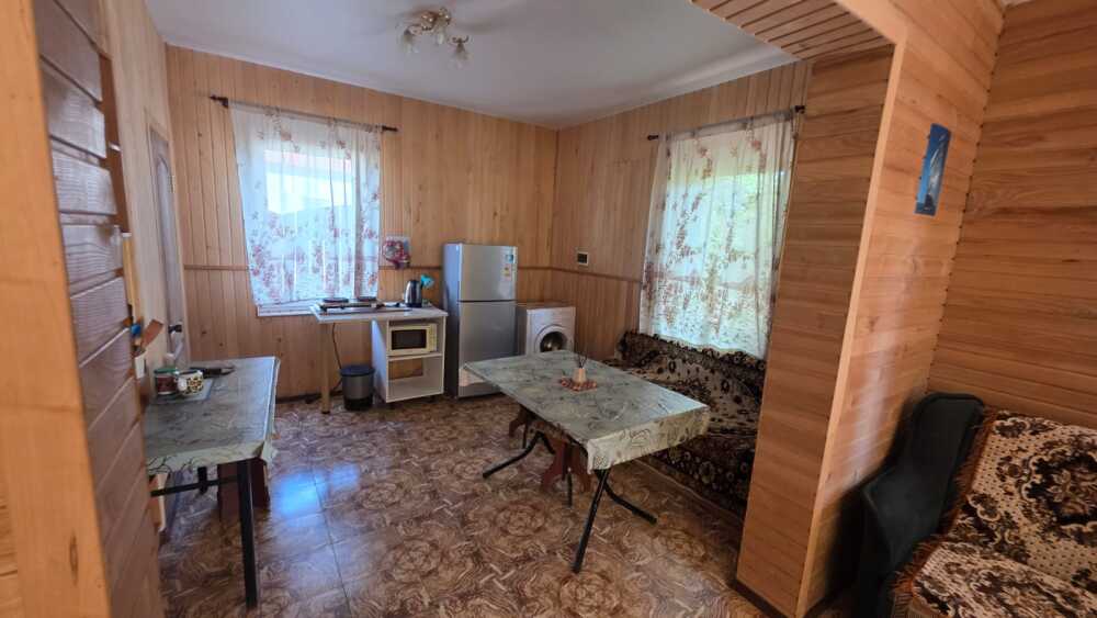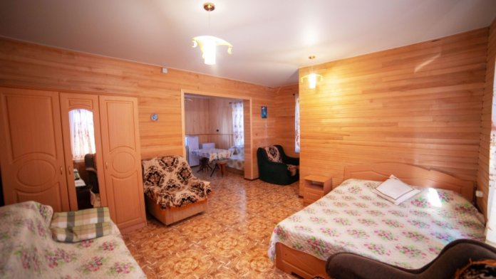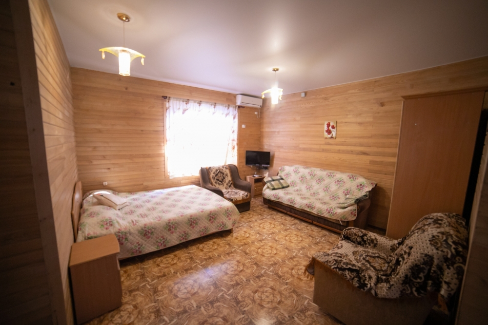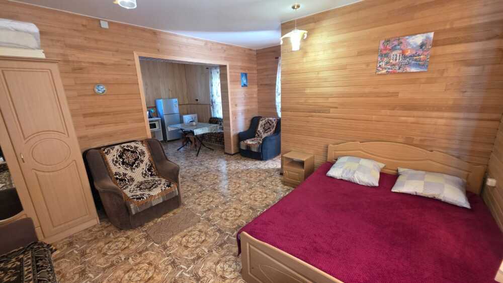 Шестиместный номер студия площадью 55 м2 со всеми удобствами ,который занимает весь первый этаж дома,со своей кухней,стиральной машиной и беседкой для отдыха. Все удобства, холодная и горячая вода-круглосуточно.мебель, микроволновая печь, кондиционер, водонагреватель, фен, телевизор, спутниковое, цифровое тв, интернет, санузел совмещенный, 1 двуспальная кровать, 2 дивана-кровати, два кресла-кровати и детская кроватка (по запросу),окна выходят в сад Имеется возможность двух дополнительных мест.