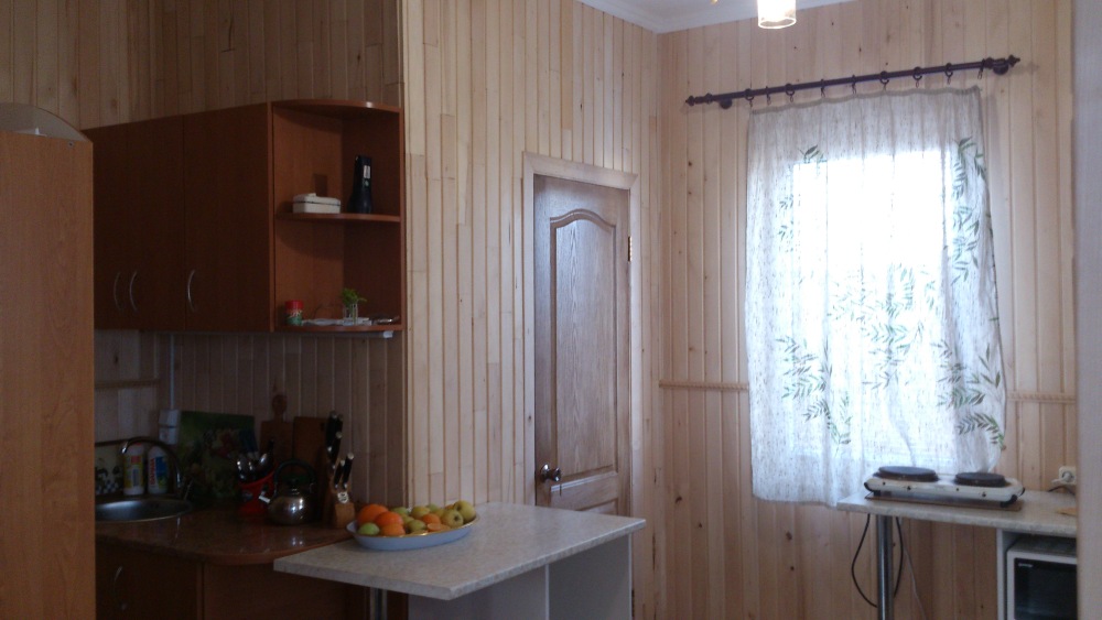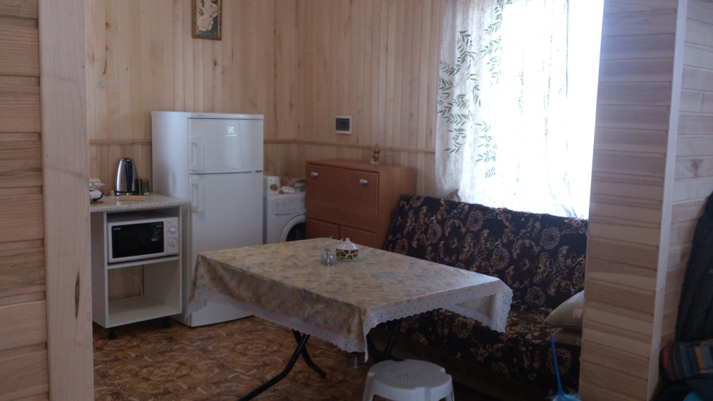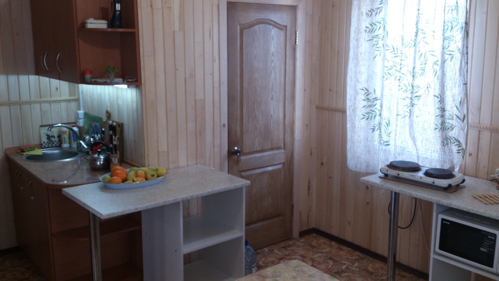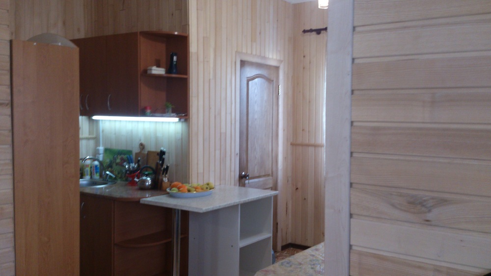 Своя кухня с полным набором посуды ,микроволновая печь,холодильник ,два шкафа,один из которых с большим зеркалом,столы , стулья - все для хорошего отдыха.