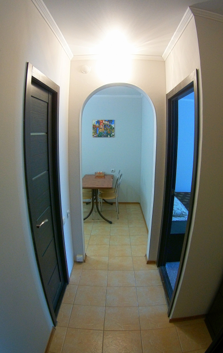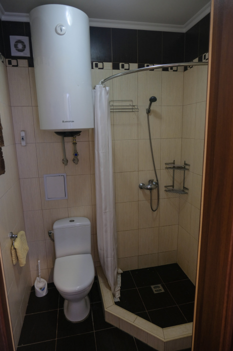 - один двухкомнатный пятиместный номер с террасой, площадь – 68 м.кв., расположен на третьем верхнем этаже здания, имеет две отдельные спальни (в разных концах здания), кухню и санузел, коридор и террасу (12 м.кв).