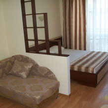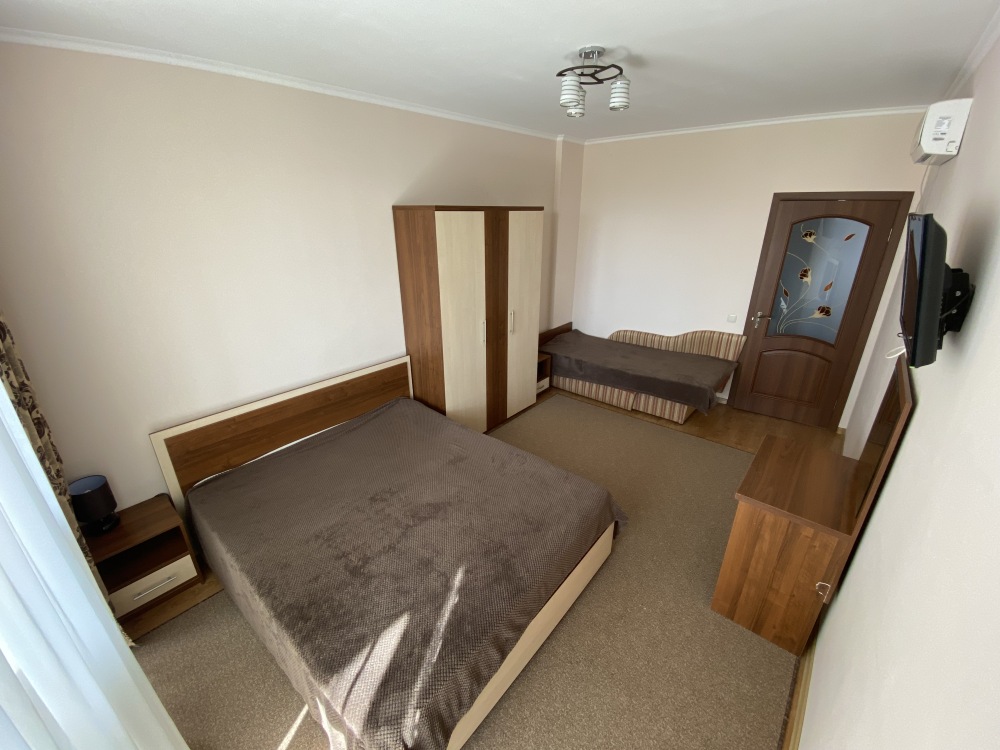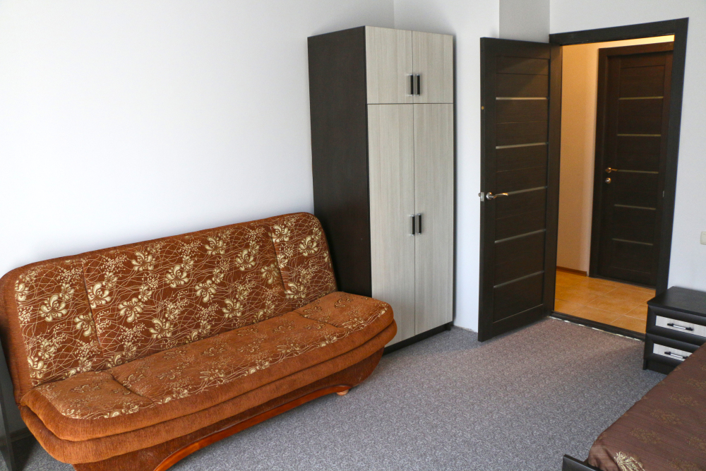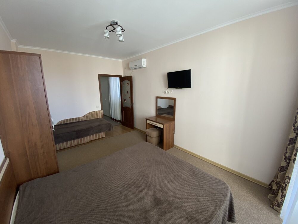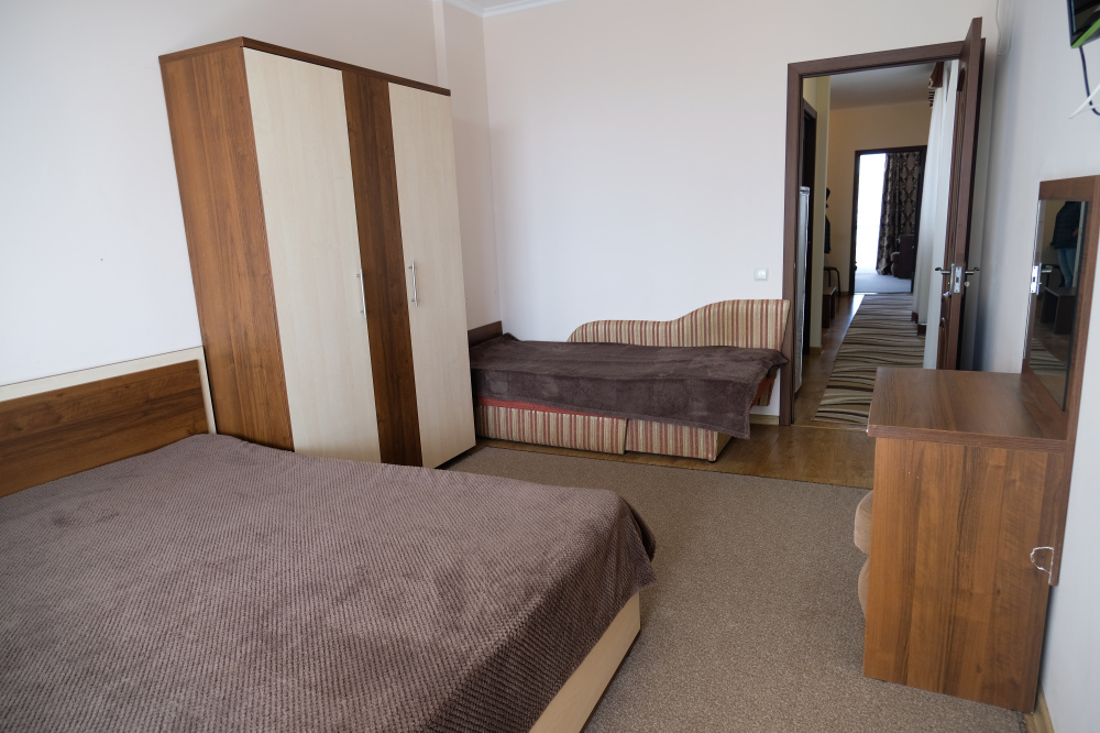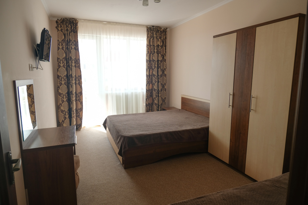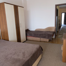 - два трехместных номера с балконом, расположены на первом и втором этаже здания, площадь -27 м.кв. Спальные места – кровать двуспальная (1,6 х 2,0 м.) и диван односпальный раздвижной (1,0 х 2,0 м.).