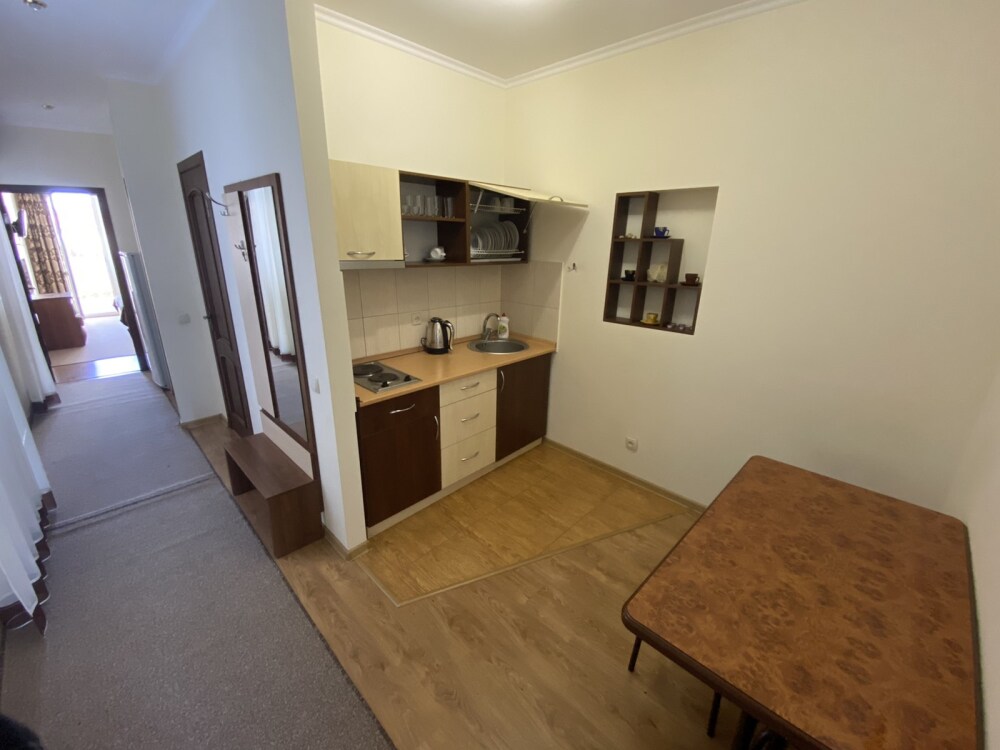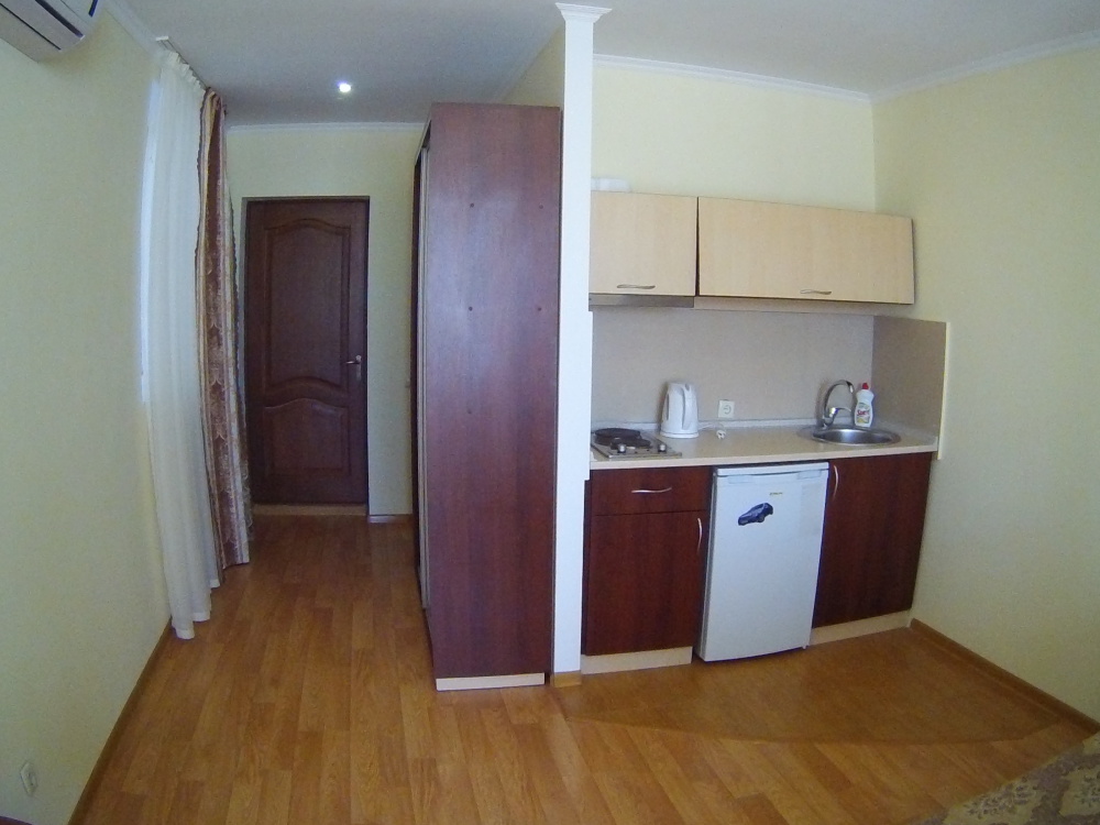 Трехместный номер с балконом и кухонным блоком. Кухонный блок оборудован: Эл. чайником., холодильником, плитой на две конфорки, вытяжкой, мойкой, кухонной утварью. В номере имеется обеденная зона (стол и три стула).
