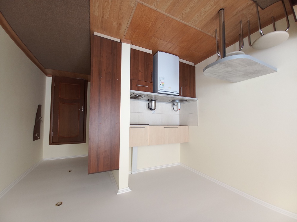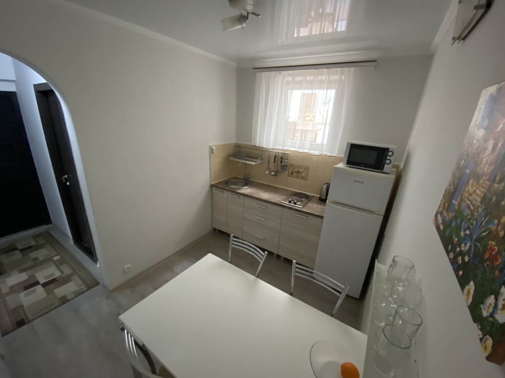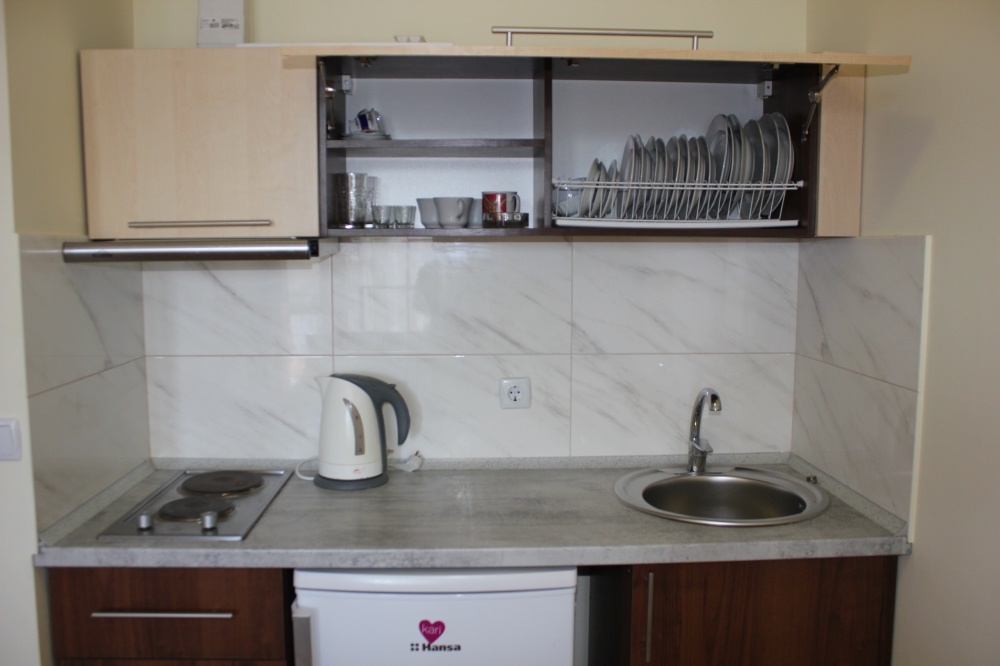Кухня оборудована:Чайник эл., холодильник, плита на две конфорки, вытяжка, мойка, кухонная утварь.