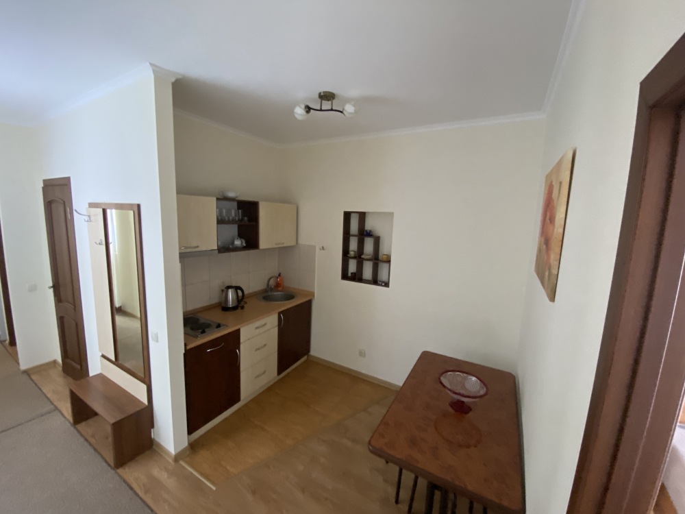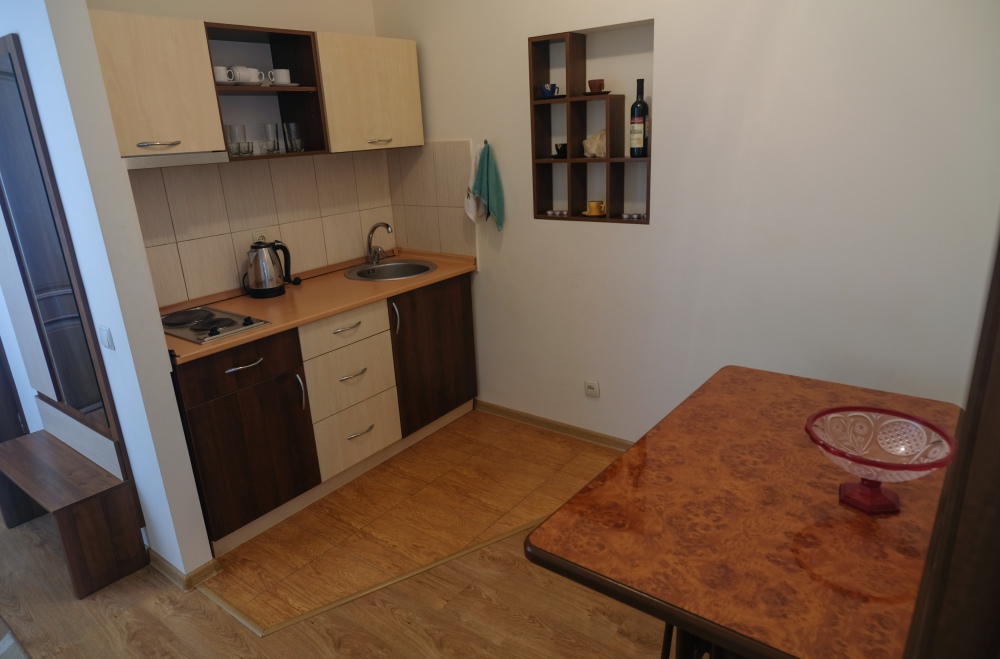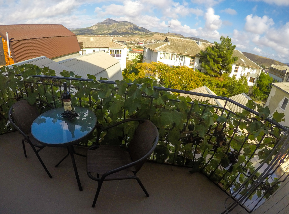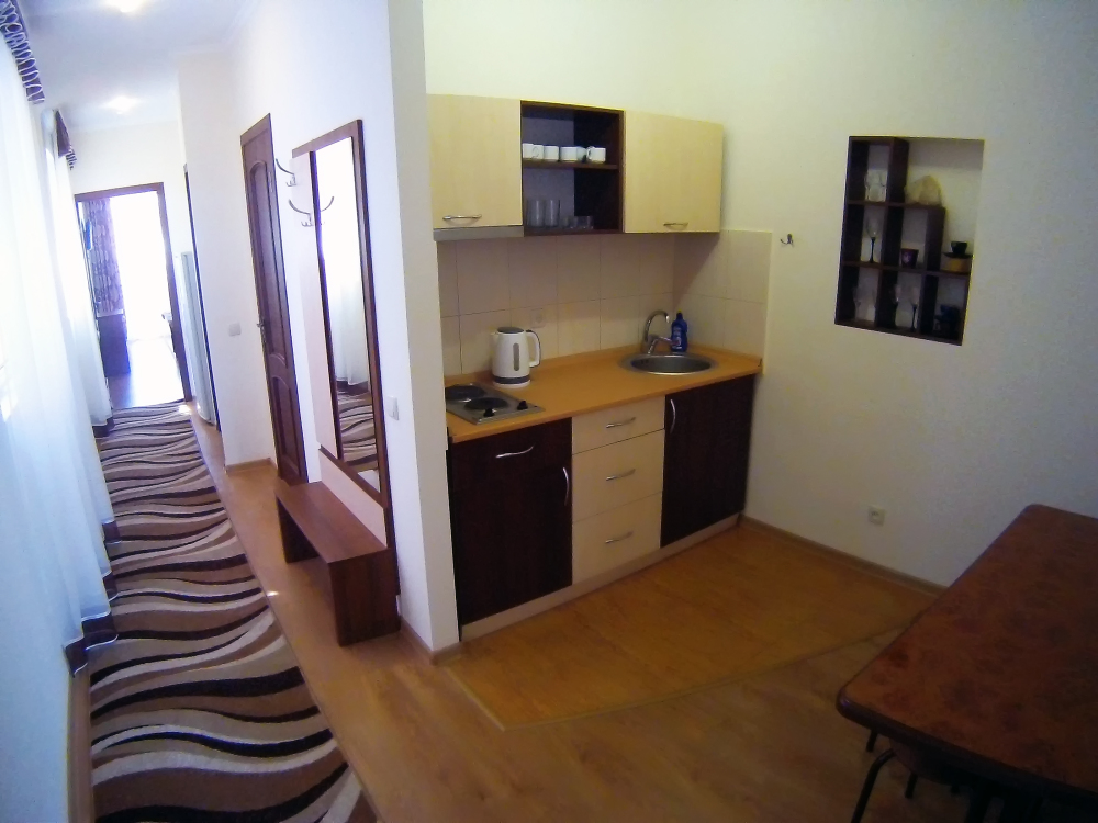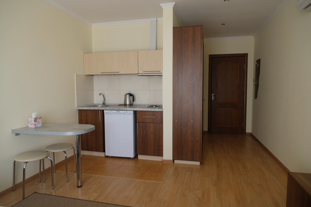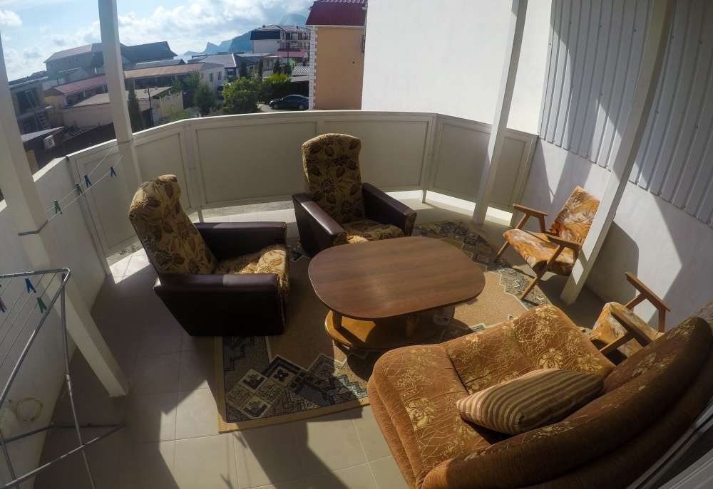 Двухместный номер с балконом, оборудован кухонным блоком, балкон оборудован: стол и два кресла для отдыха.