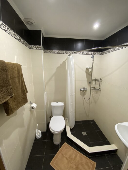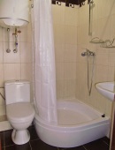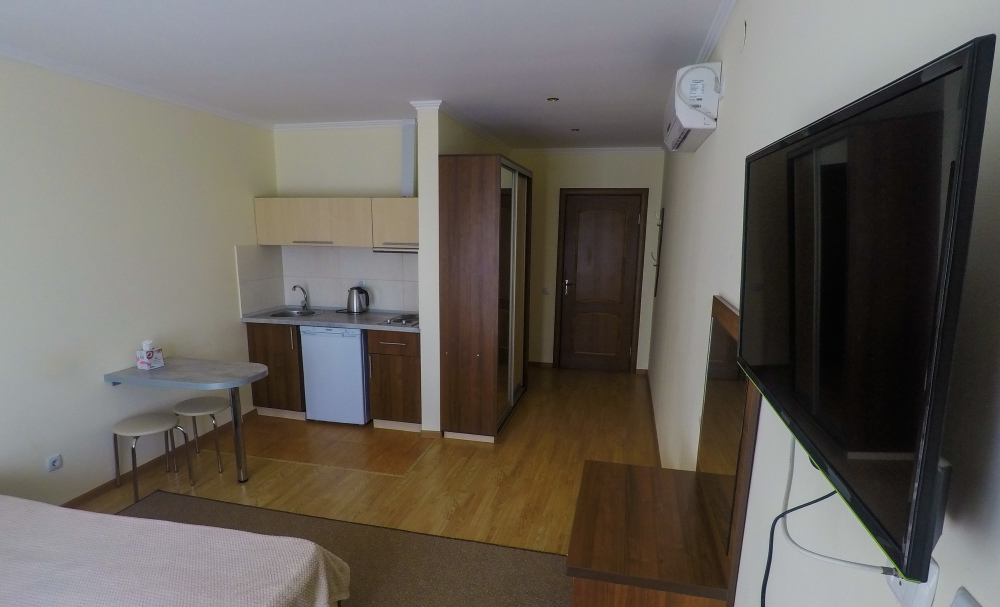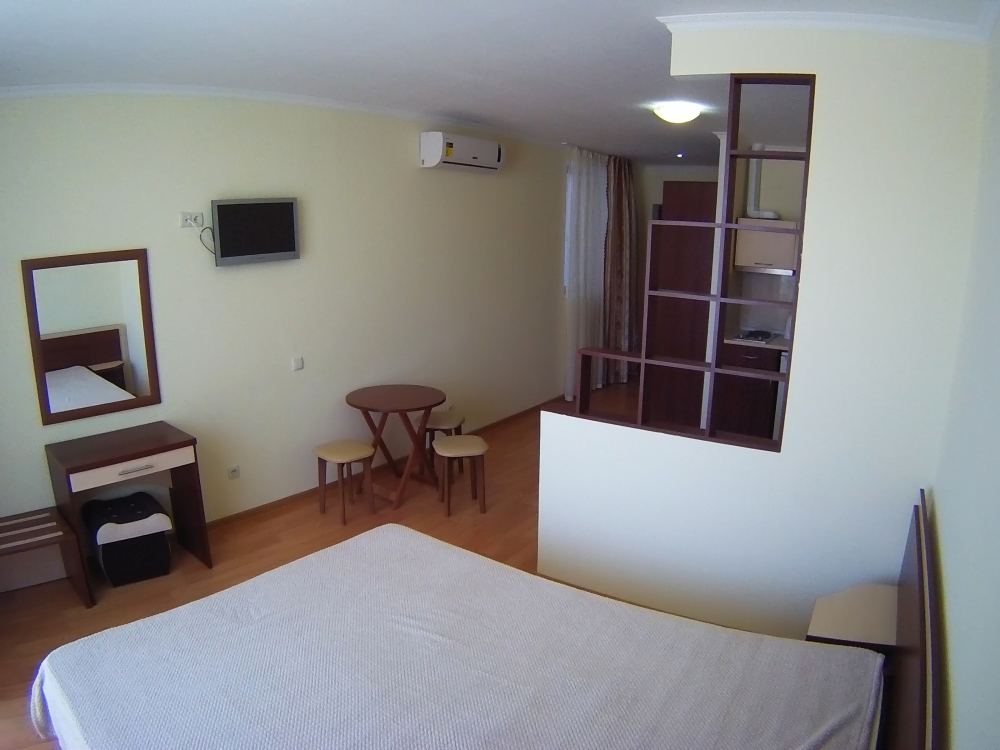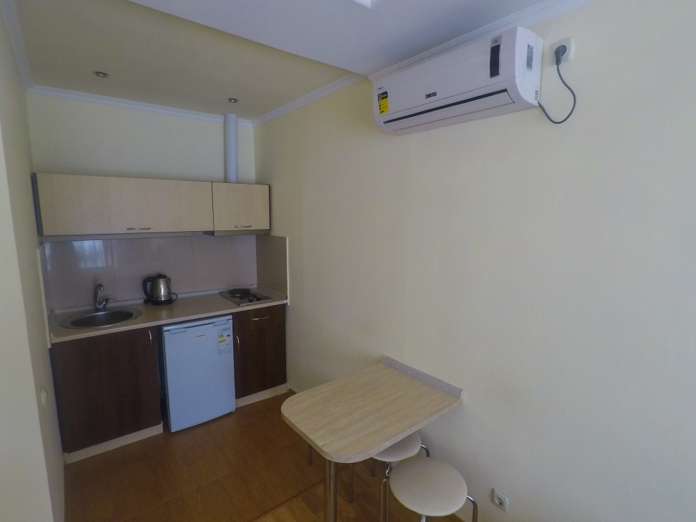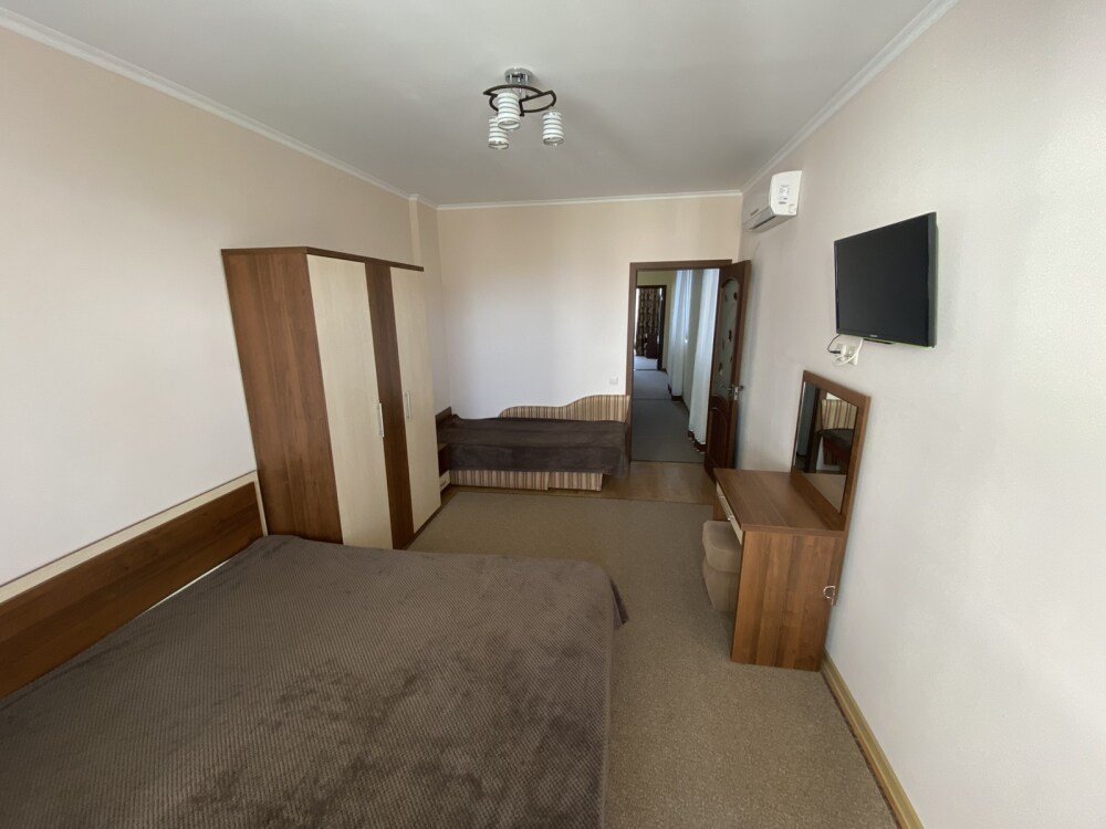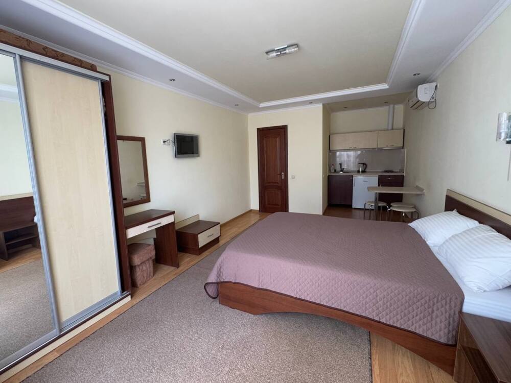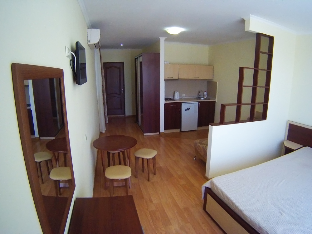 Санузел (унитаз, умывальник, душ). В номере имеется кондиционер, ж\к телевизор, обеденная зона (стол и три стула)
