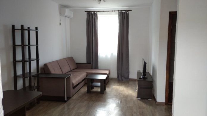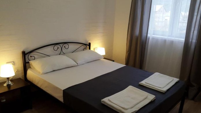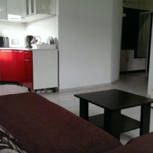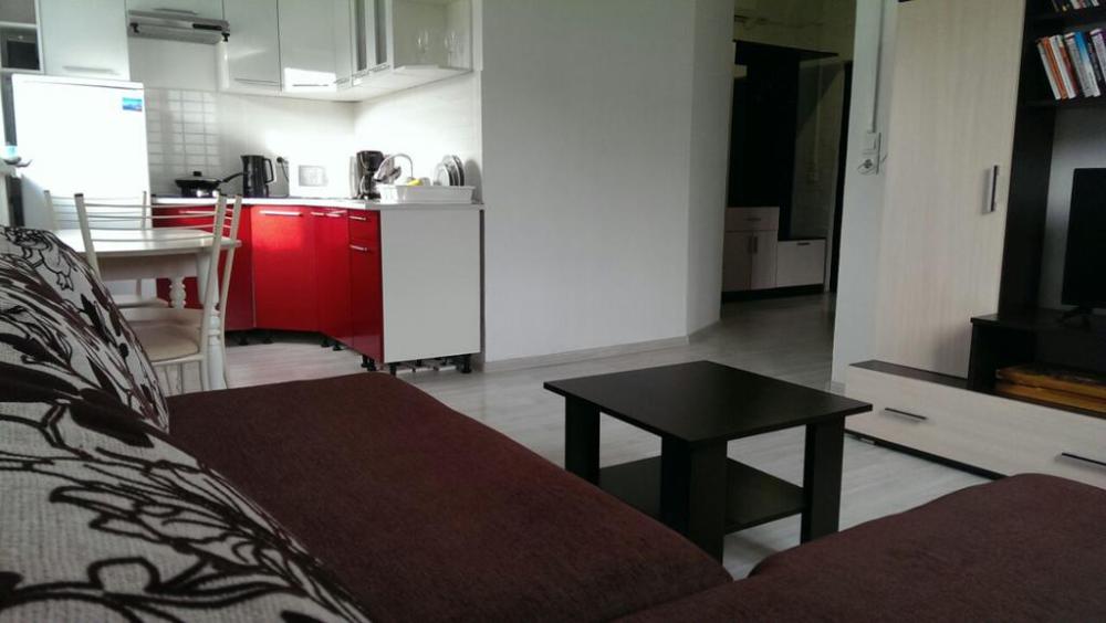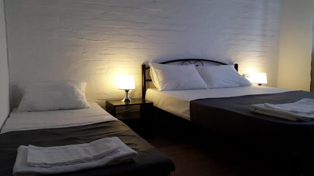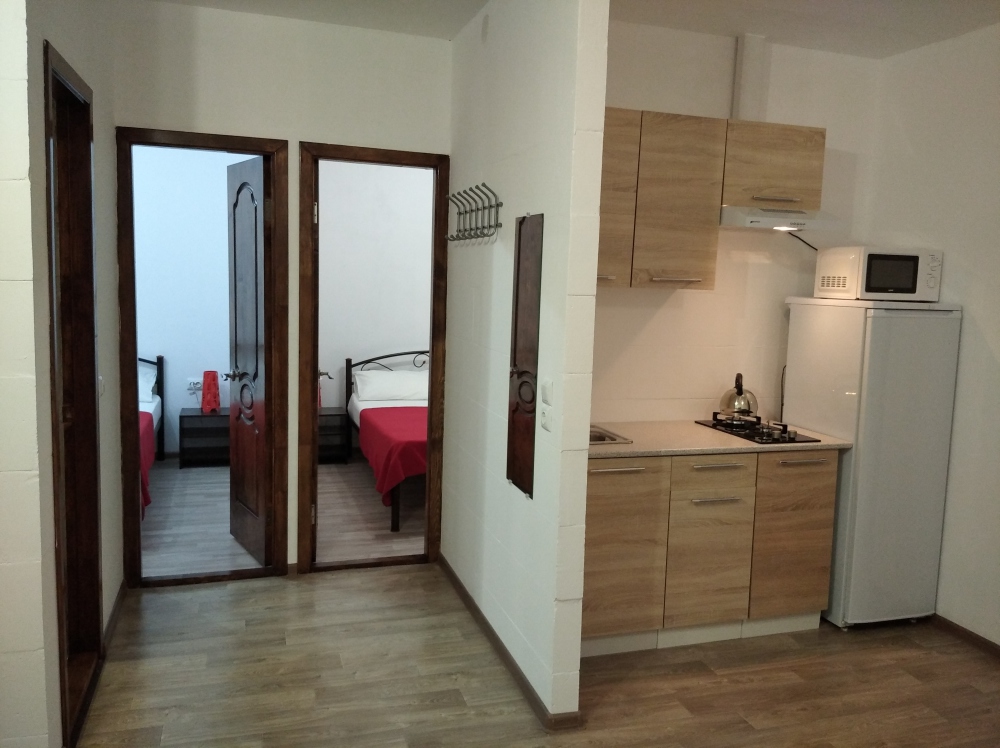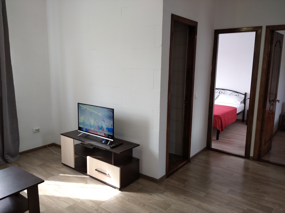 Трёхкомнатный апартамент состоит из гостиной, в которой находится раздвижной диван для 2 человек, кухня , кухонный уголок и две спальни. В каждой спальне двухспальная кровать 140×200, две прикроватные тумбочки, шифонер и большое зеркало.