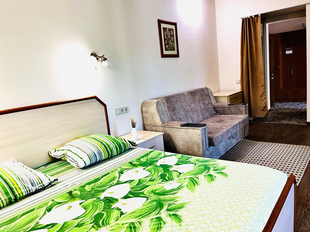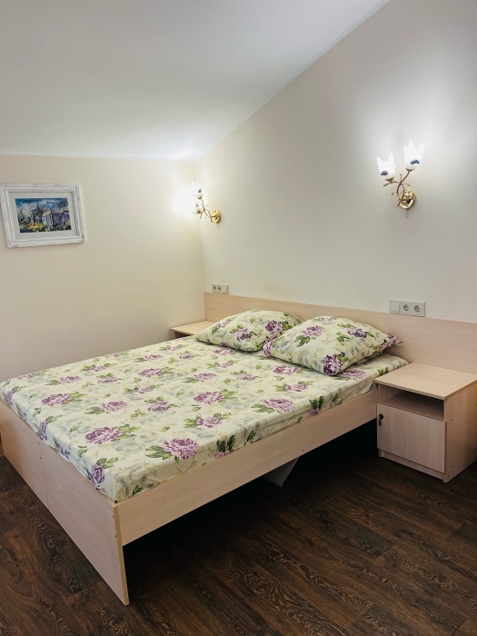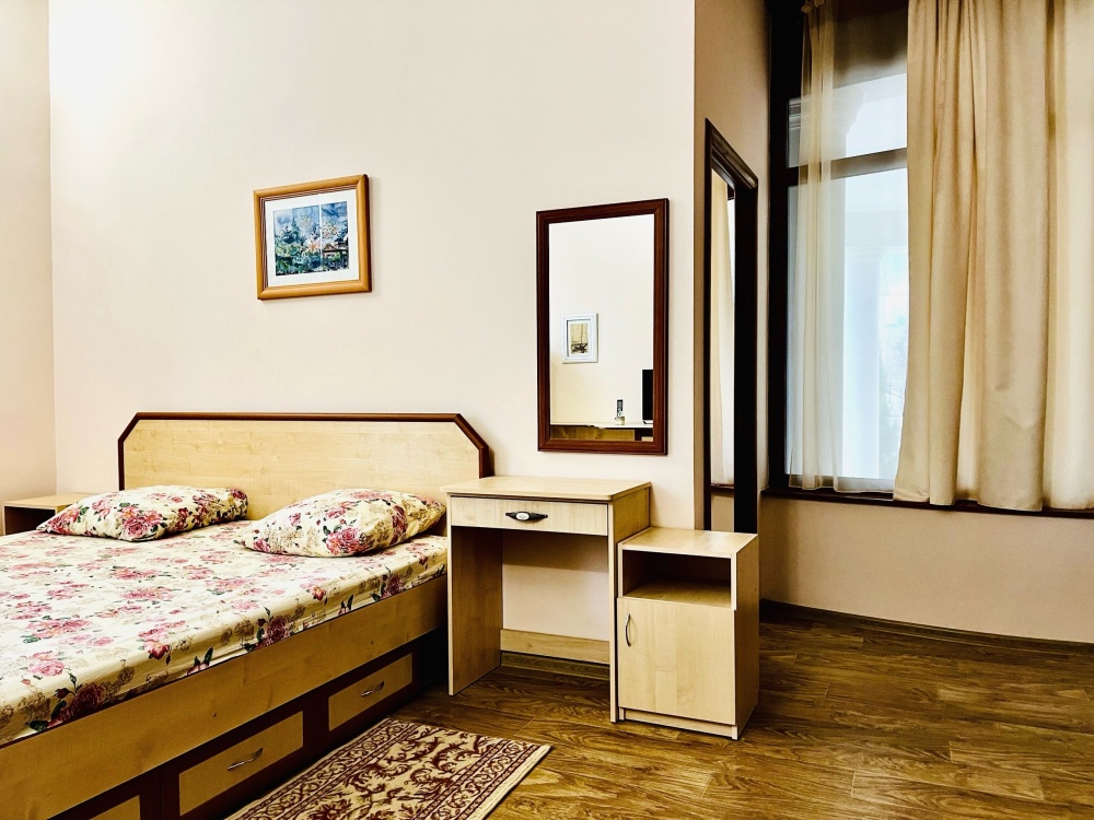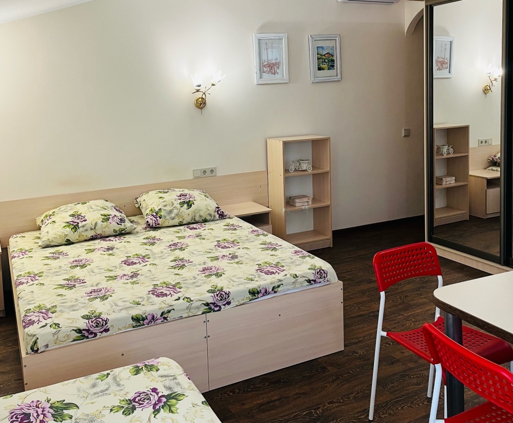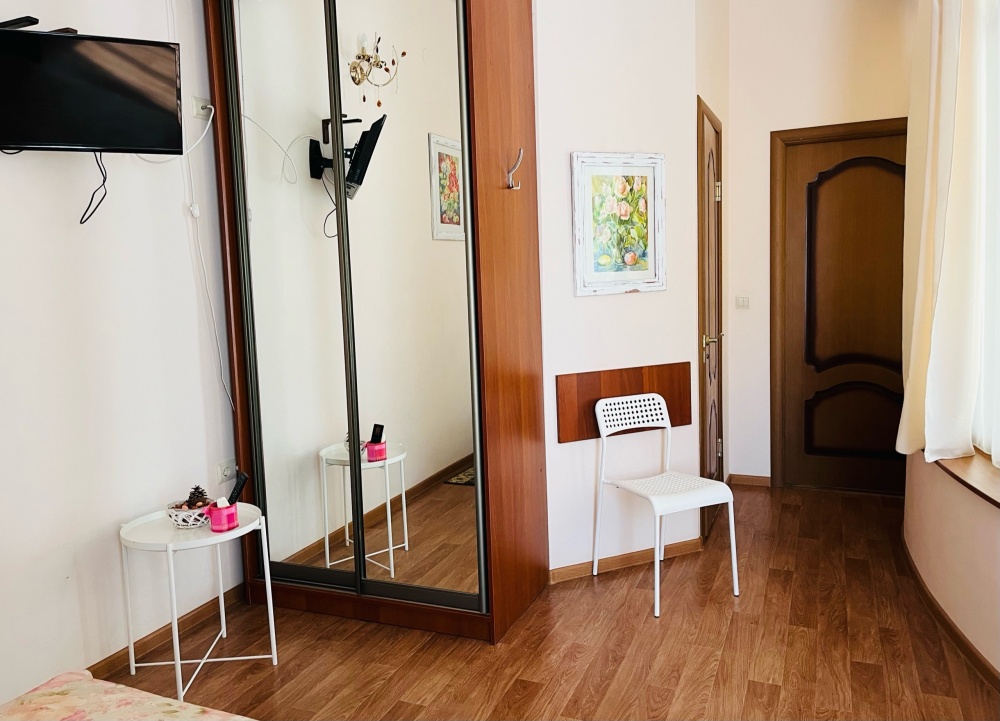 В НОМЕРЕ: вешалка для одежды, большая двуспальная и односпальная кровати с ортопедическими матрасами, ТВ, интернет, кондиционер, шкаф-купе, тумбочки, комод.