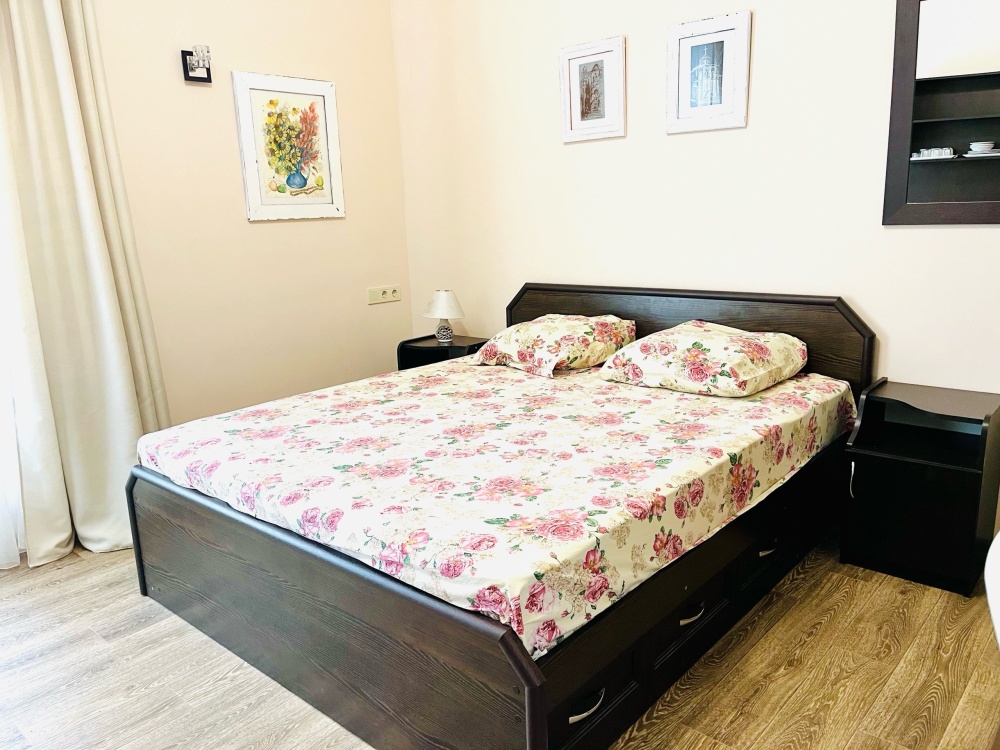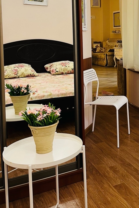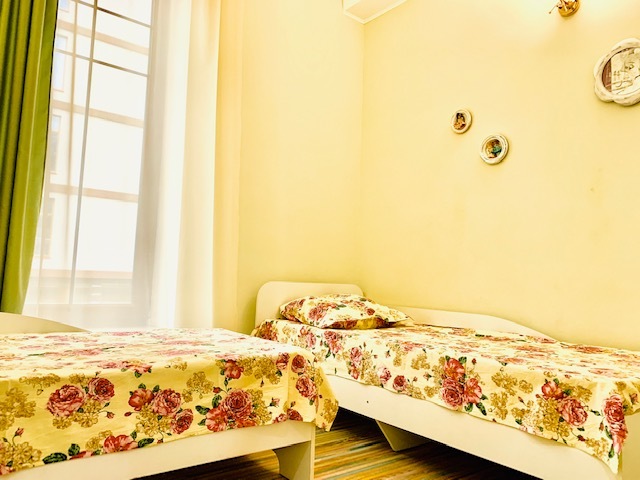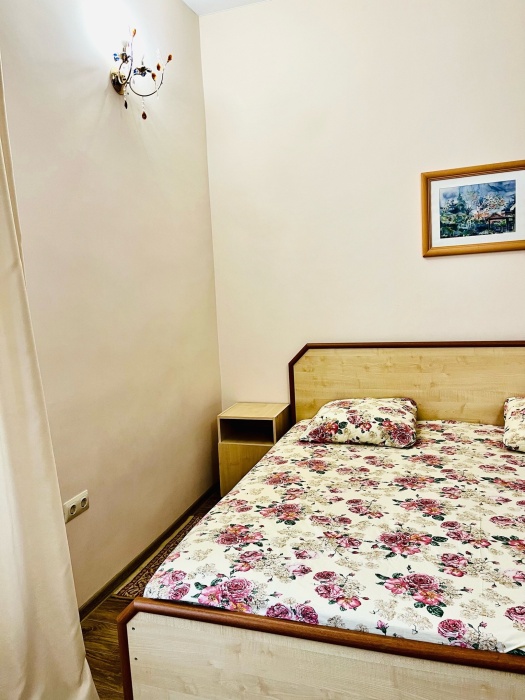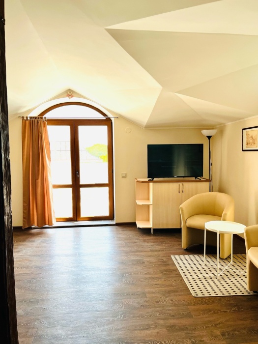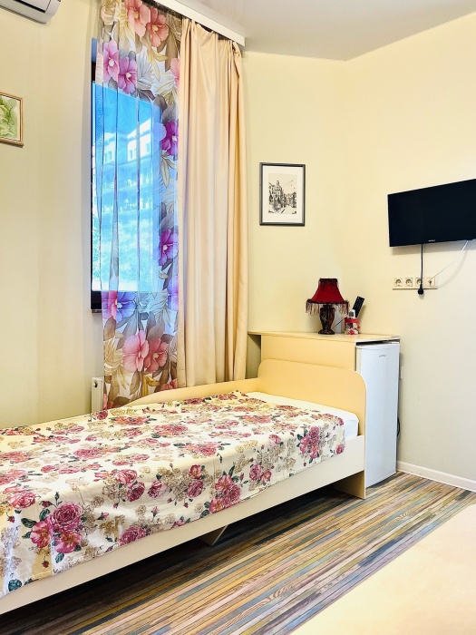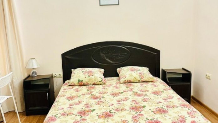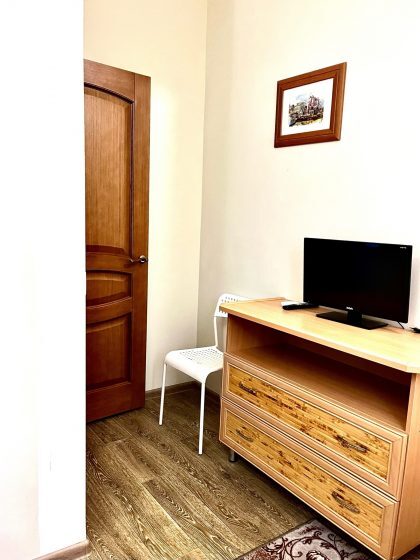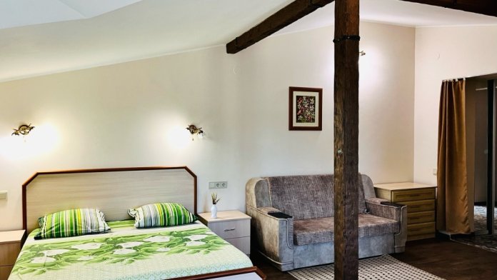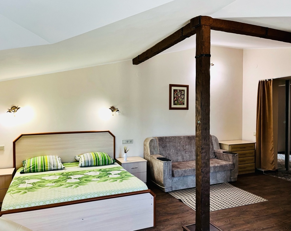 В НОМЕРЕ: вешалка для одежды, большая двуспальная и односпальная кровати с ортопедическими матрасами, ТВ, интернет, кондиционер, шкаф-купе, тумбочки, комод.