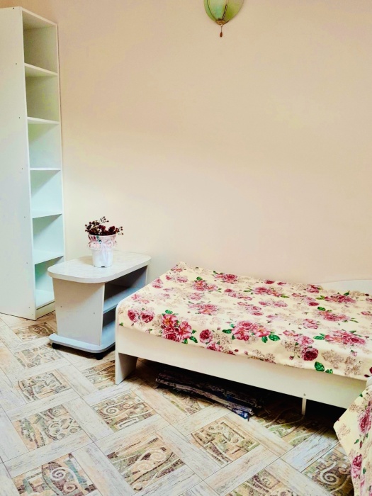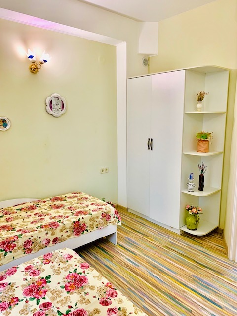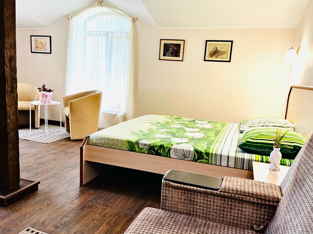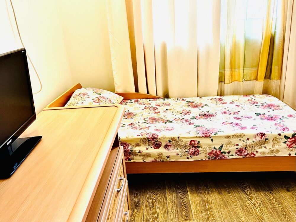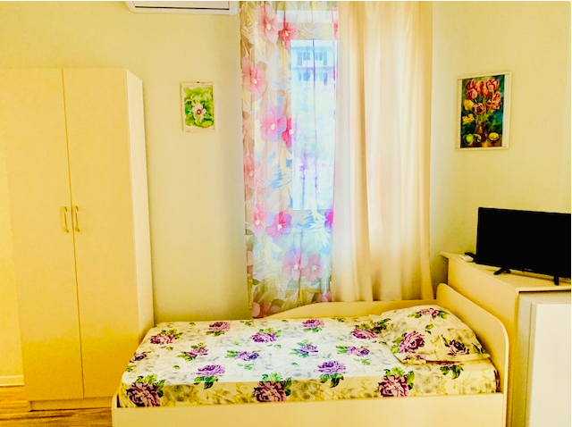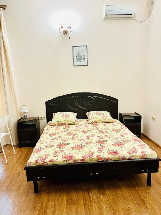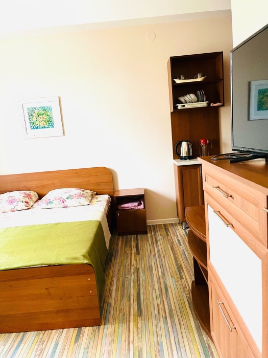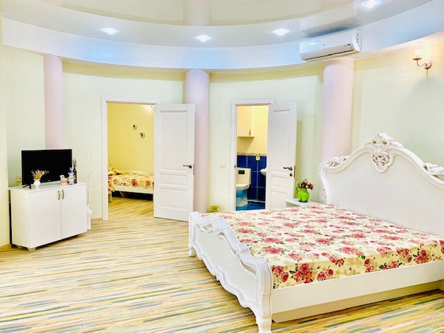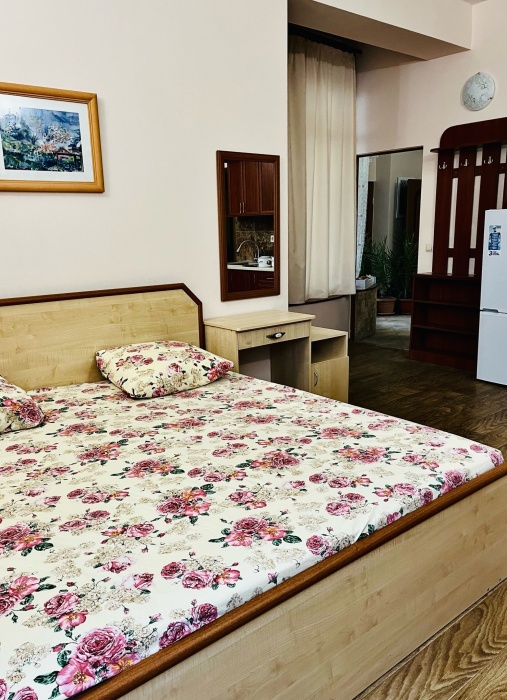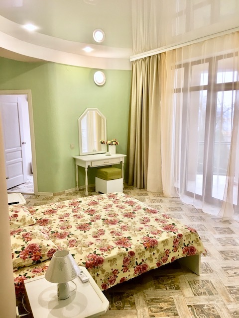 В НОМЕРЕ: вешалка для одежды, большая двуспальная и односпальная кровати с ортопедическими матрасами, ТВ, интернет, кондиционер ,шкаф-купе, тумбочки, комод.
