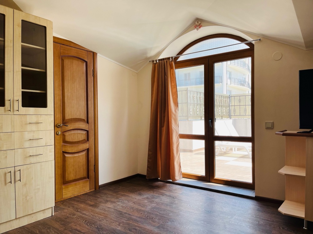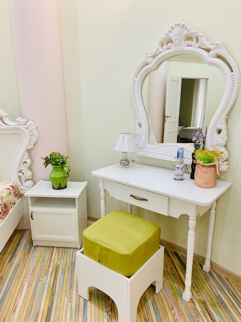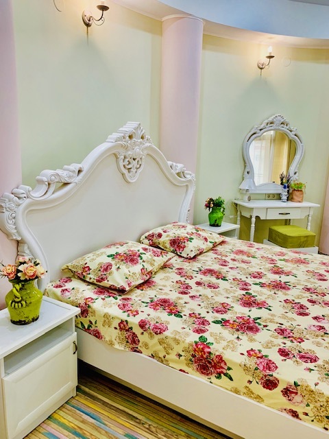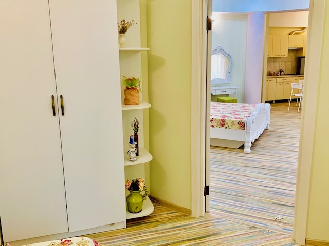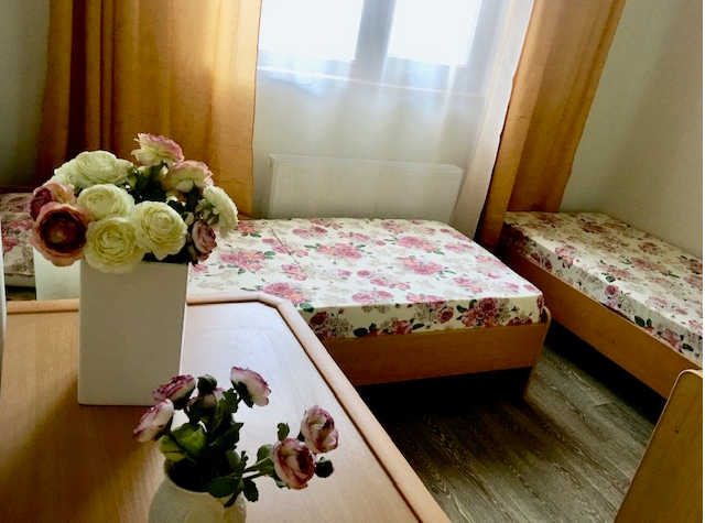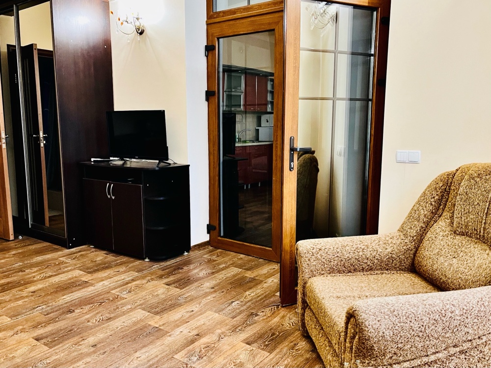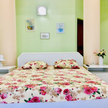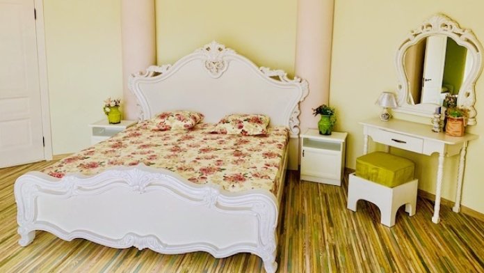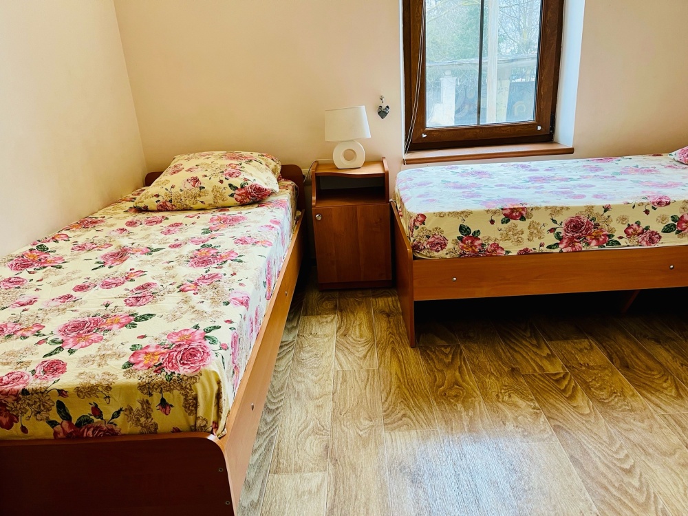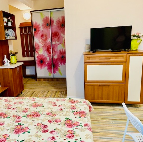В НОМЕРЕ: вешалка для одежды, большая двуспальная и односпальная кровати с ортопедическими матрасами, ТВ, интернет, кондиционер ,шкаф-купе, тумбочки, комод.