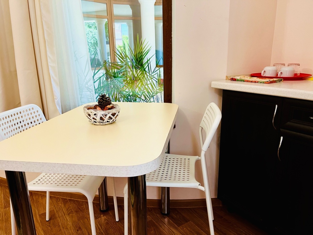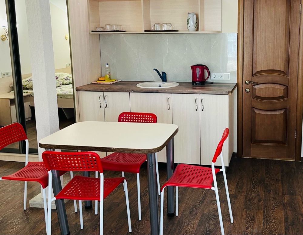 Полноценные кухни-столовые, где можно готовить всё что хочется, находятся в номерах Овальный, Морской дворик, Апартаменты,Семейный и Панорамный.