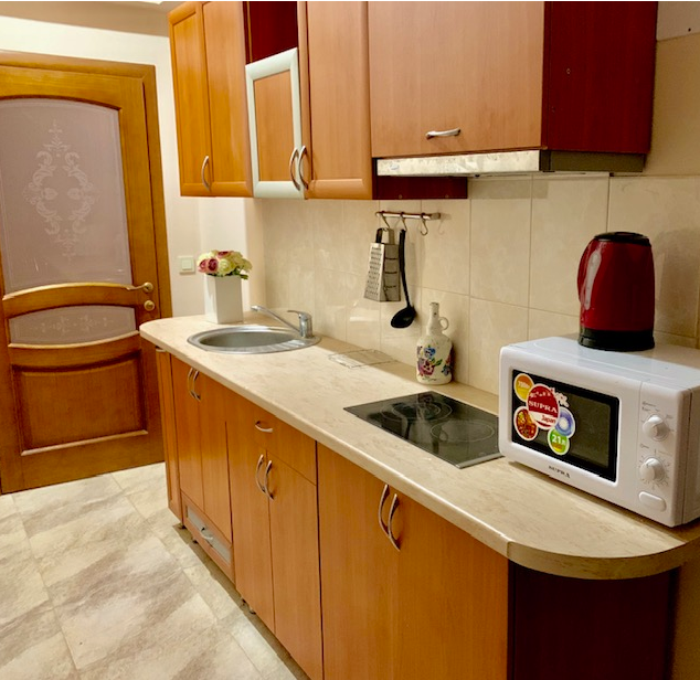 Кухня рядом с номером ,в ней электроплита, микроволновка, кухонная мебель ,раковина .