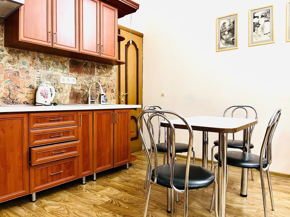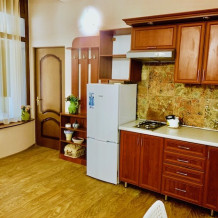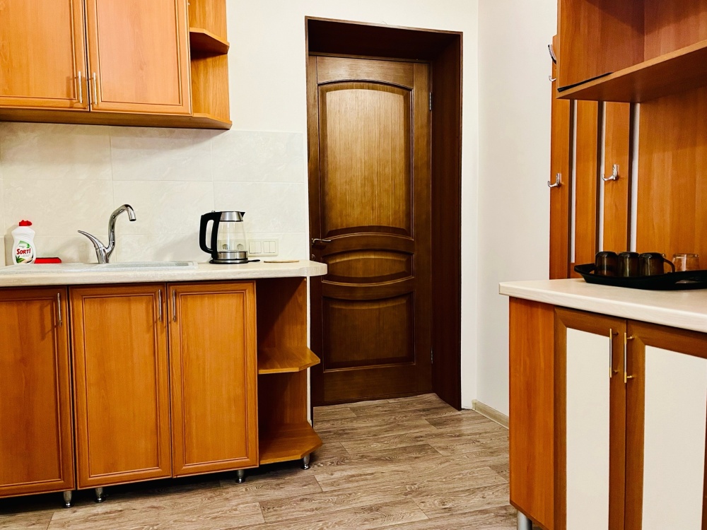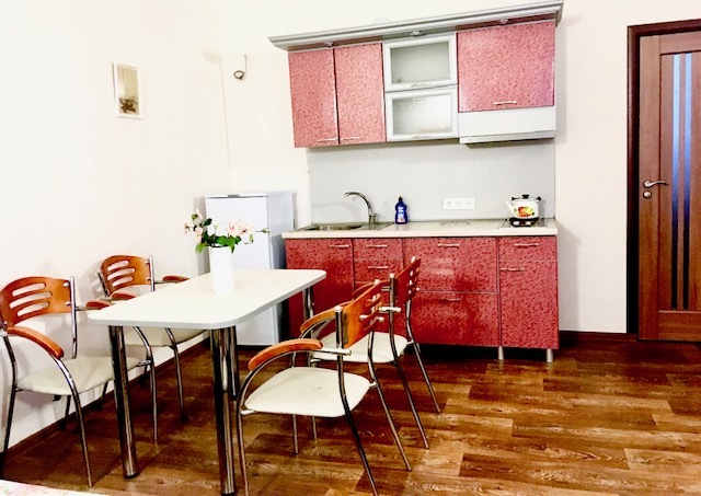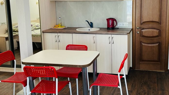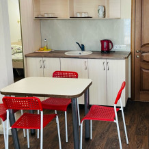Кухонная зона номера включает в себя холодильник ,электроплиту одно-комфорочную ,буфет для посуды, электро-чайник, мебель , обеденный стол со стульями ,столовую посуду и приборы .Для приготовления -две кастрюли Кухня укомплектована конвекционной электроплитой для приготовление детской кашки и супчика, диетпитания для людей с проблемами пищеварения (без использования сковороды).