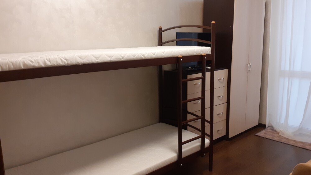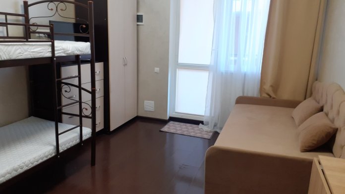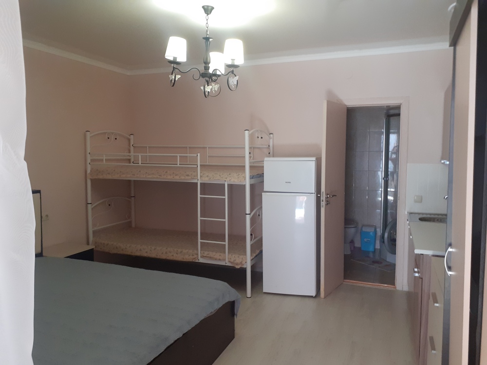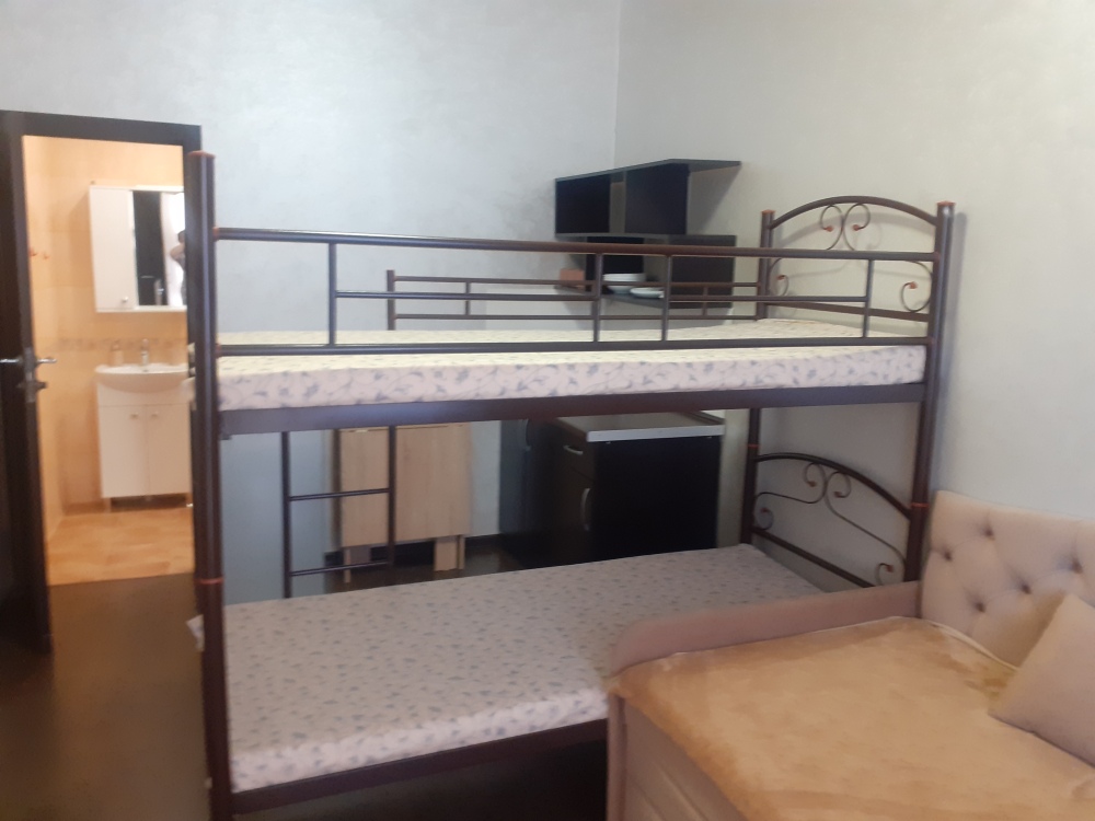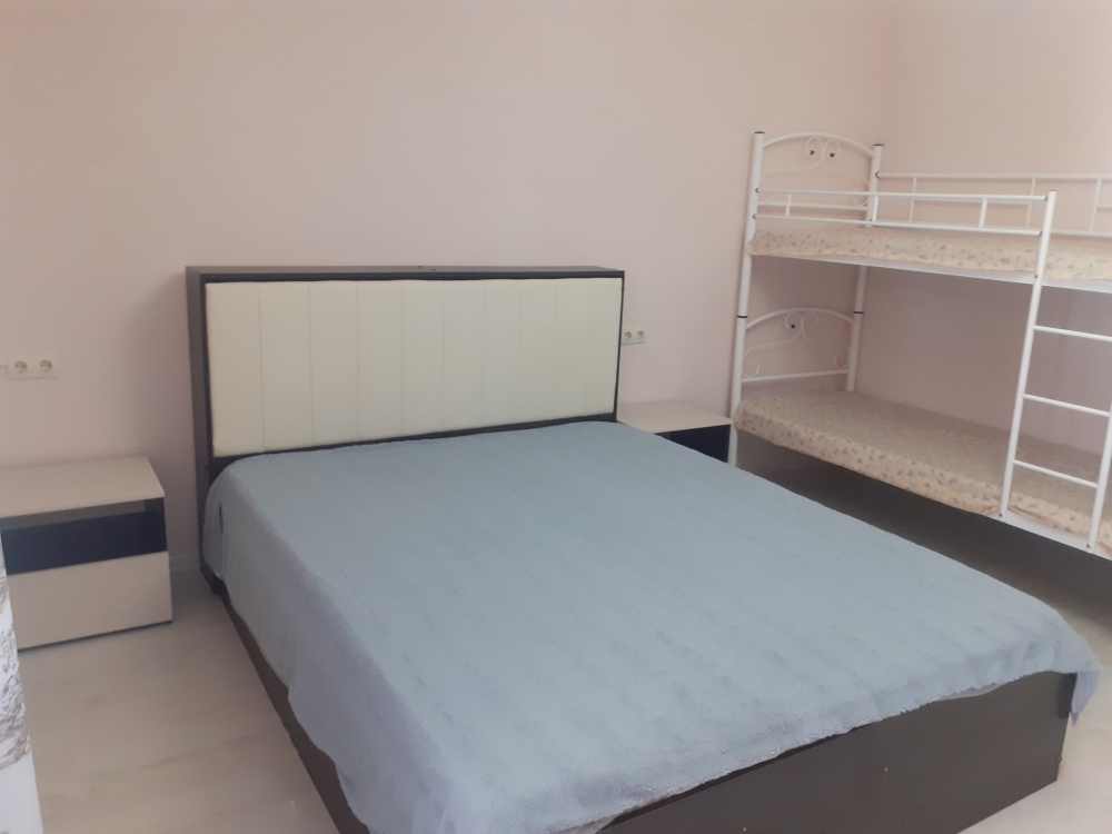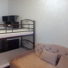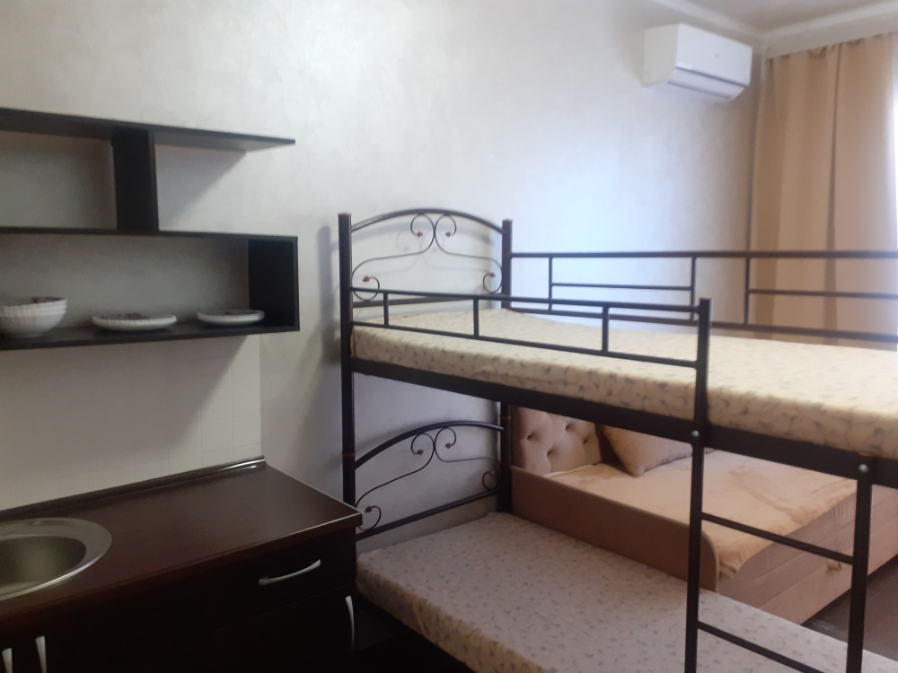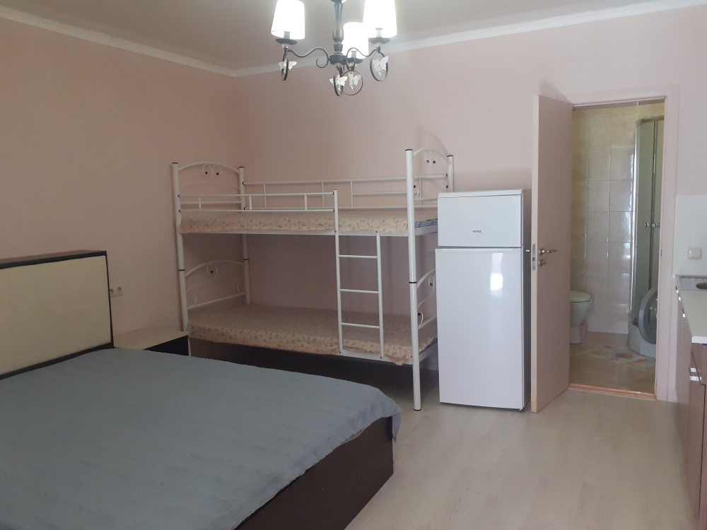 В номерах: раскладной диван+двухъярусная кровать, необходимая мебель( шкаф, комод, стол, стулья), маленькая кухня, душевая комната с туалетом, холодильник, кондиционер, интернет, TV кабельное, вся необходимая посуда. Апартаменты четырехместные . До моря 50 метров