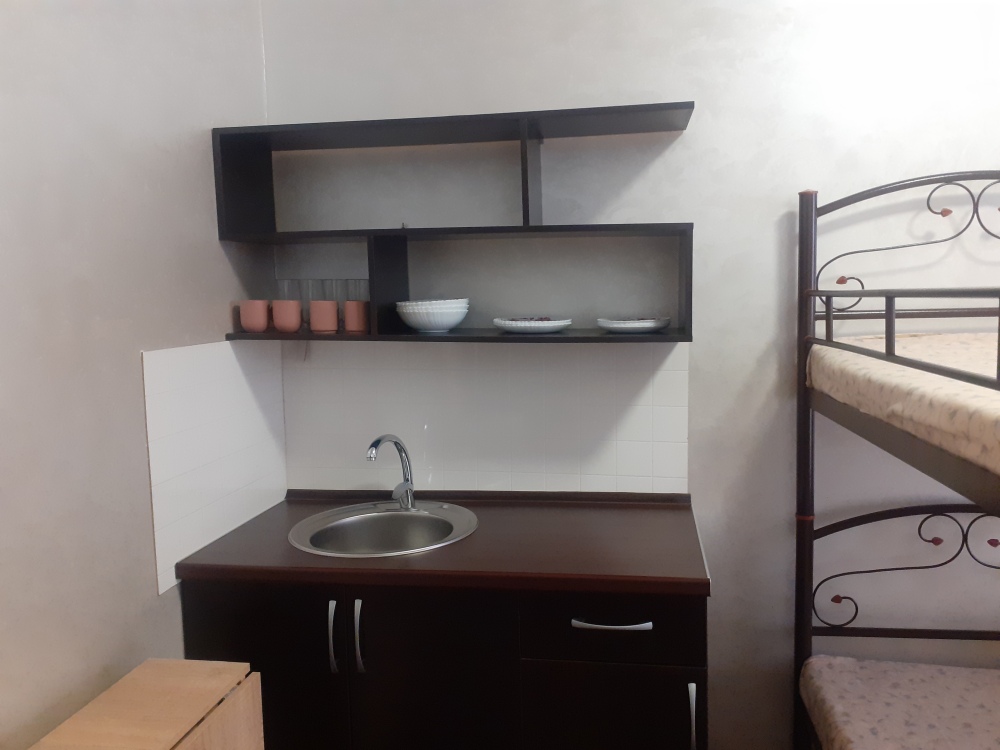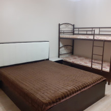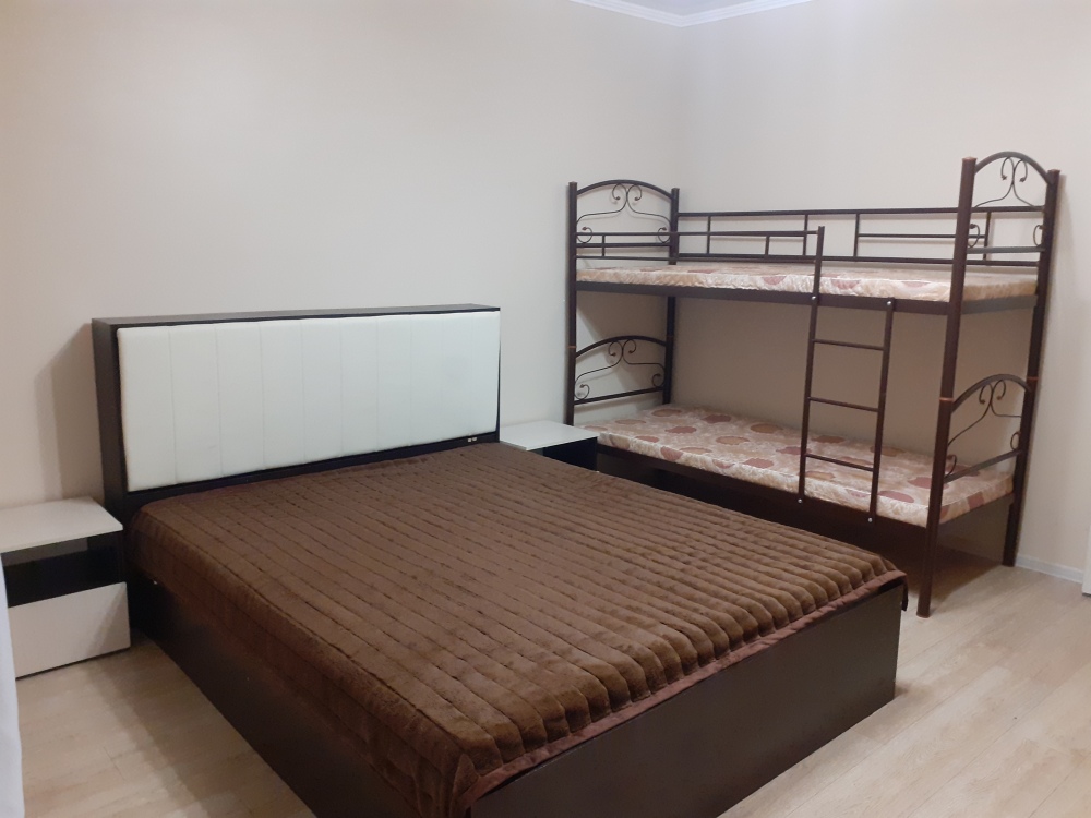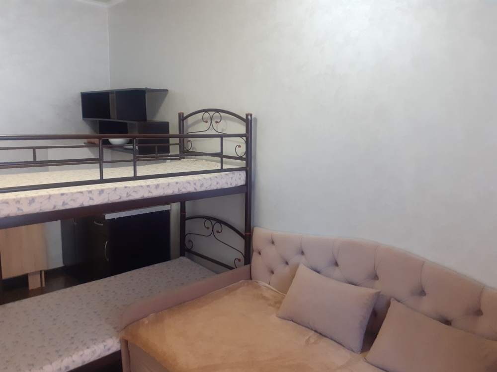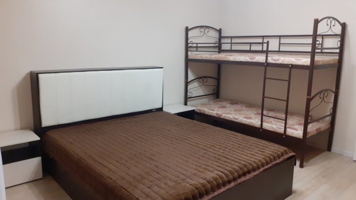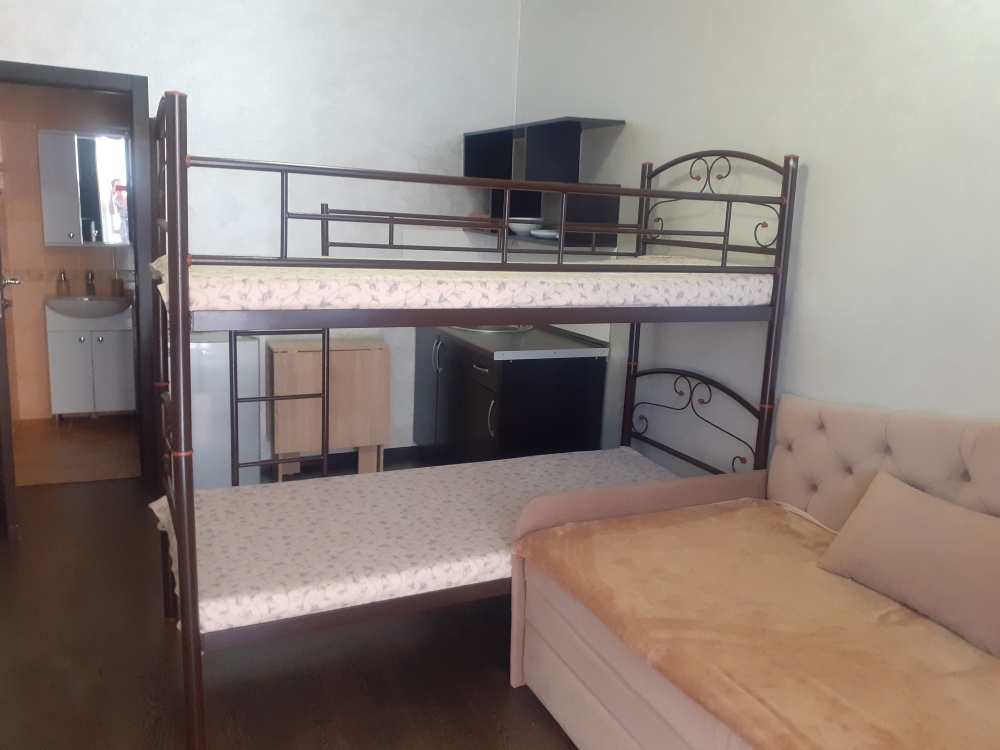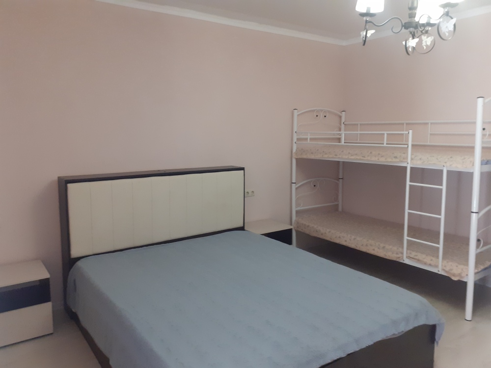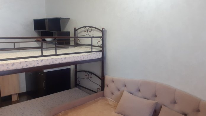 В номерах: раскладной диван+двухъярусная кровать, необходимая мебель( шкаф, комод, стол, стулья), маленькая кухня, душевая комната с туалетом, холодильник, кондиционер, интернет, TV кабельное, вся необходимая посуда. Апартаменты четырехместные . До моря 50 метров
