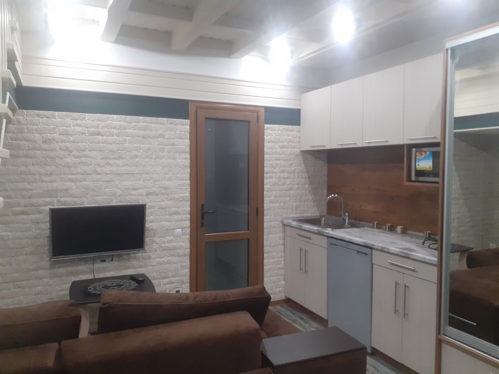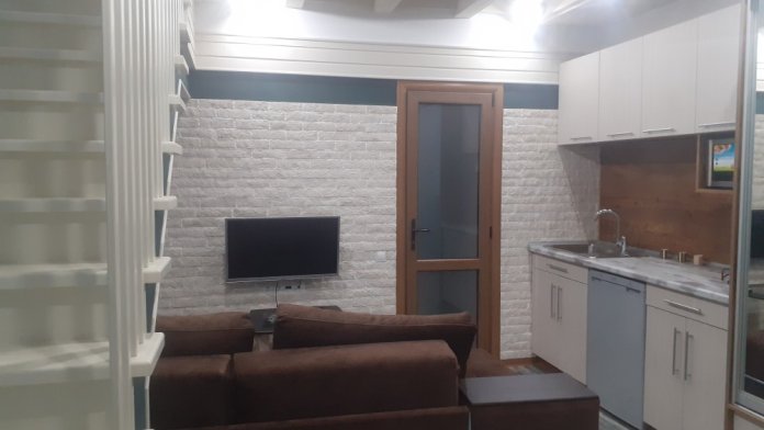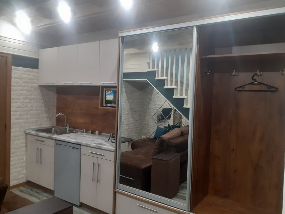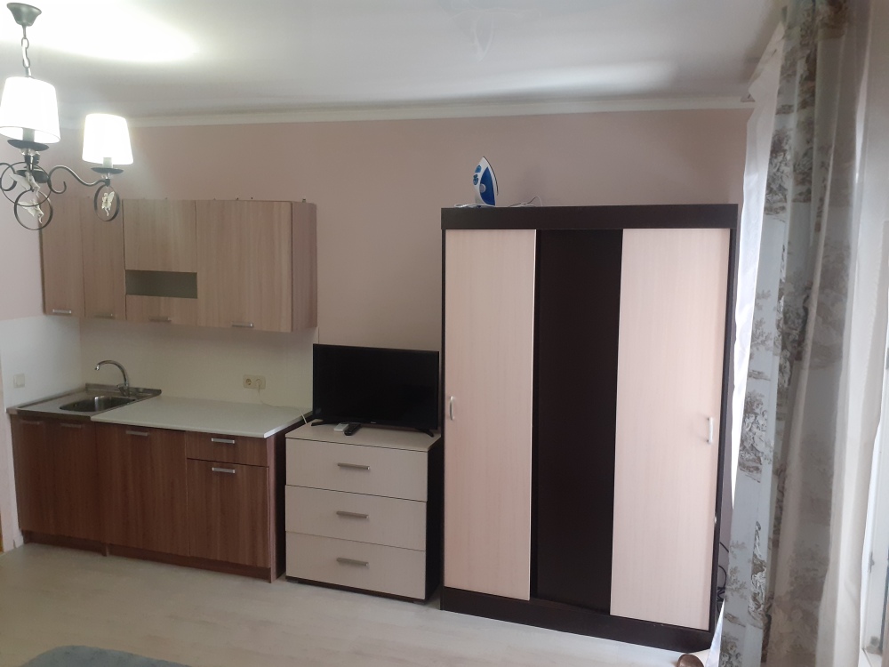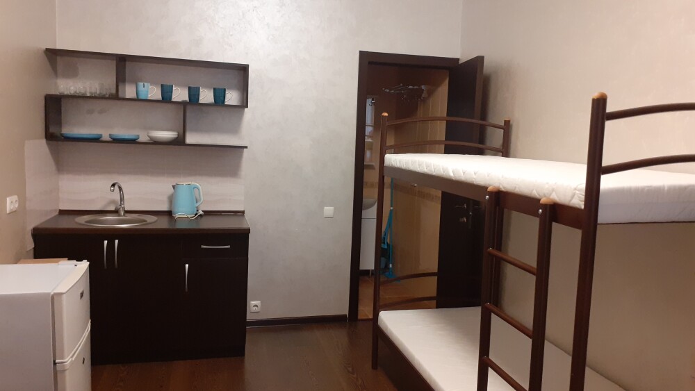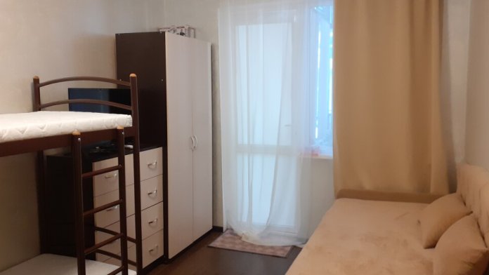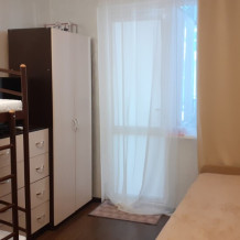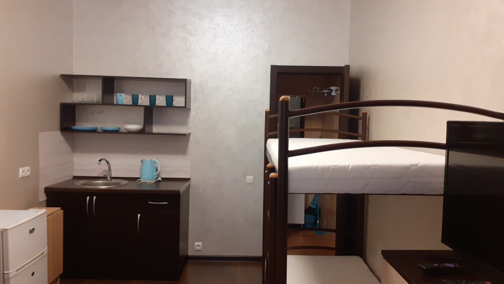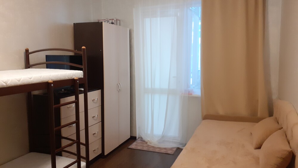 В номерах: раскладной диван+двухъярусная кровать, необходимая мебель( шкаф, комод, стол, стулья), маленькая кухня, душевая комната с туалетом, холодильник, кондиционер, интернет, TV кабельное, вся необходимая посуда. Апартаменты четырехместные . До моря 50 метров