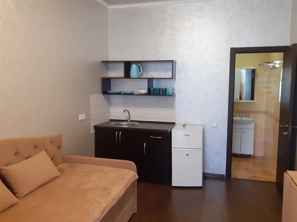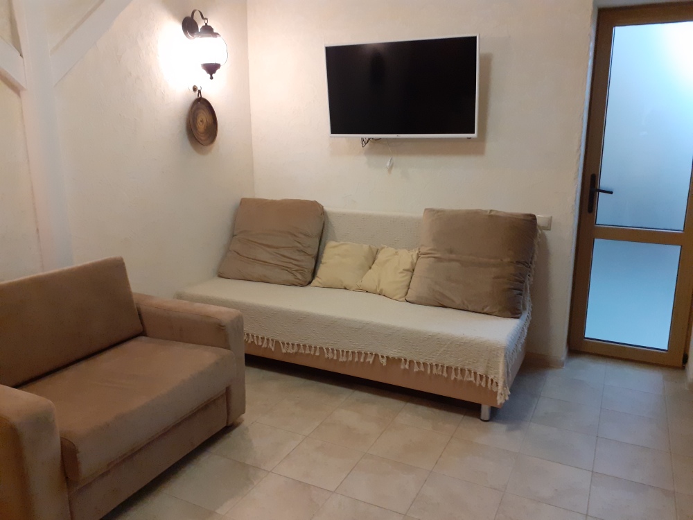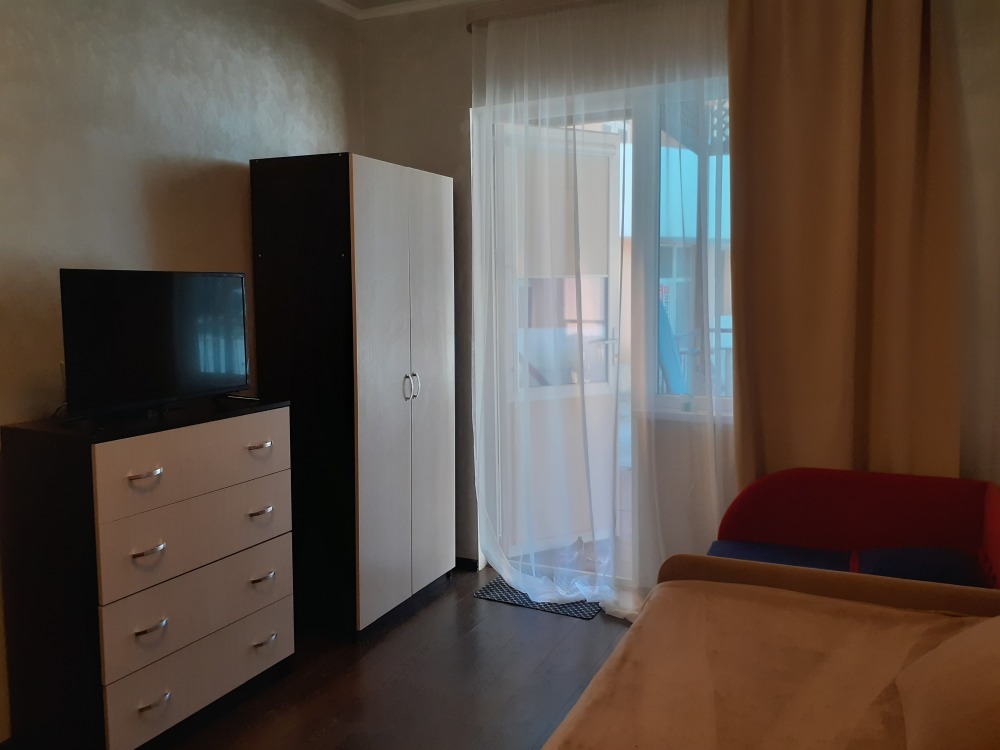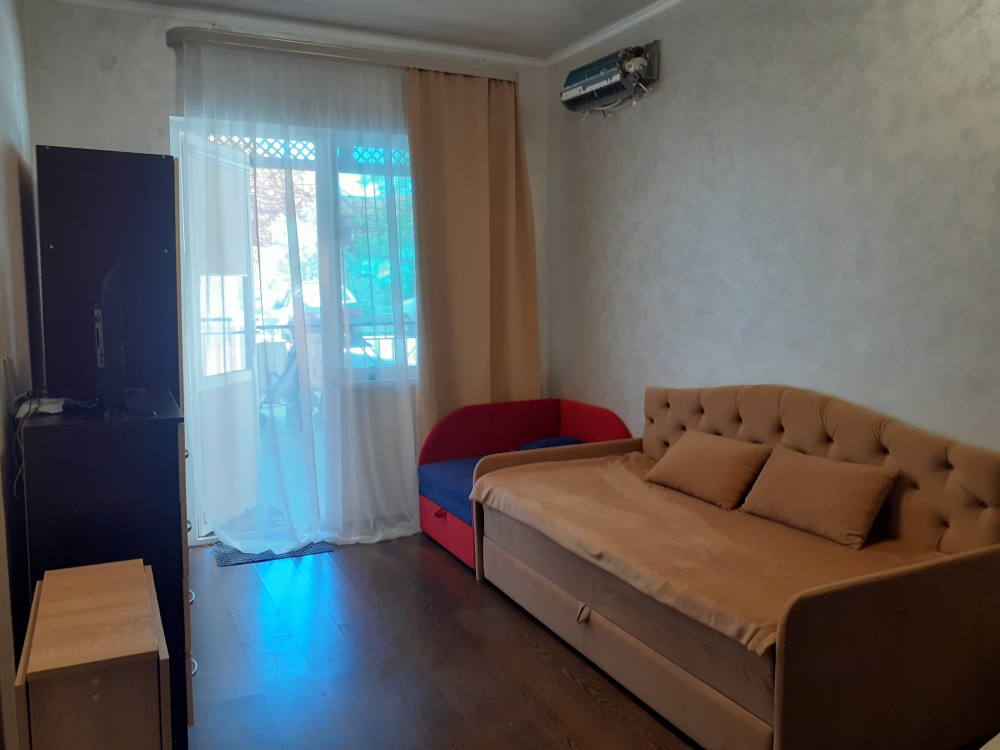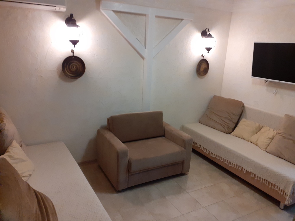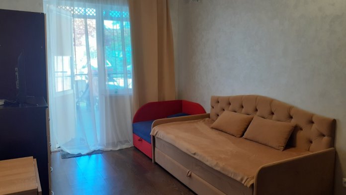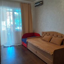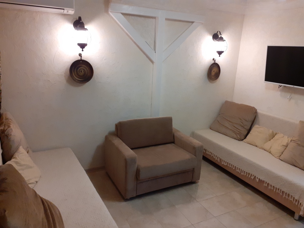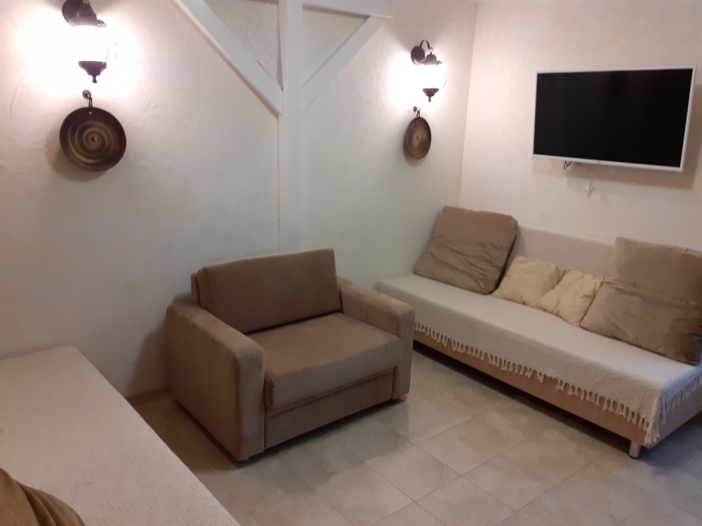 В номерах: раскладной диван+доп. место, необходимая мебель( шкаф, комод, стол, стулья), маленькая кухня, душевая комната с туалетом, холодильник, кондиционер, интернет, TV кабельное, вся необходимая посуда. Апартаменты трёхместные. До моря 50 метров