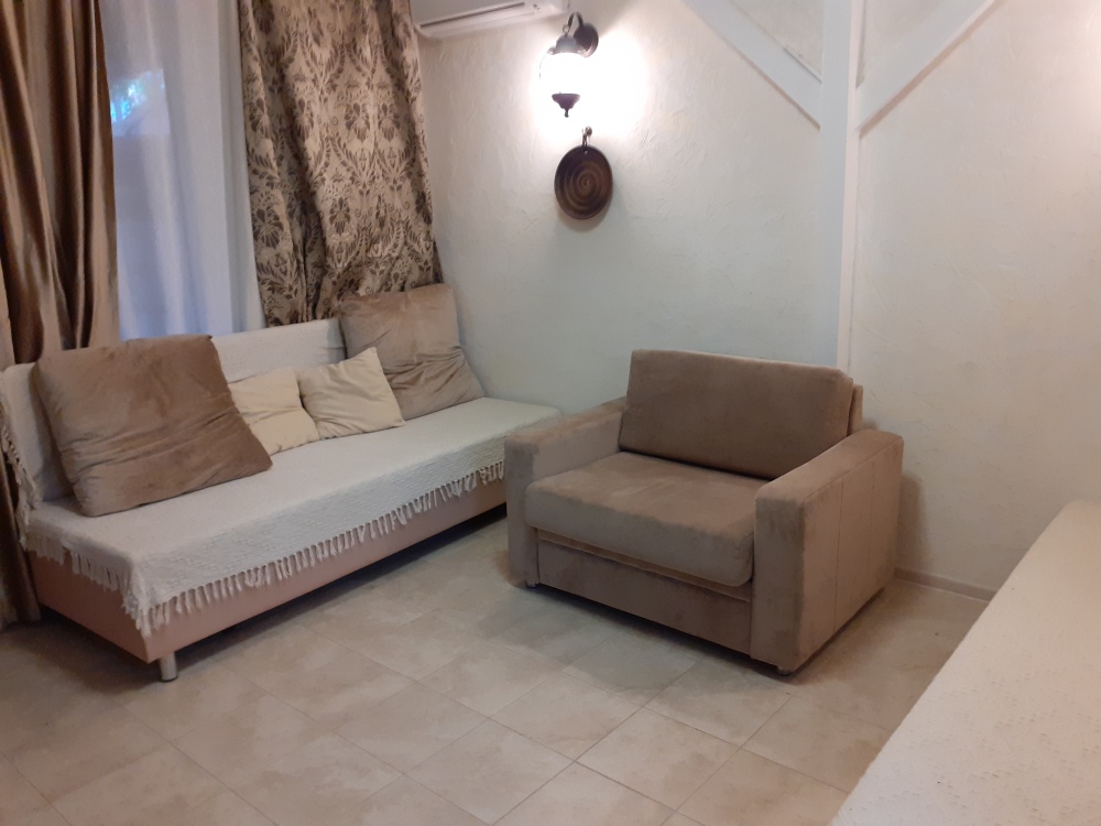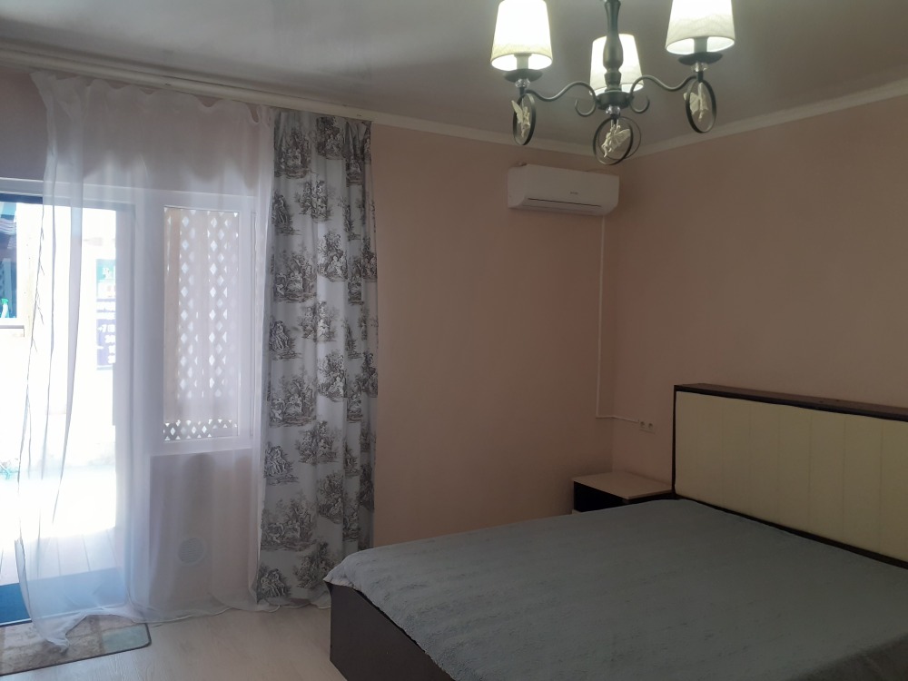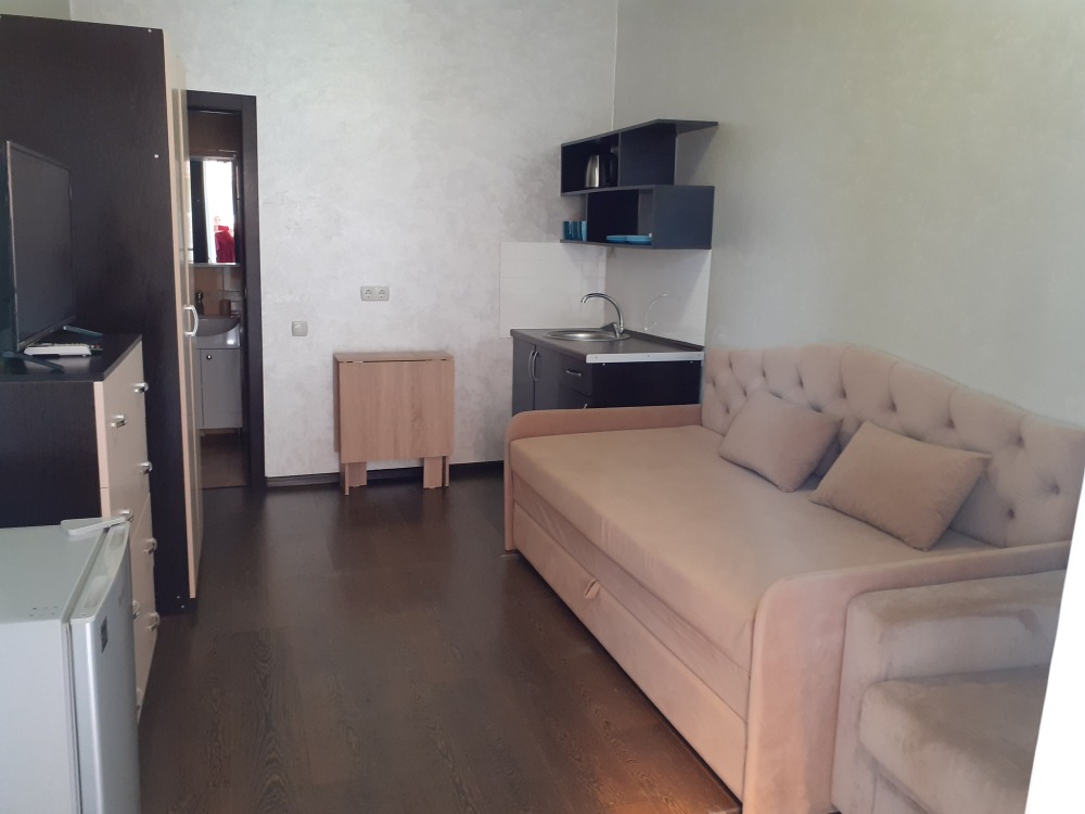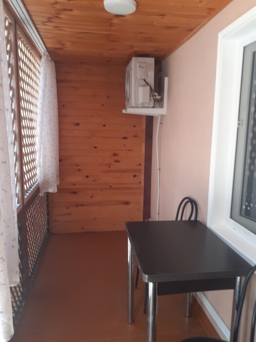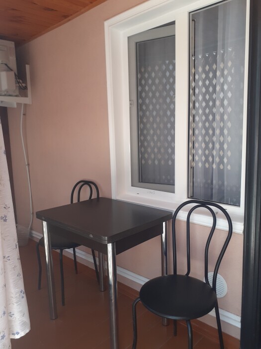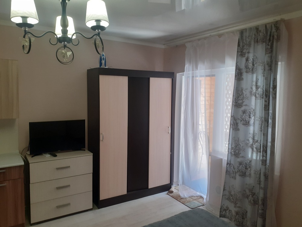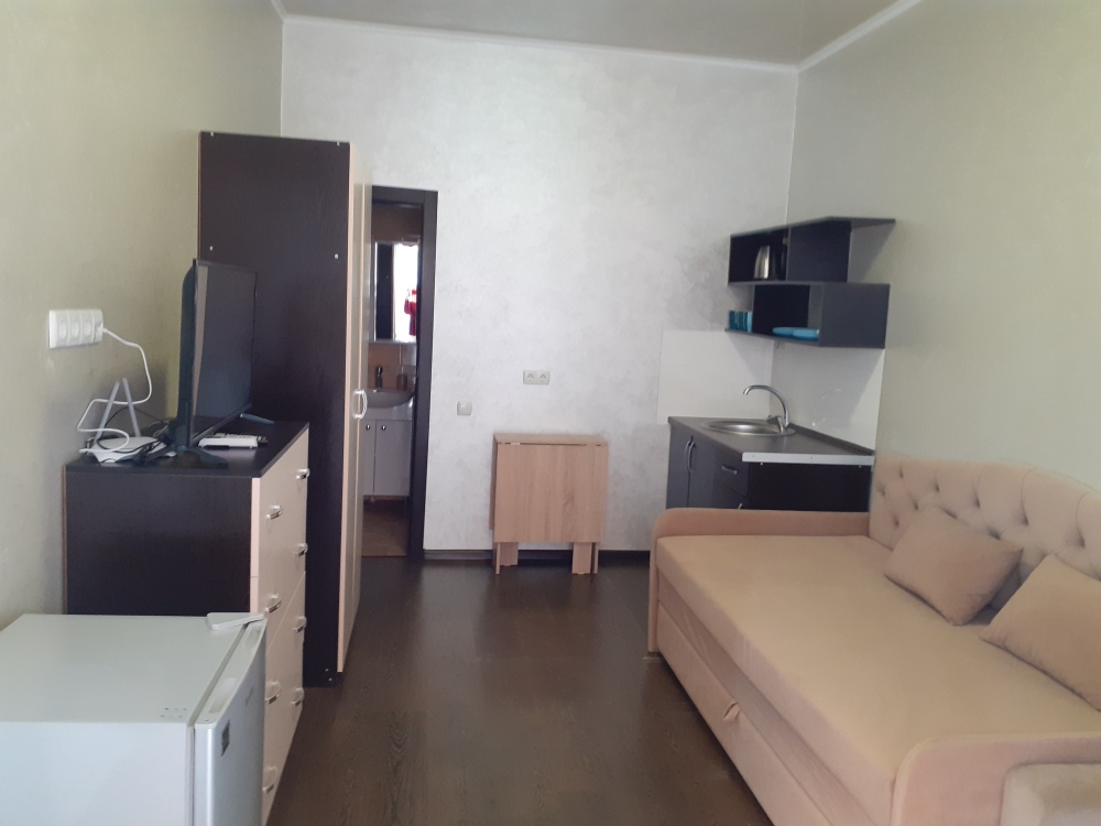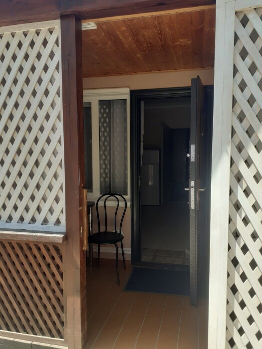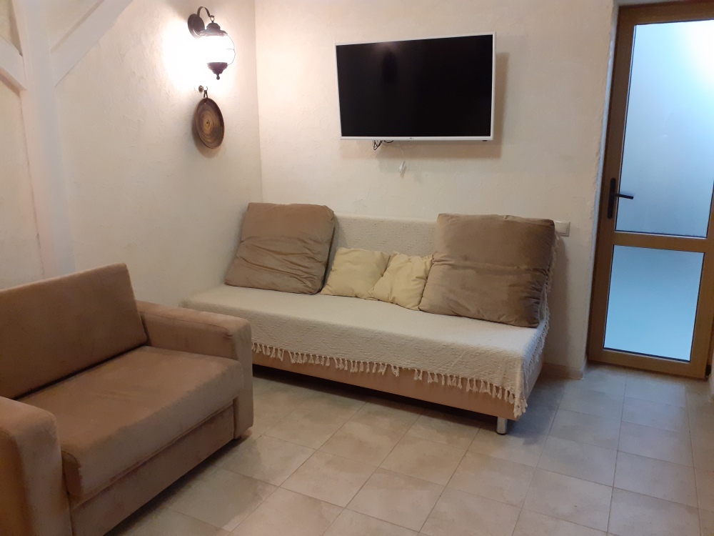 В номерах: раскладной диван+доп. место, необходимая мебель( шкаф, комод, стол, стулья), маленькая кухня, душевая комната с туалетом, холодильник, кондиционер, интернет, TV кабельное, вся необходимая посуда. Апартаменты трёхместные. До моря 50 метров