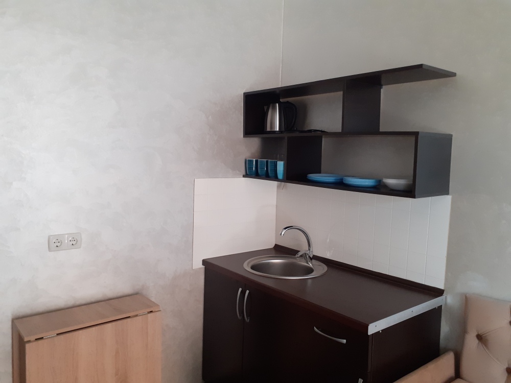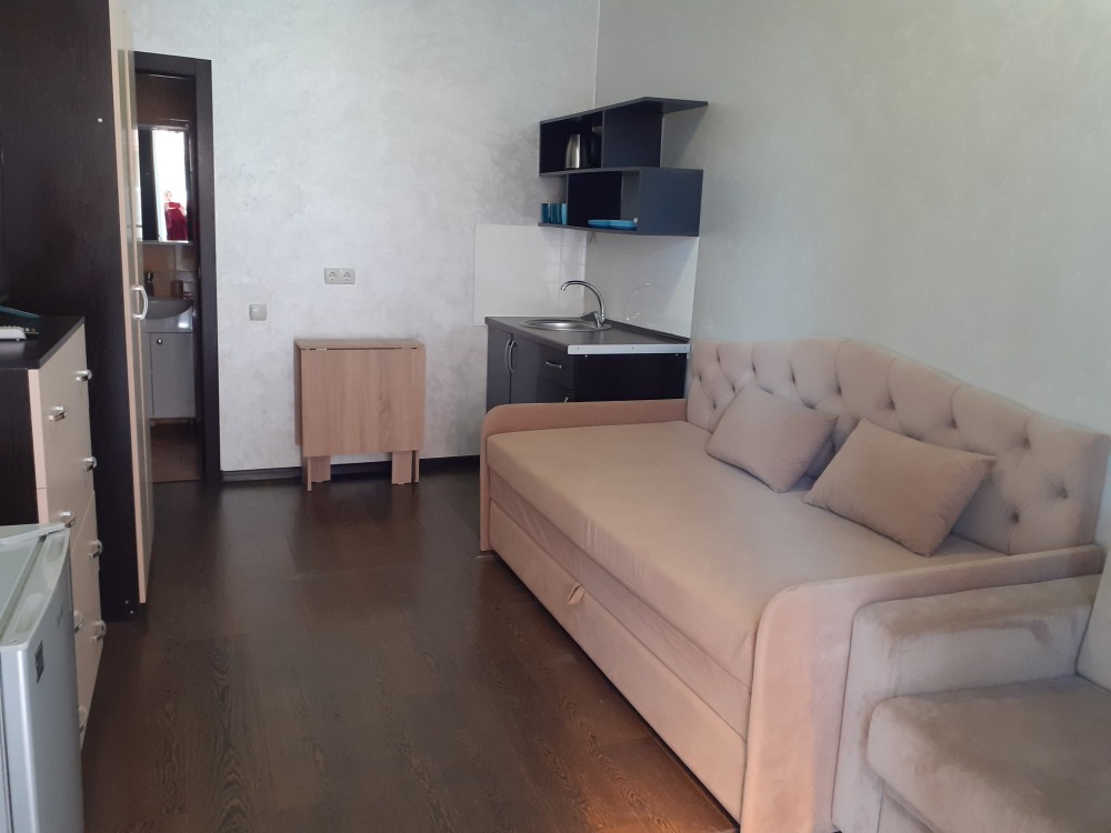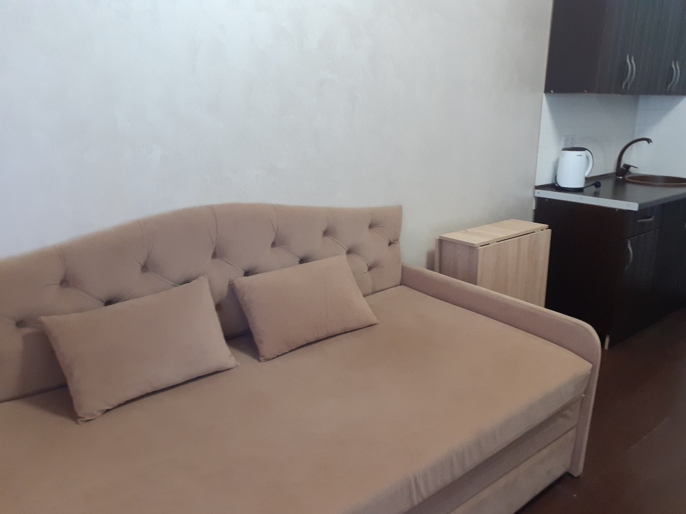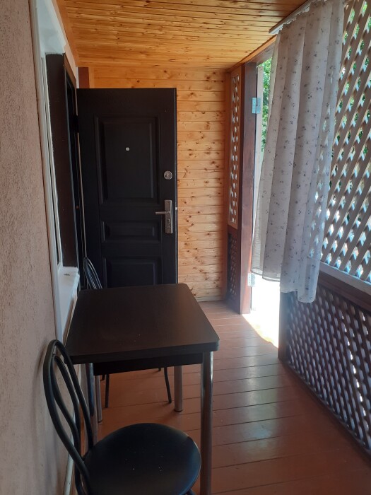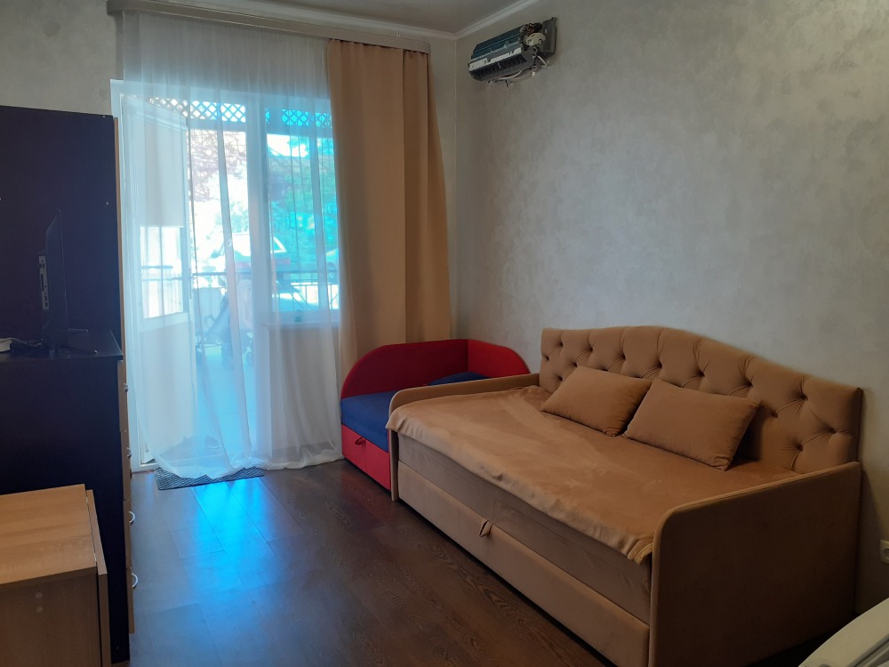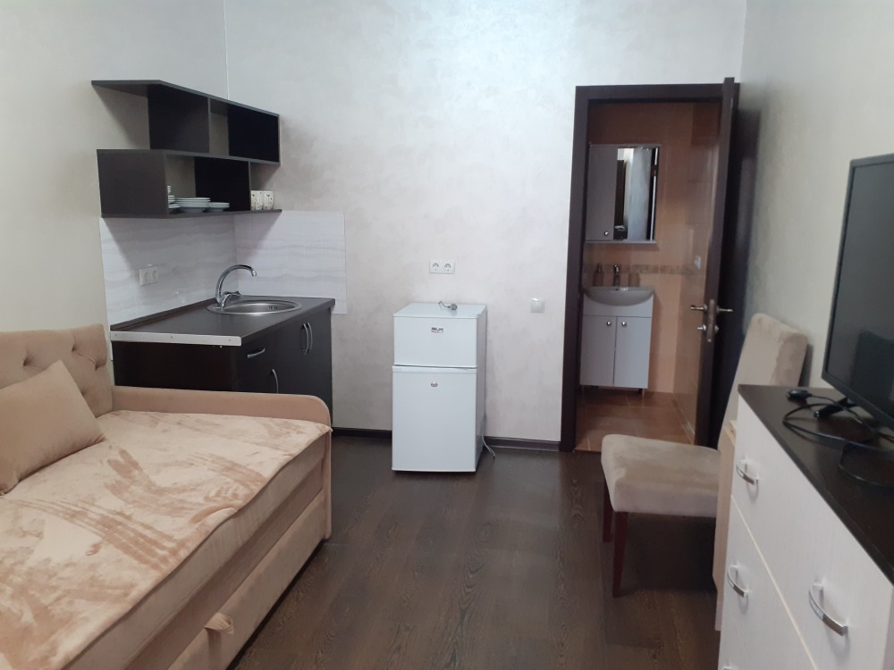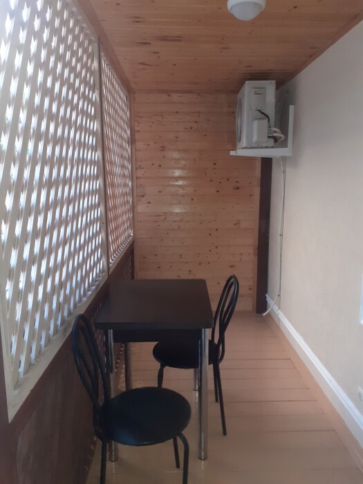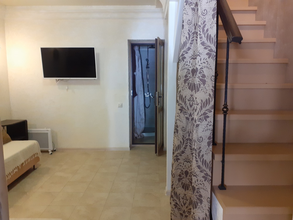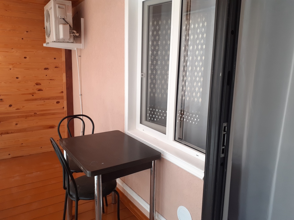В номерах: раскладной диван+доп. место, необходимая мебель( шкаф, комод, стол, стулья), маленькая кухня, душевая комната с туалетом, холодильник, кондиционер, интернет, TV кабельное, вся необходимая посуда. Апартаменты трёхместные. До моря 50 метров