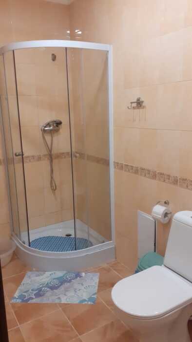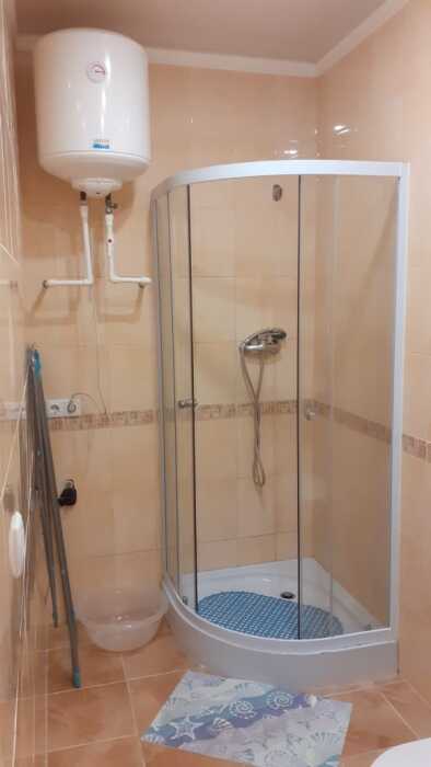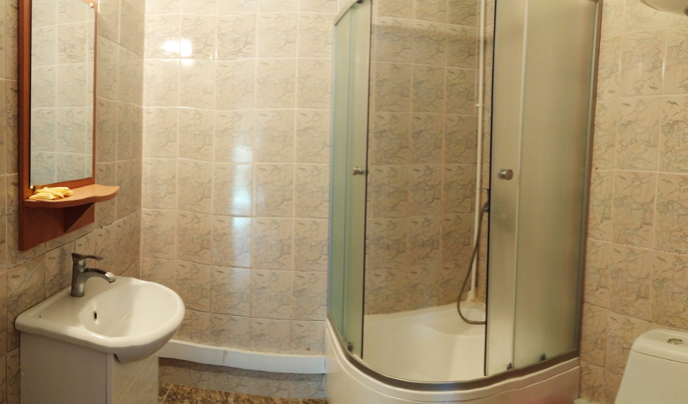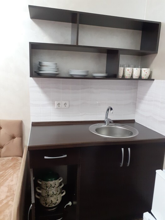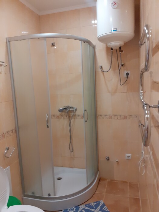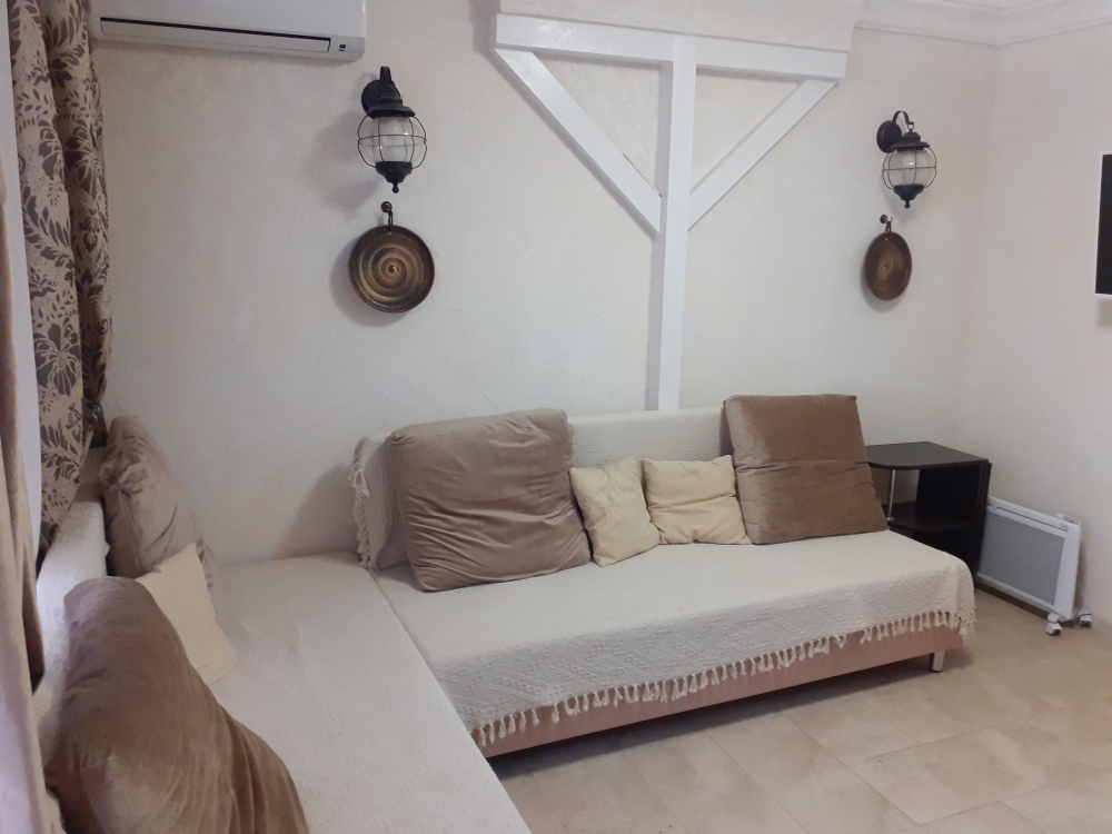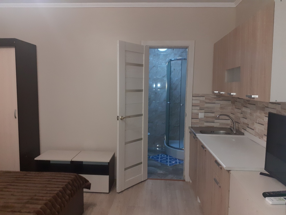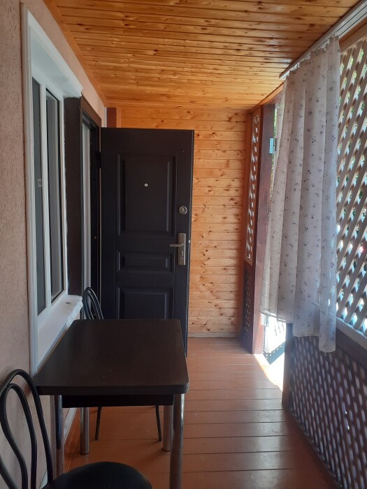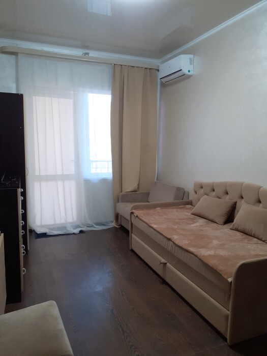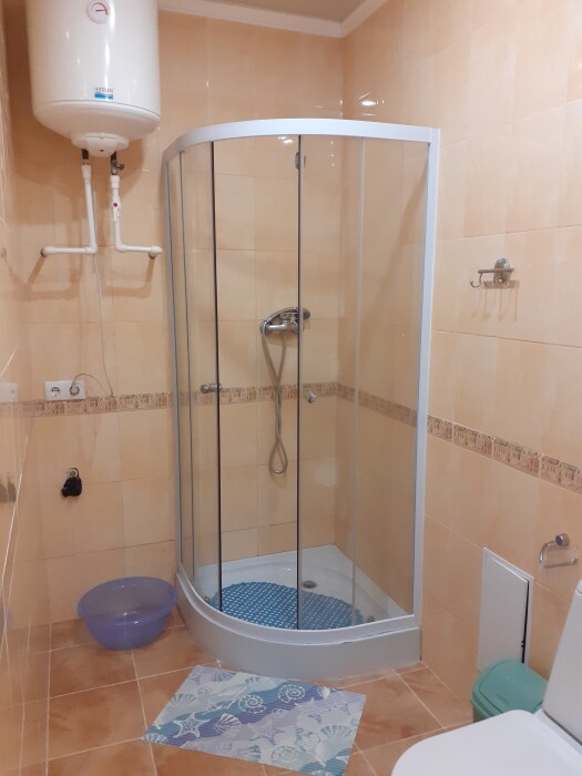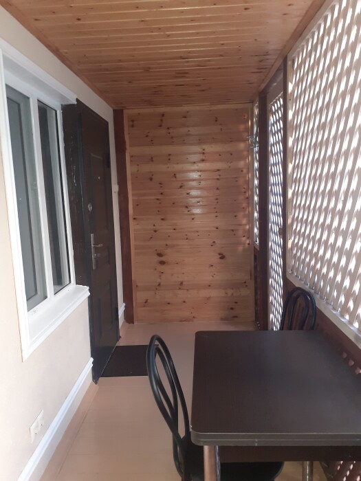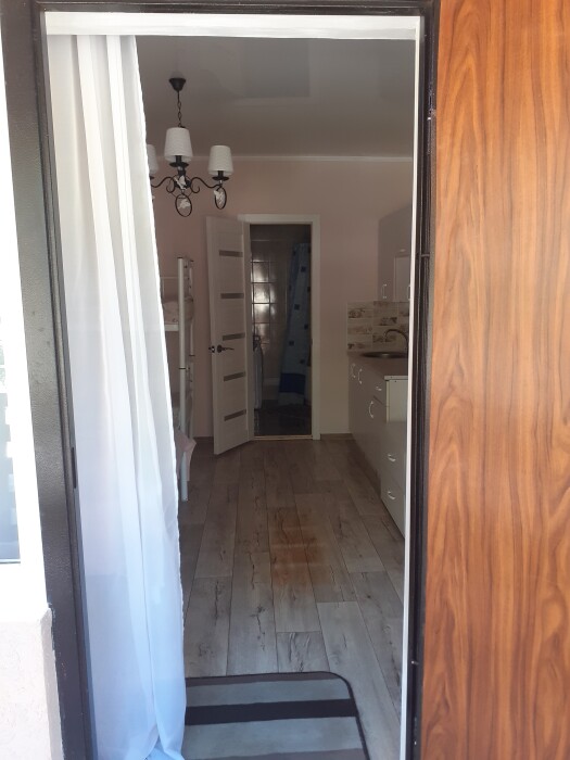 В номерах: раскладной диван+доп. место, необходимая мебель( шкаф, комод, стол, стулья), маленькая кухня, душевая комната с туалетом, холодильник, кондиционер, интернет, TV кабельное, вся необходимая посуда. Апартаменты трёхместные. До моря 50 метров