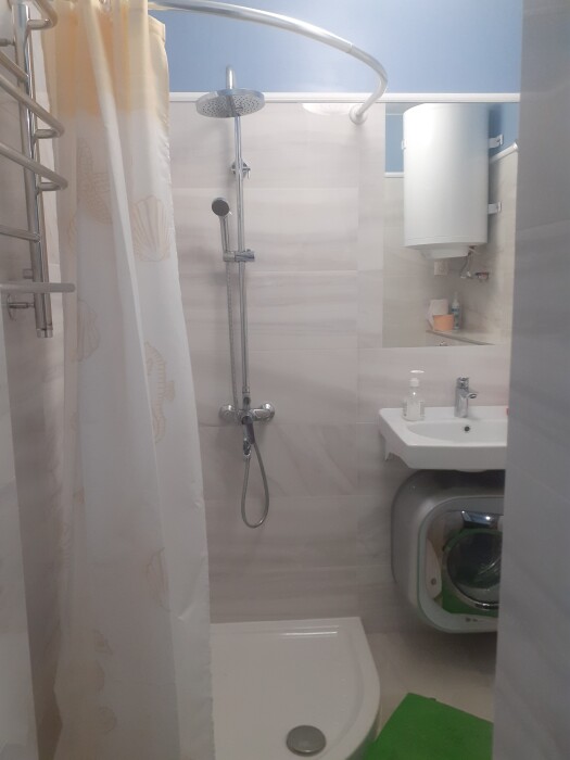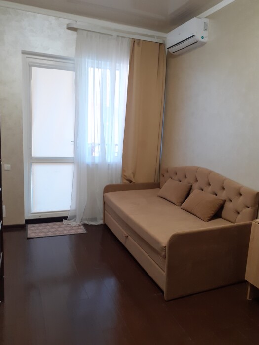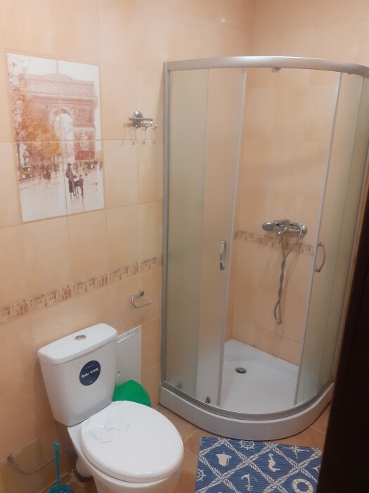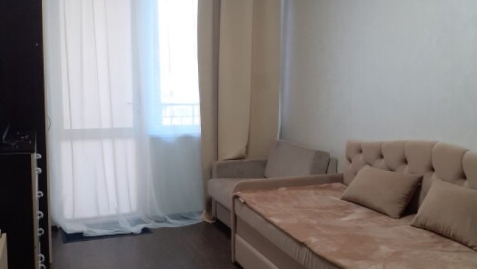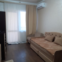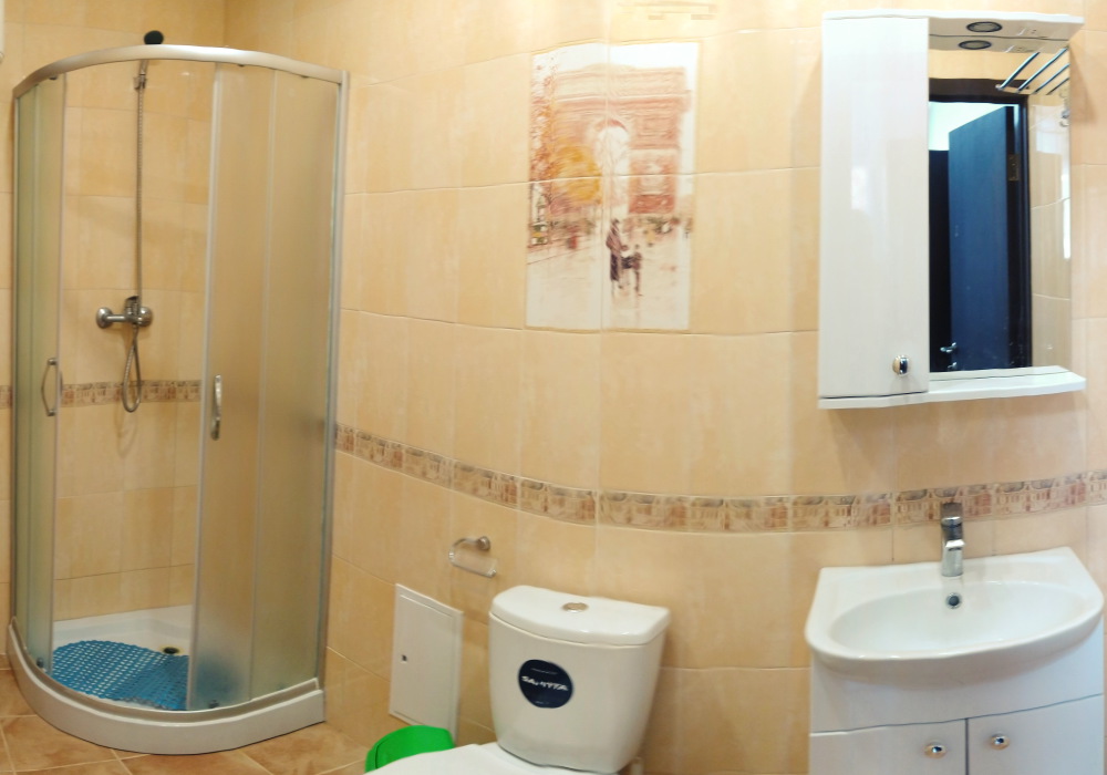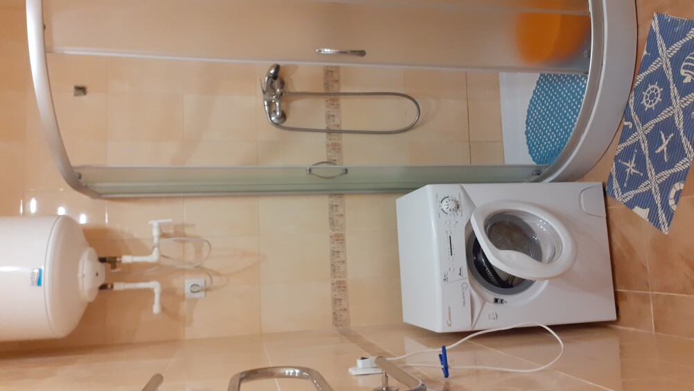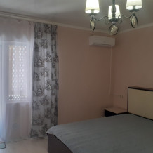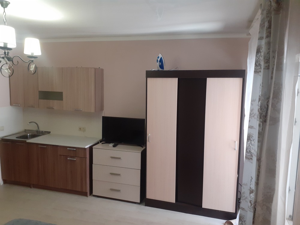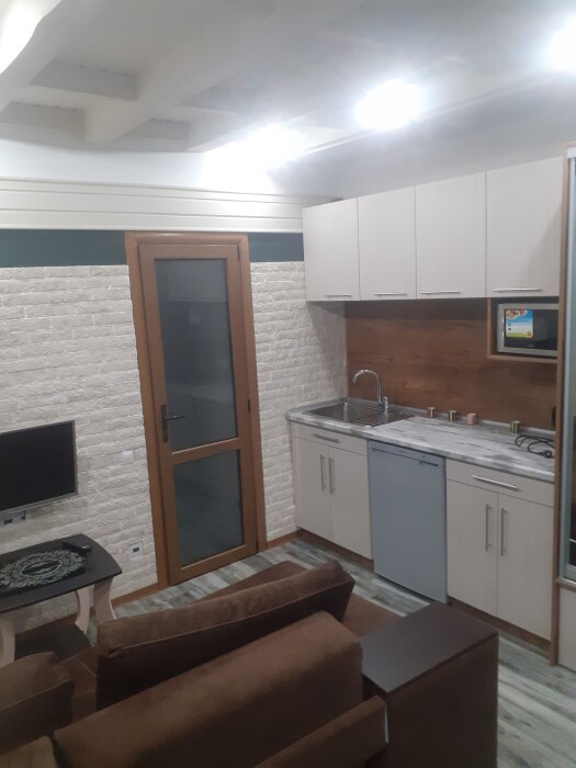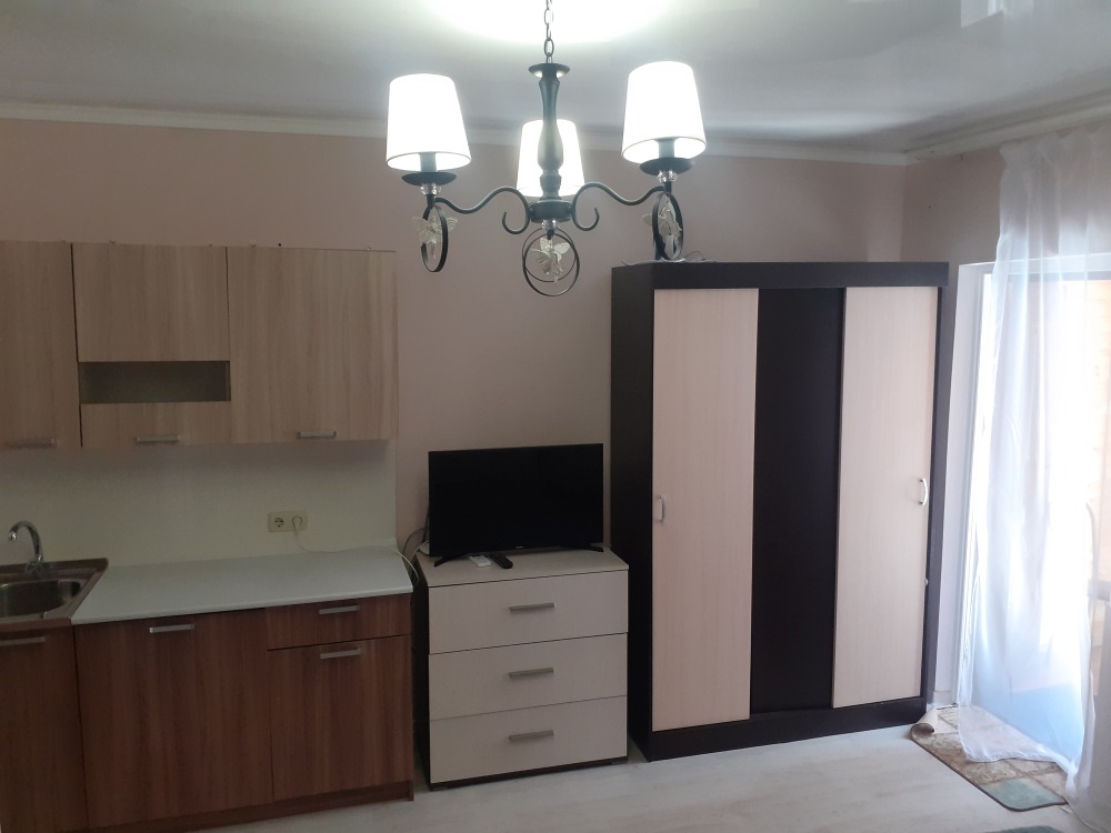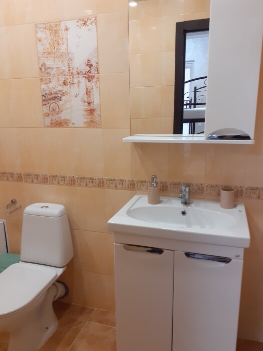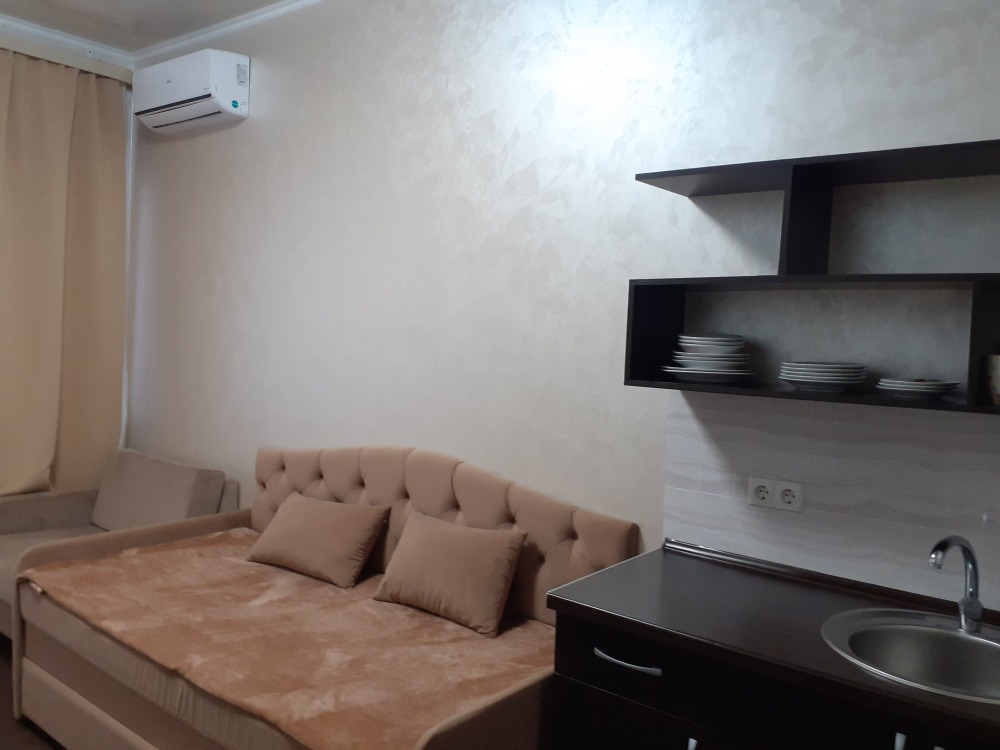 В номерах: раскладной диван+доп. место, необходимая мебель( шкаф, комод, стол, стулья), маленькая кухня, душевая комната с туалетом, холодильник, кондиционер, интернет, TV кабельное, вся необходимая посуда. Апартаменты трёхместные. До моря 50 метров