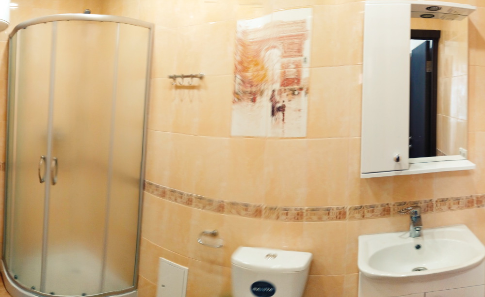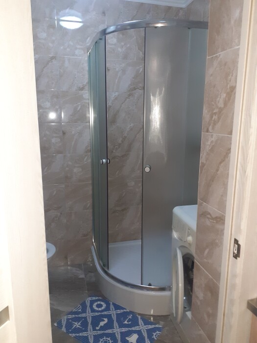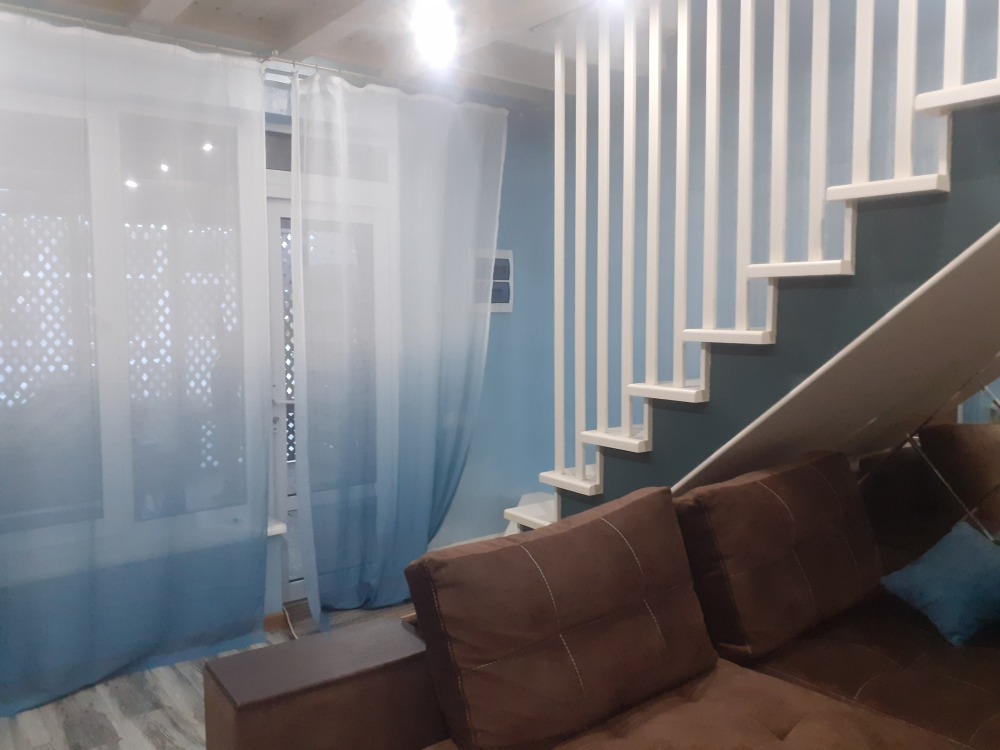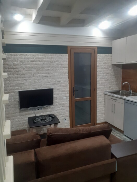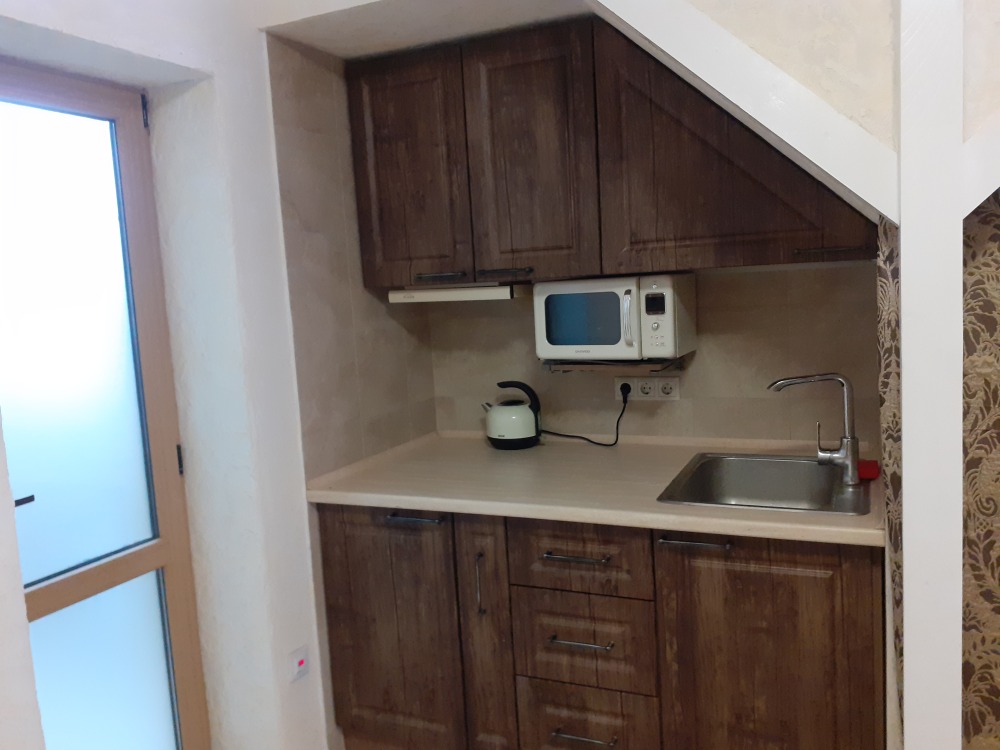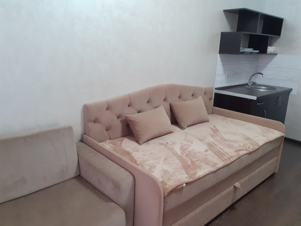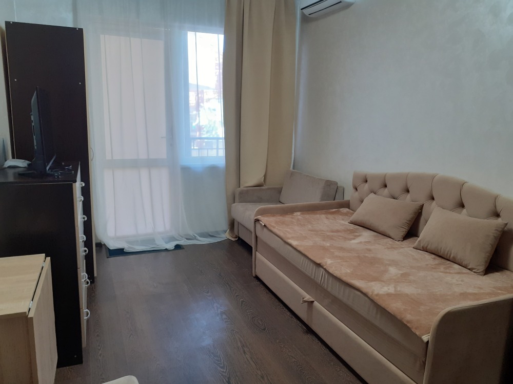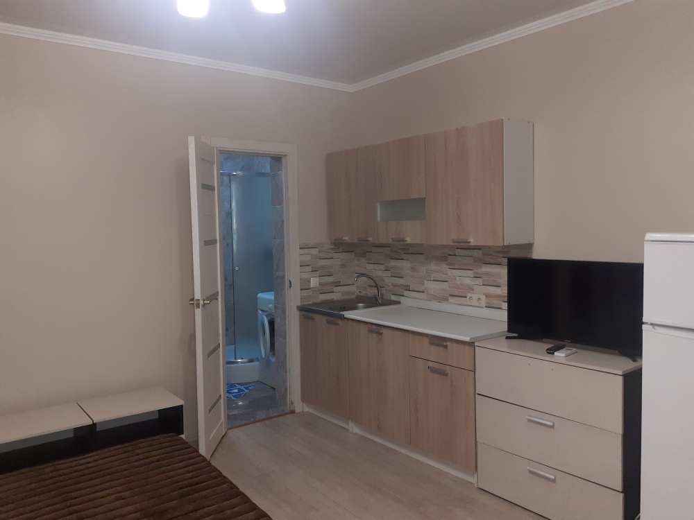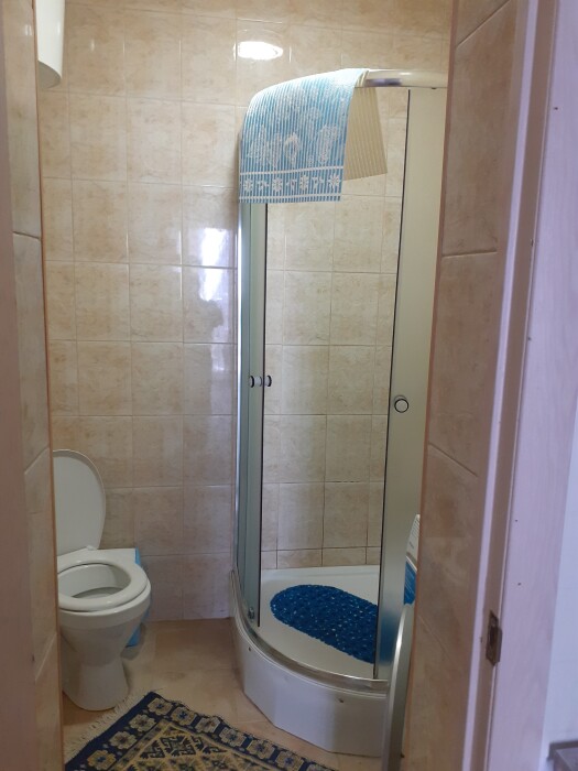 В номерах: раскладной диван+доп. место, необходимая мебель( шкаф, комод, стол, стулья), маленькая кухня, душевая комната с туалетом, холодильник, кондиционер, интернет, TV кабельное, вся необходимая посуда. Апартаменты трёхместные. До моря 50 метров