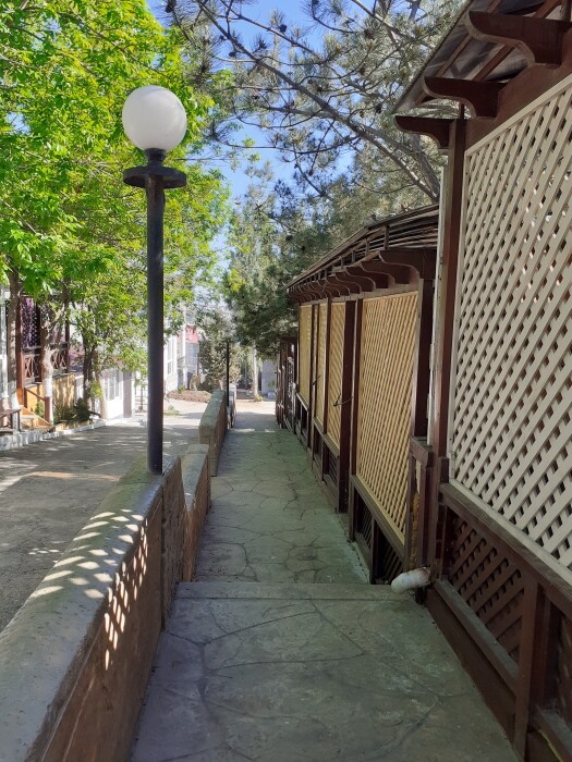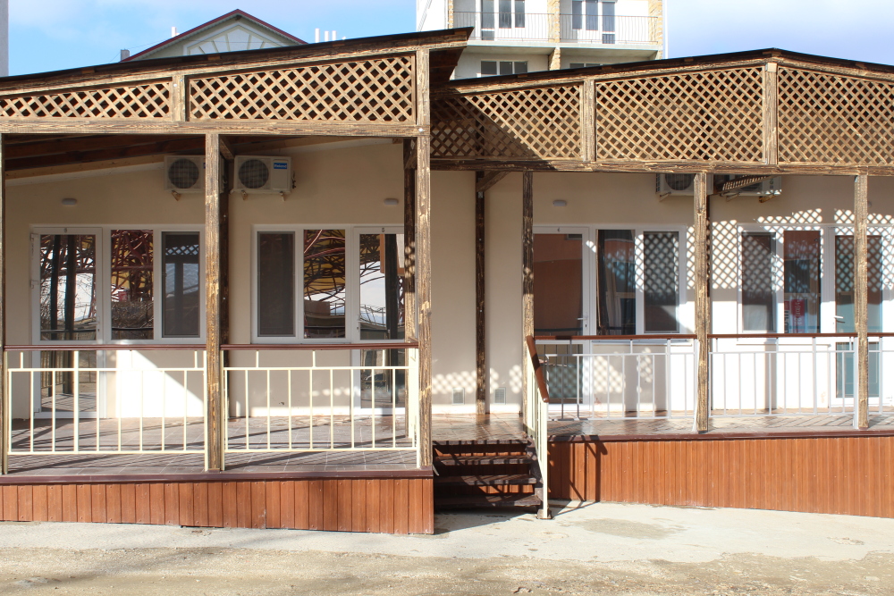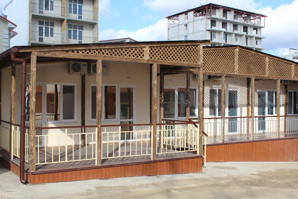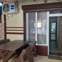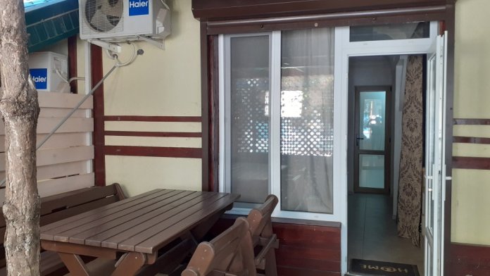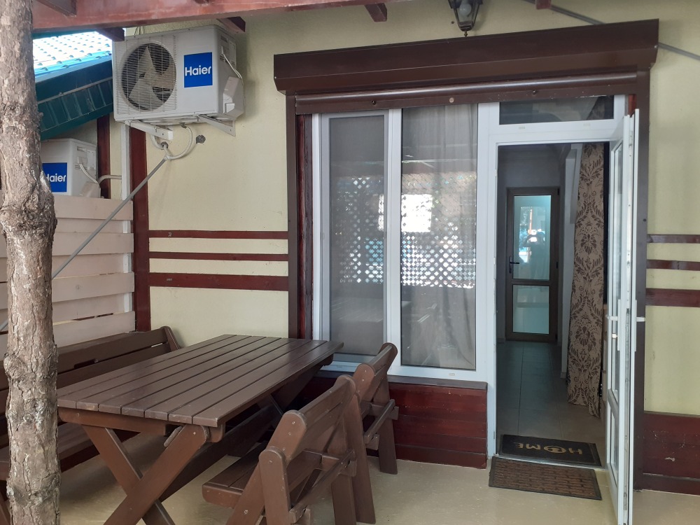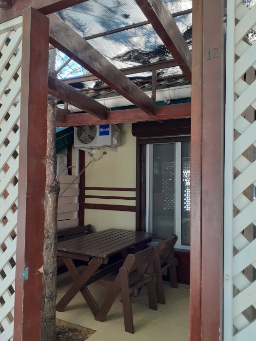 Апартаменты с беседками. В номерах: двухспальная и двухъярусная кровати. Вся необходимая мебель( шкаф, комод, стол, стулья). Небольшая кухня, душевая комната с туалетом, холодильник, кондиционер,TV, интернет. До моря 5 минут пешком